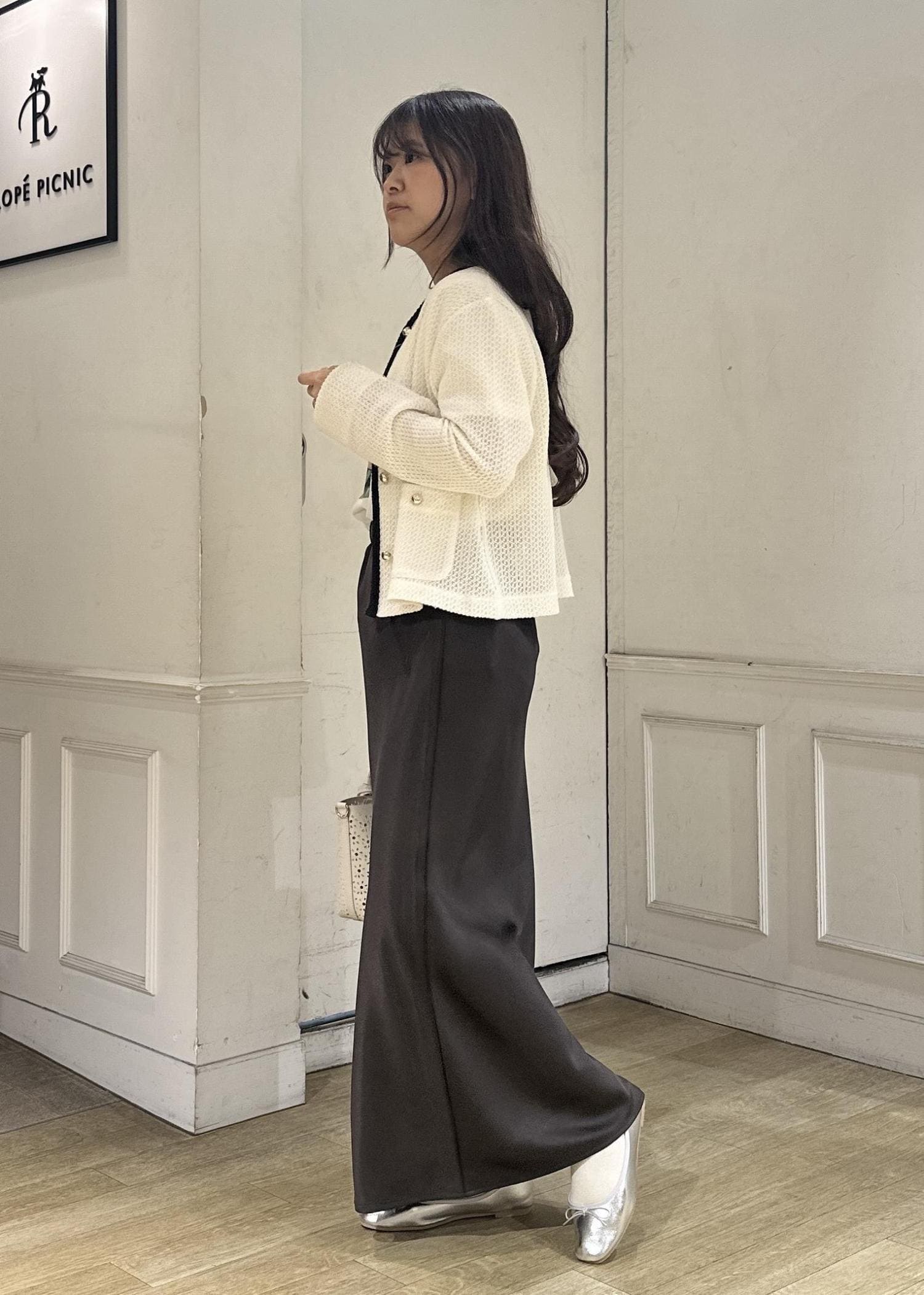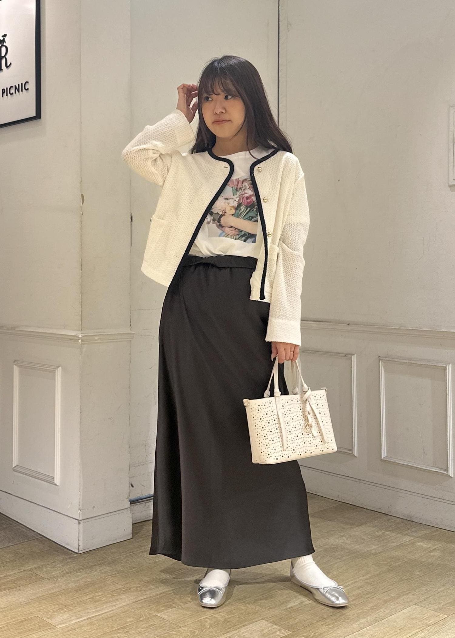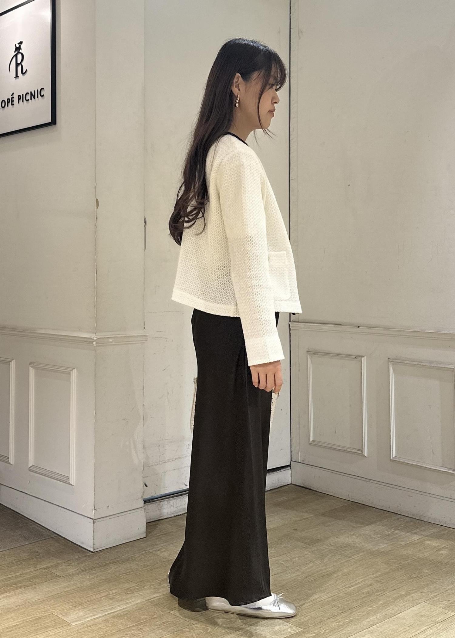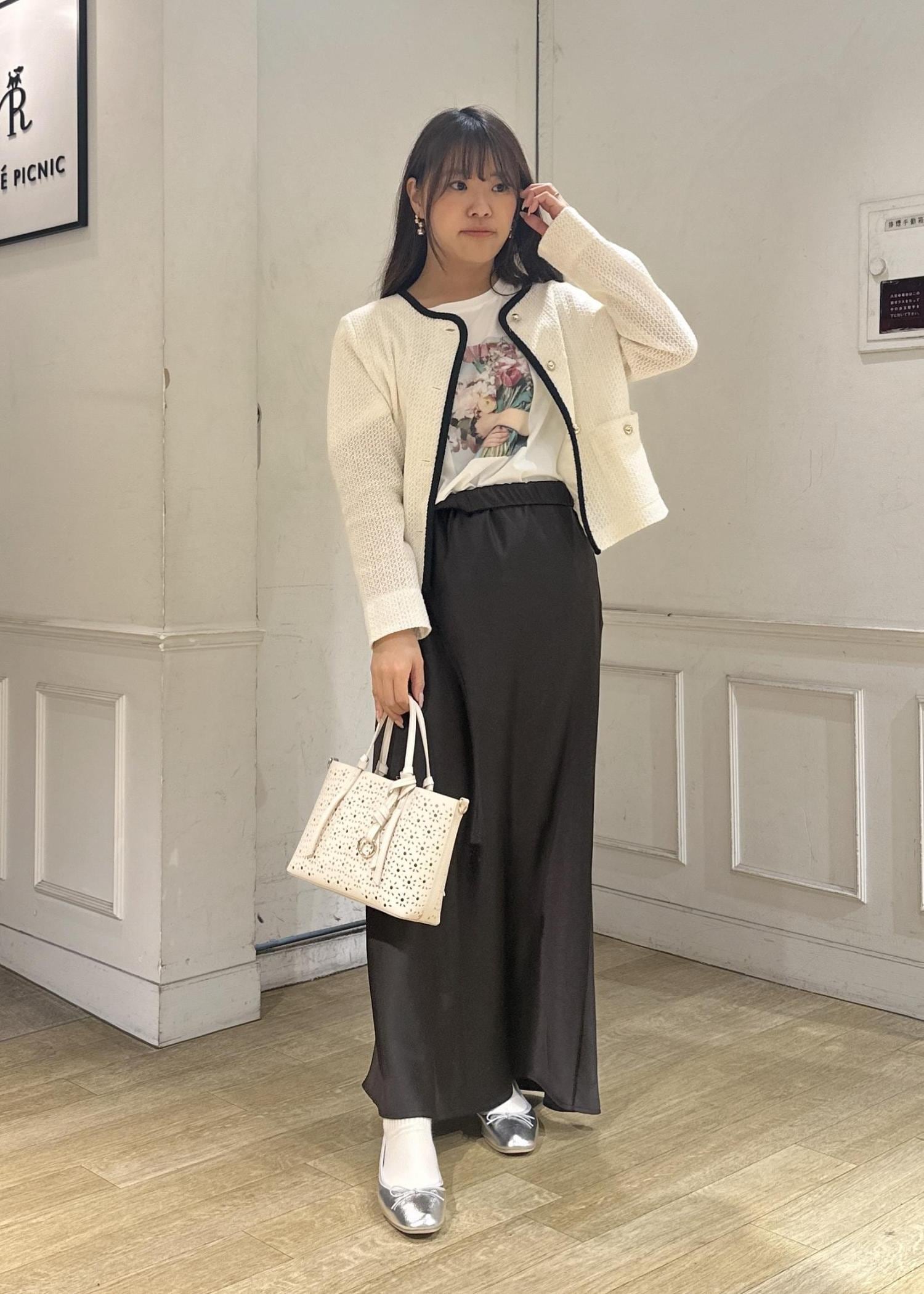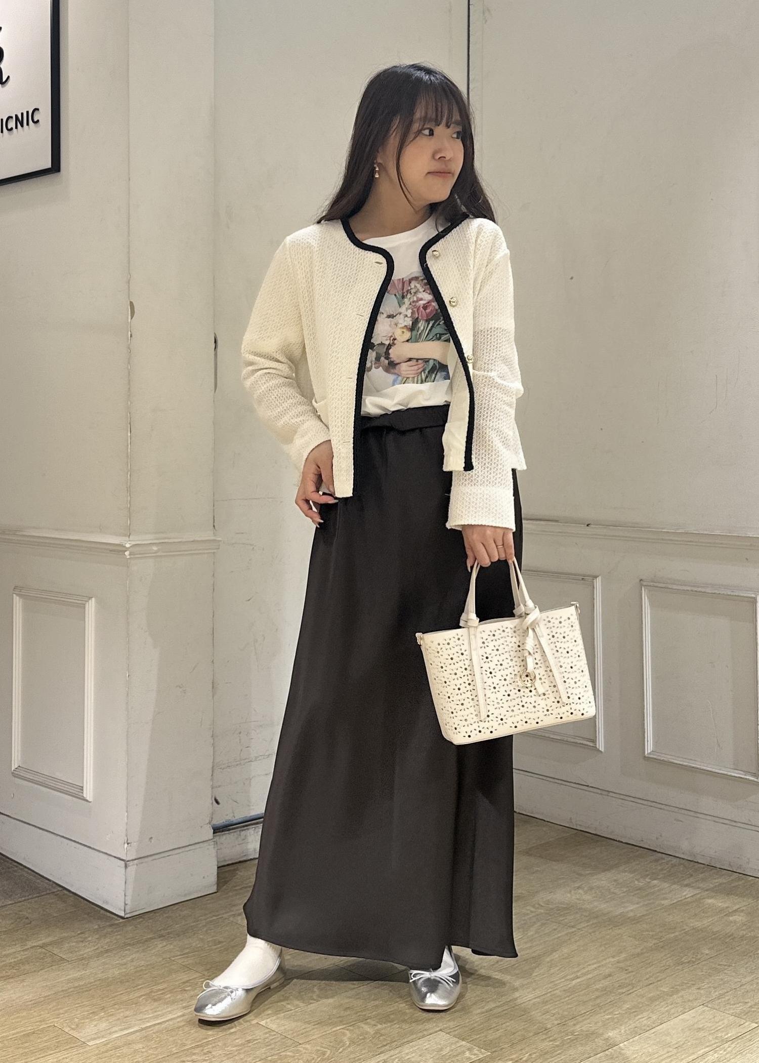 今年の春はブラウンがトレンドカラーとして沢山展開があるのでスカートは揺れ感が可愛いサテンスカートをチョイス。