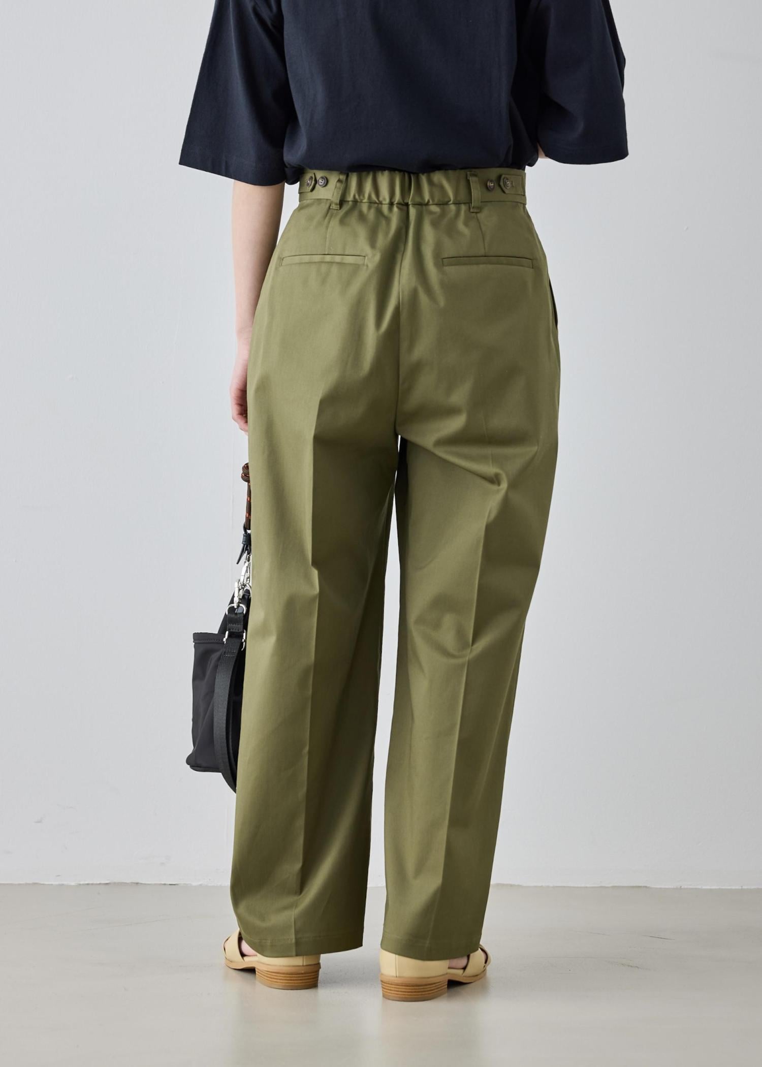 ウエストサイドのボタンベルトを詰めて、ウエストの調整が可能です。