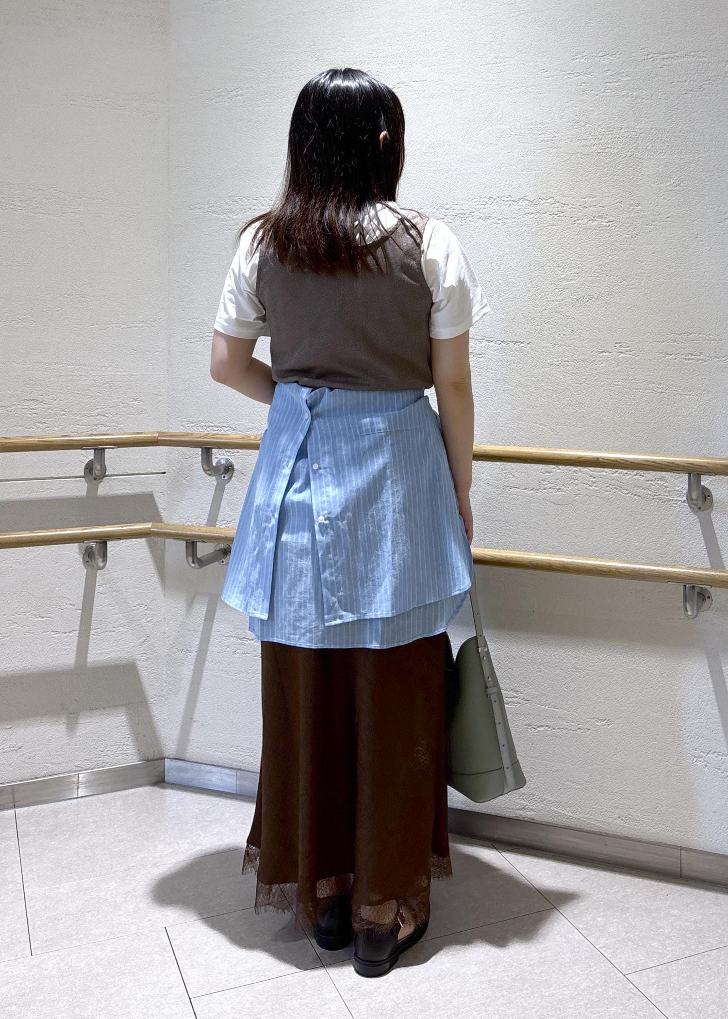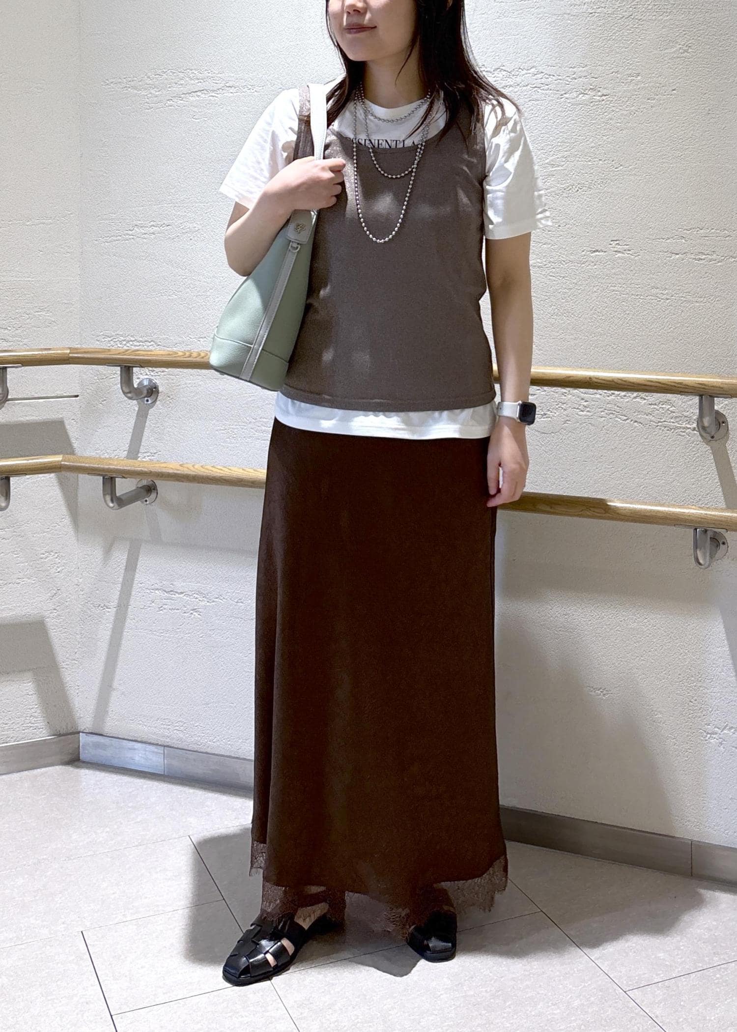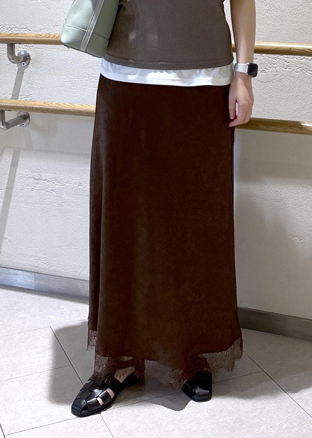 ROPÉ PICNIC裾レースロングスカートブラウン / F¥6,490レビュー身体のラインを拾いにくく、骨格ウェーブさんも安心して履けるサテンスカート。