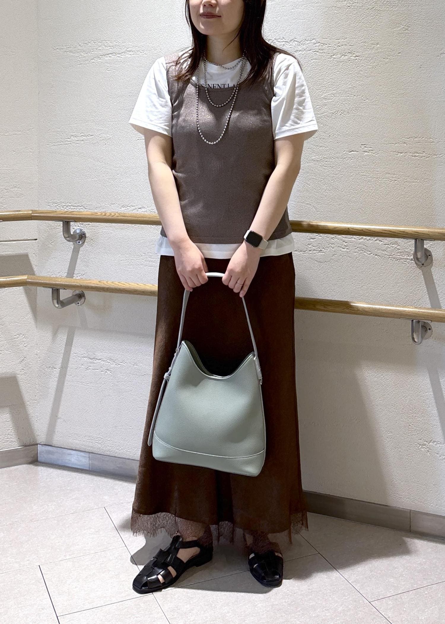 綺麗目になりがちなサテンスカートですが、Tシャツやグルカサンダルなどのカジュアルアイテムと合わせれば、カチッとなりすぎず、ラフな印象に。
