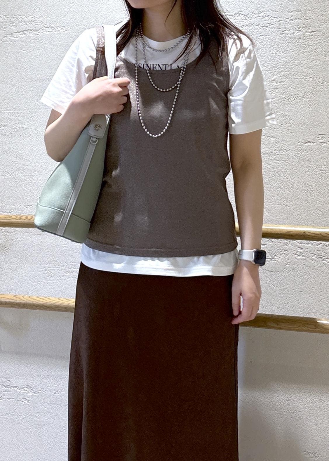 タンクトップとTシャツを合わせたレイヤードスタイル。