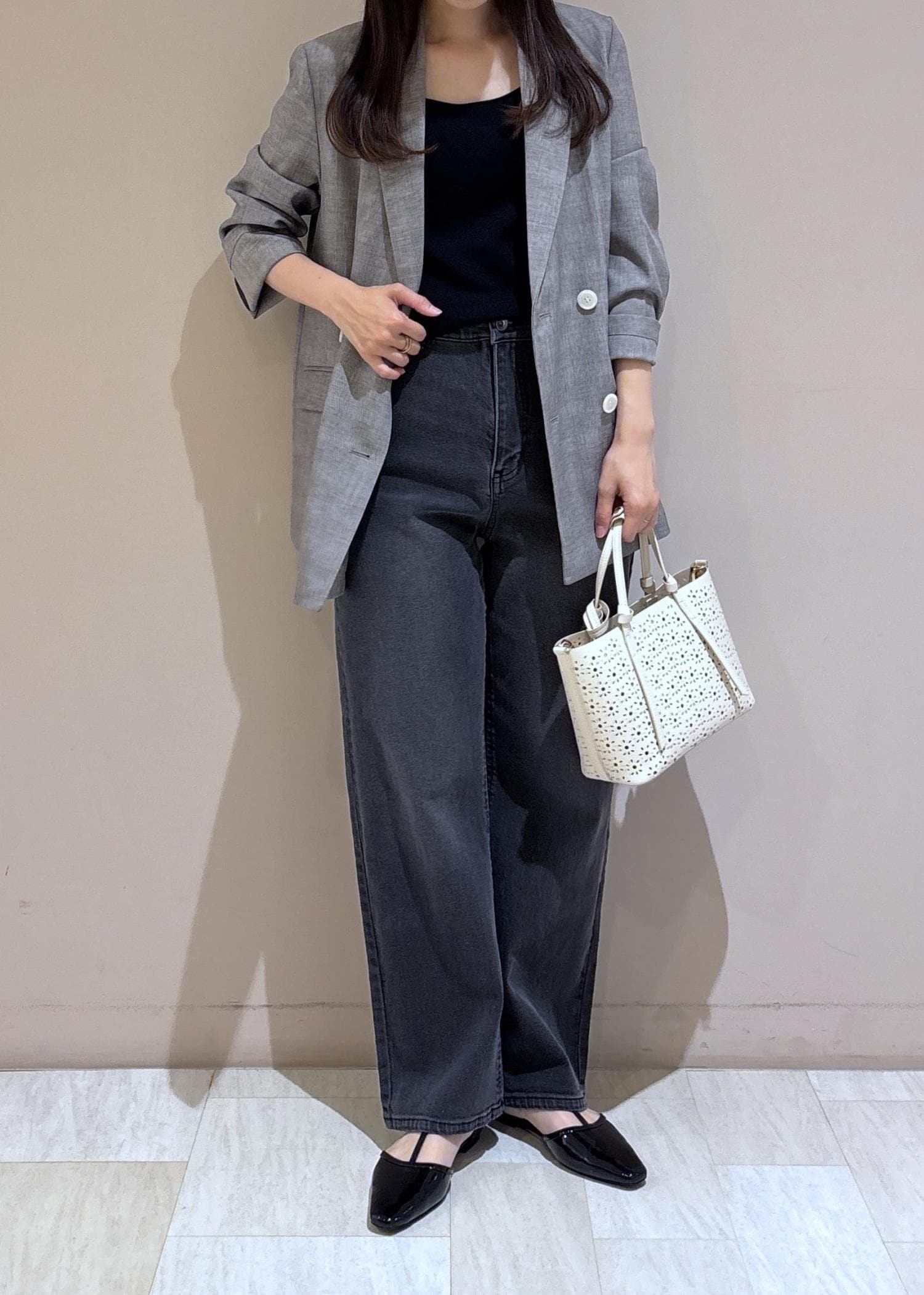 ヒップが隠れる着丈で腰まわりをカバーできスッキリした印象で着られます。 -