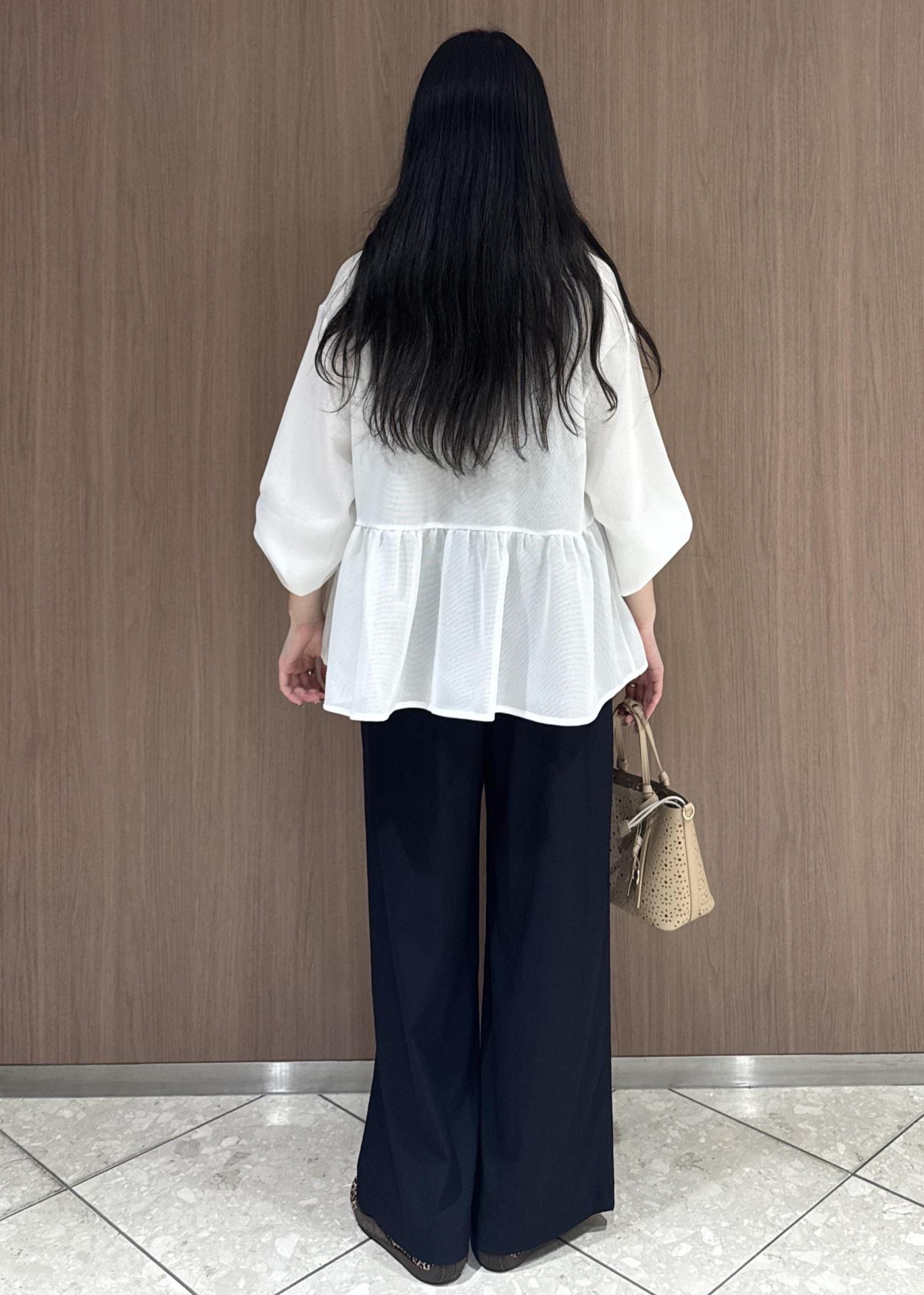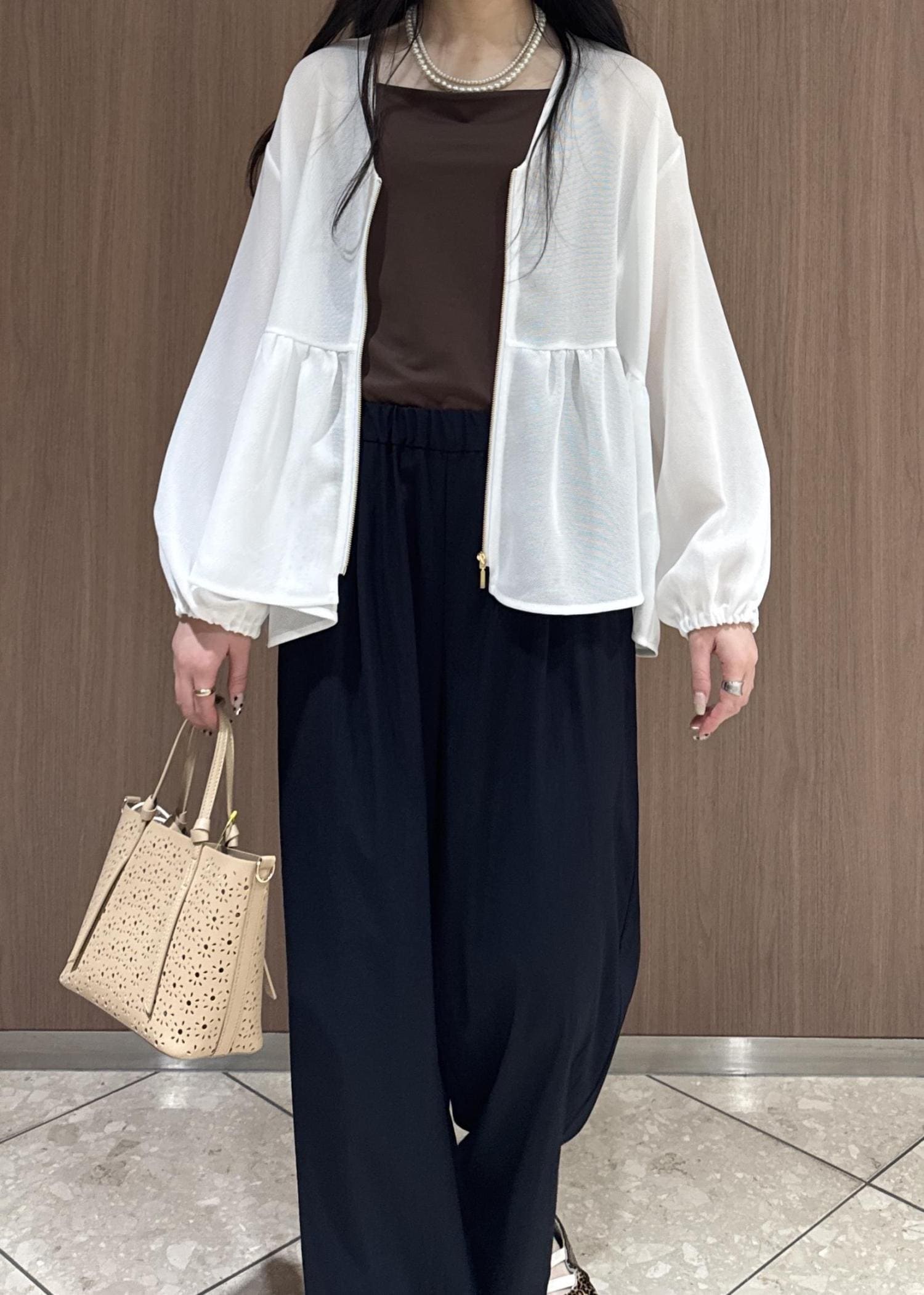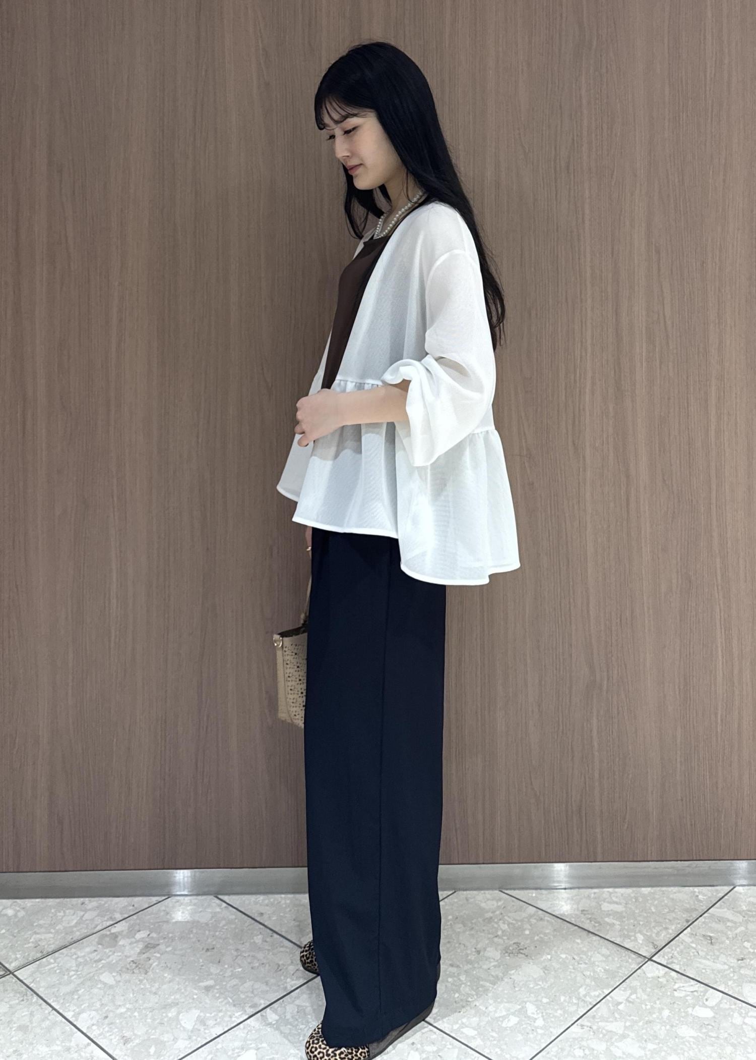 メッシュペプラムブルゾンで女性らしく、イージーパンツでボトムスはカジュアルにしてみました。
