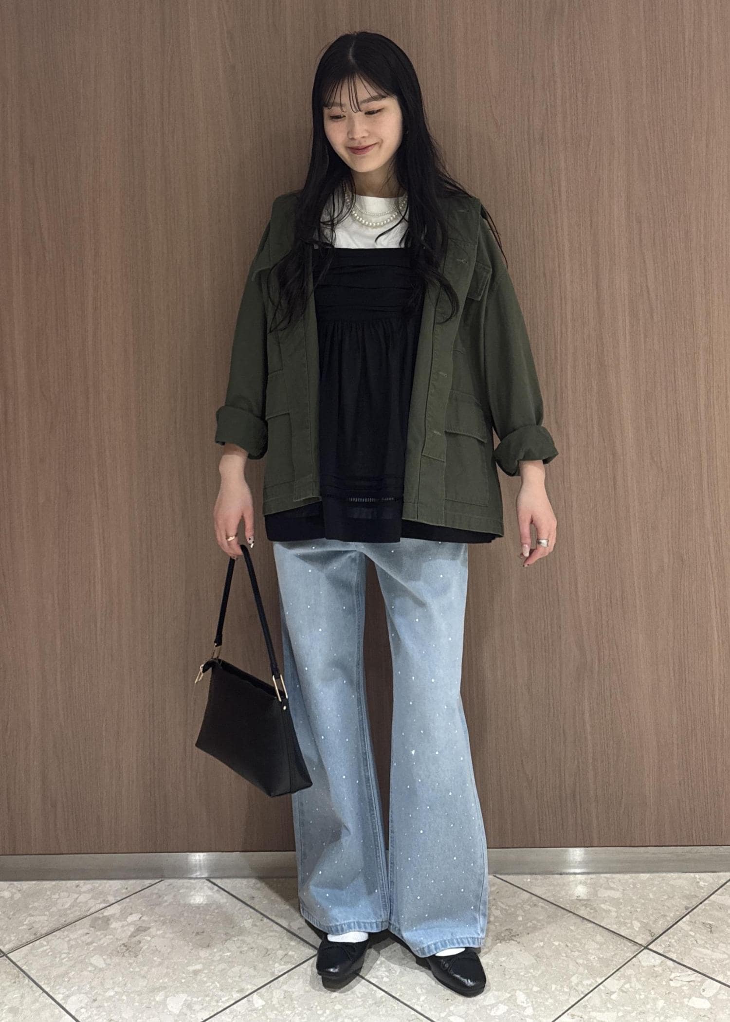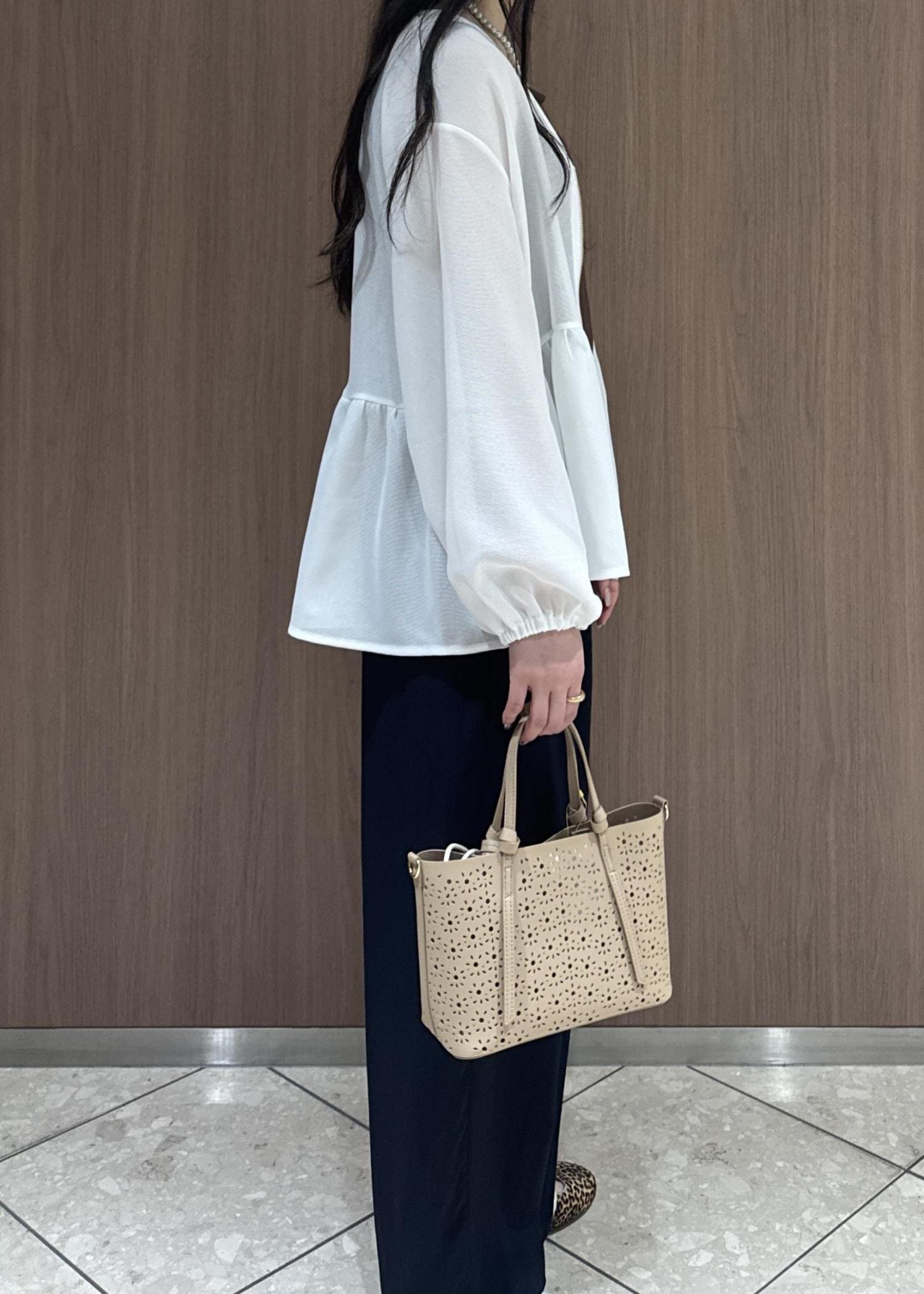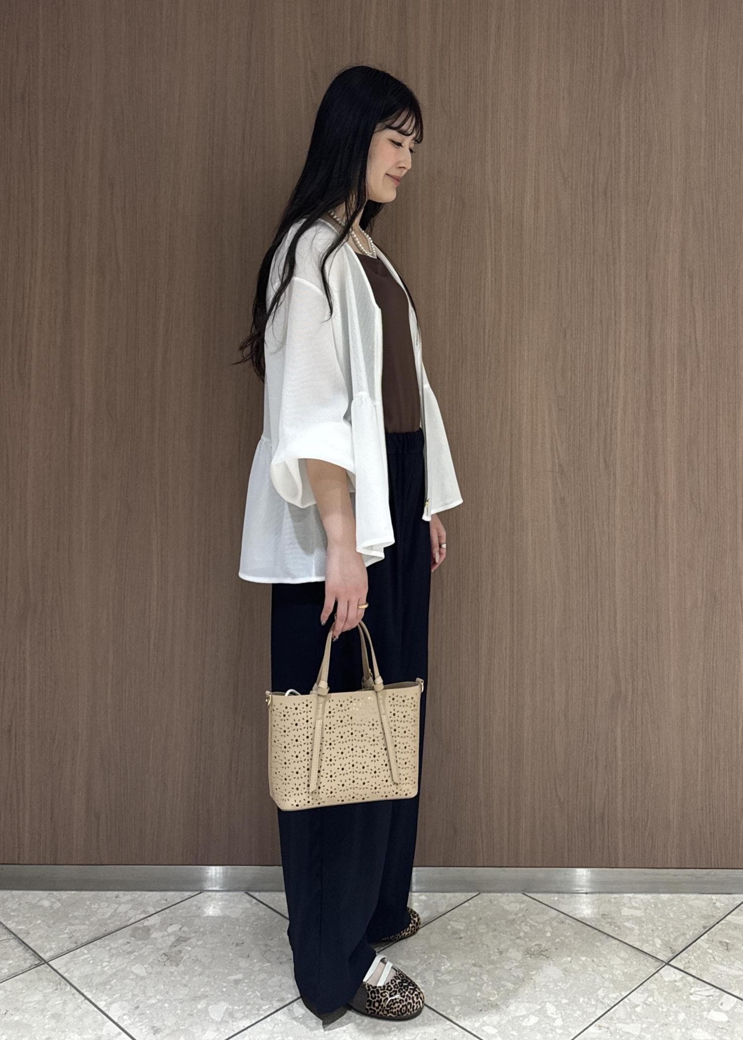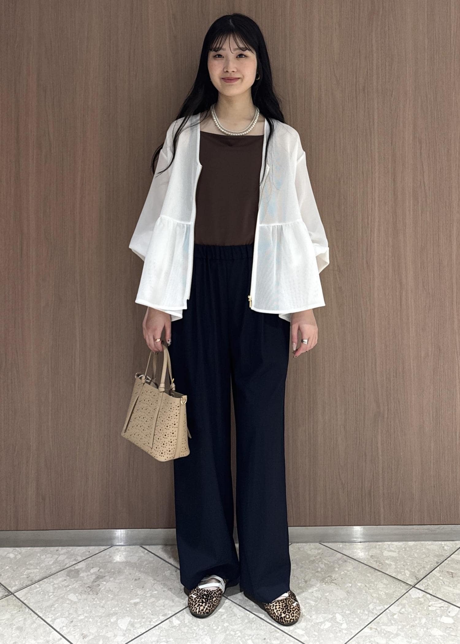メッシュペプラムブルゾンで女性らしく、イージーパンツでボトムスはカジュアルにしてみました。