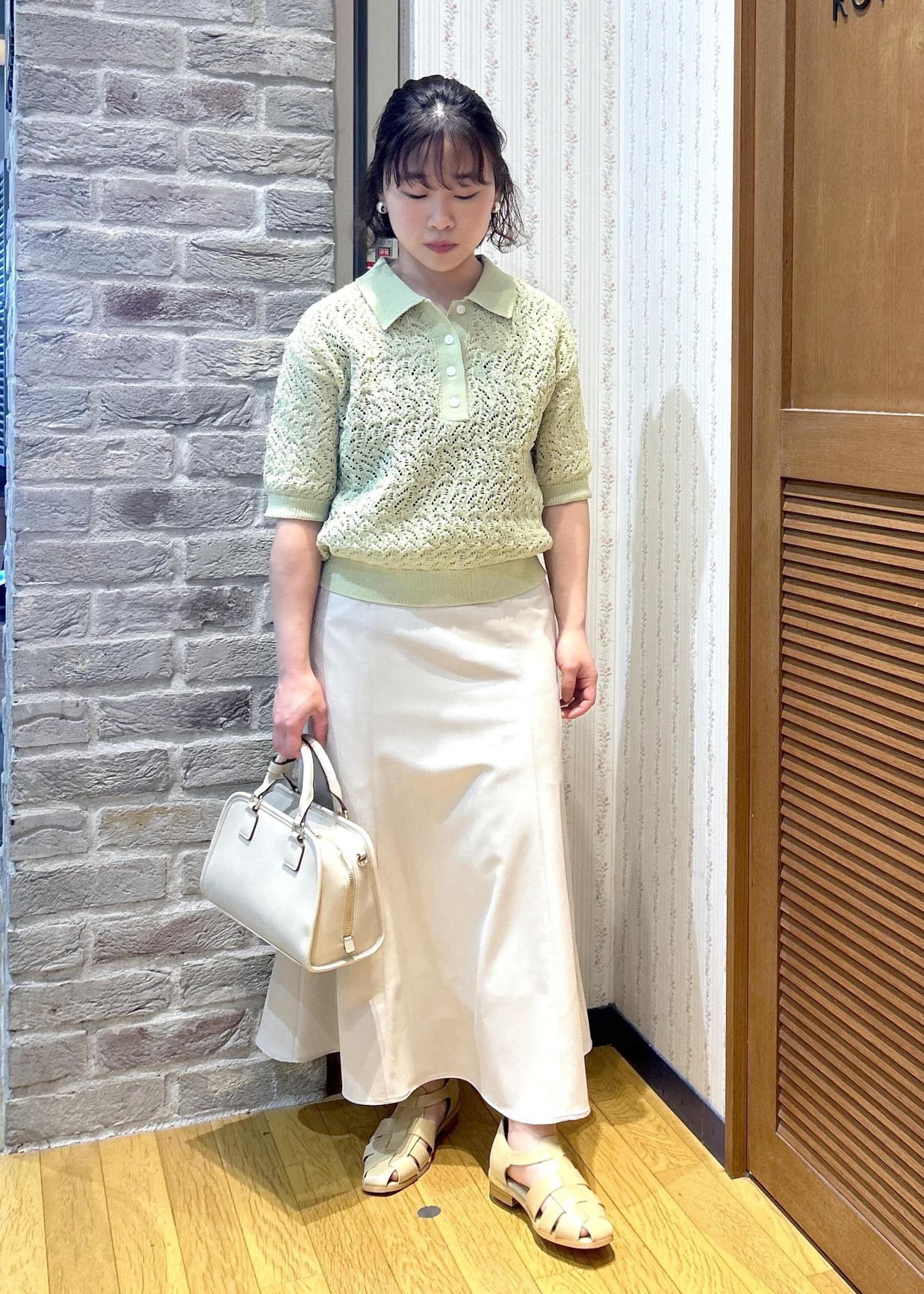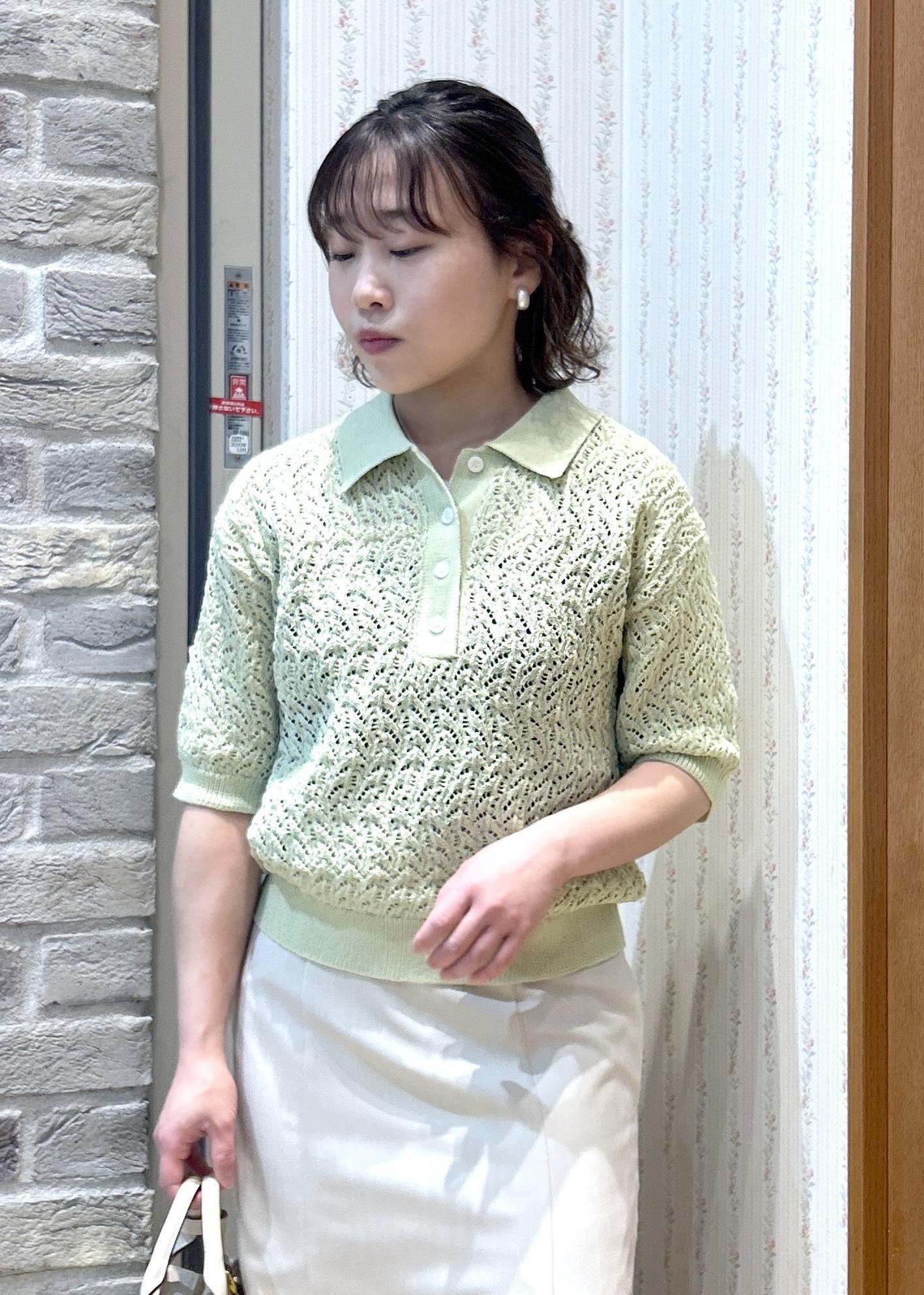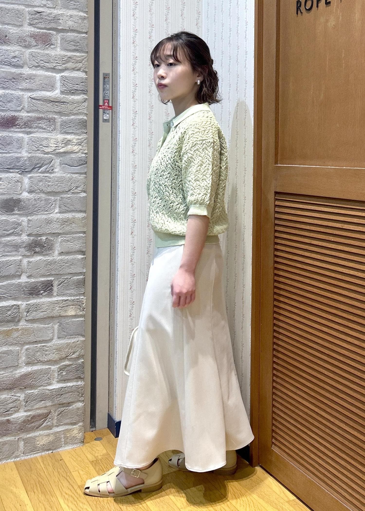 ROPÉ PICNICレースポロニットキミドリ / F¥5,995レビューサイズ感は程よくゆとりがあり、袖丈はひじが隠れるくらいです。ハリ感のあるしっかりした生地で、透かし編みですが生地が伸びてきたりしなさそうな印象でした!スカート、パンツともに相性良く、着回ししやすいです。