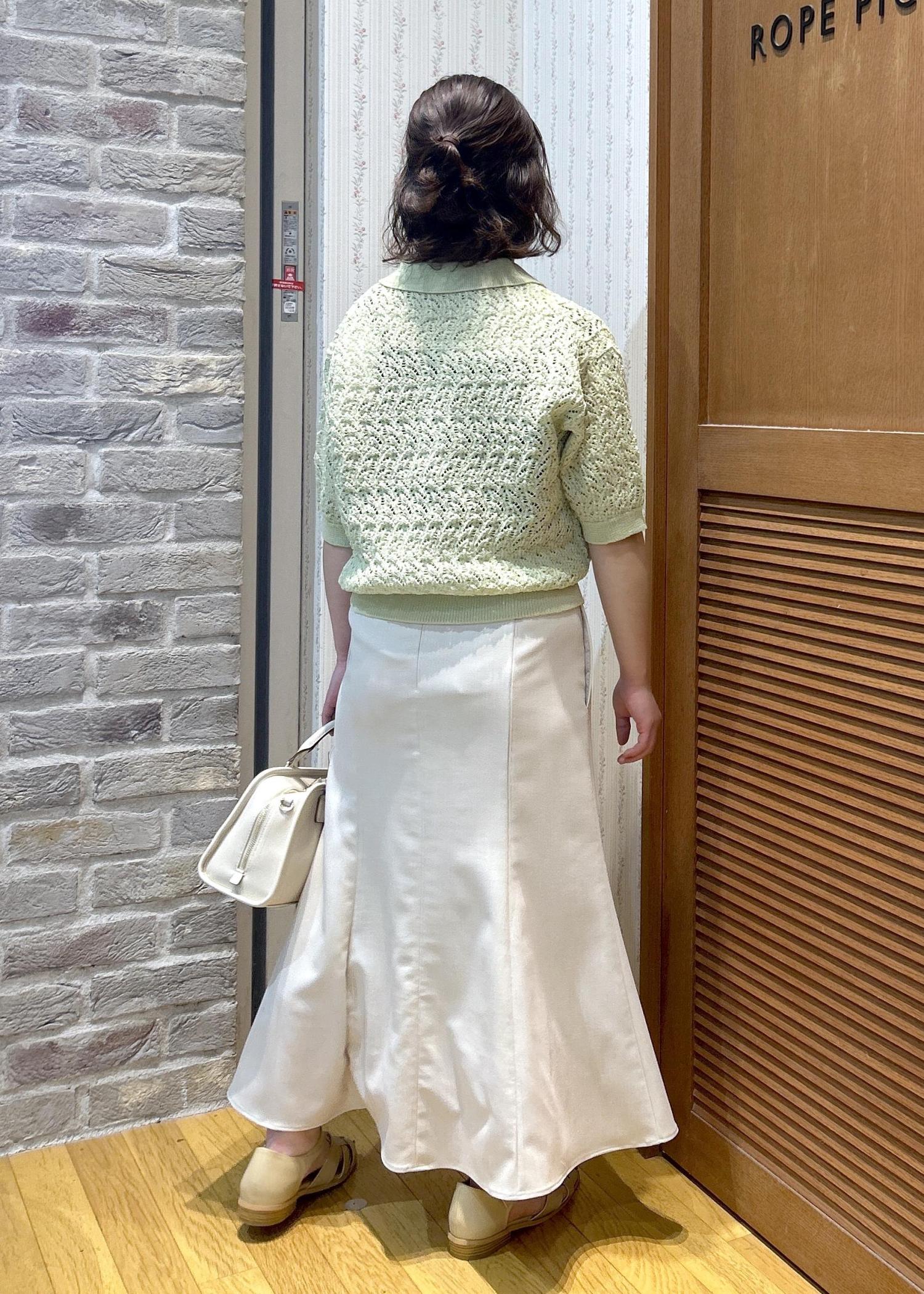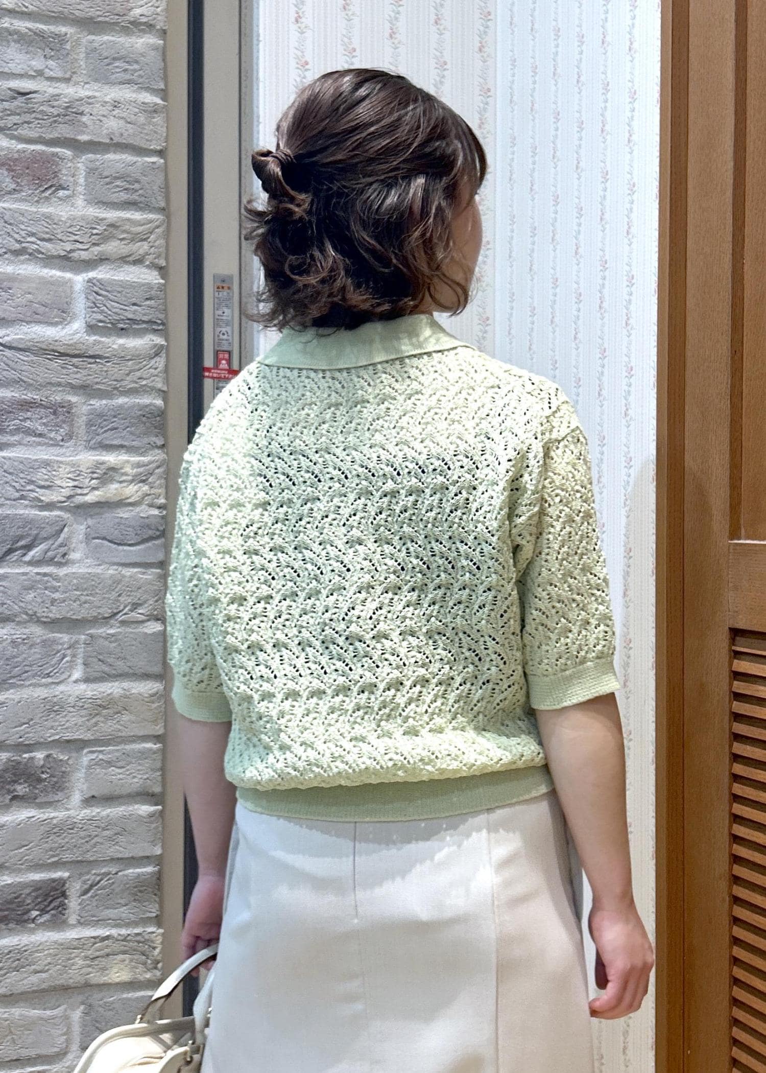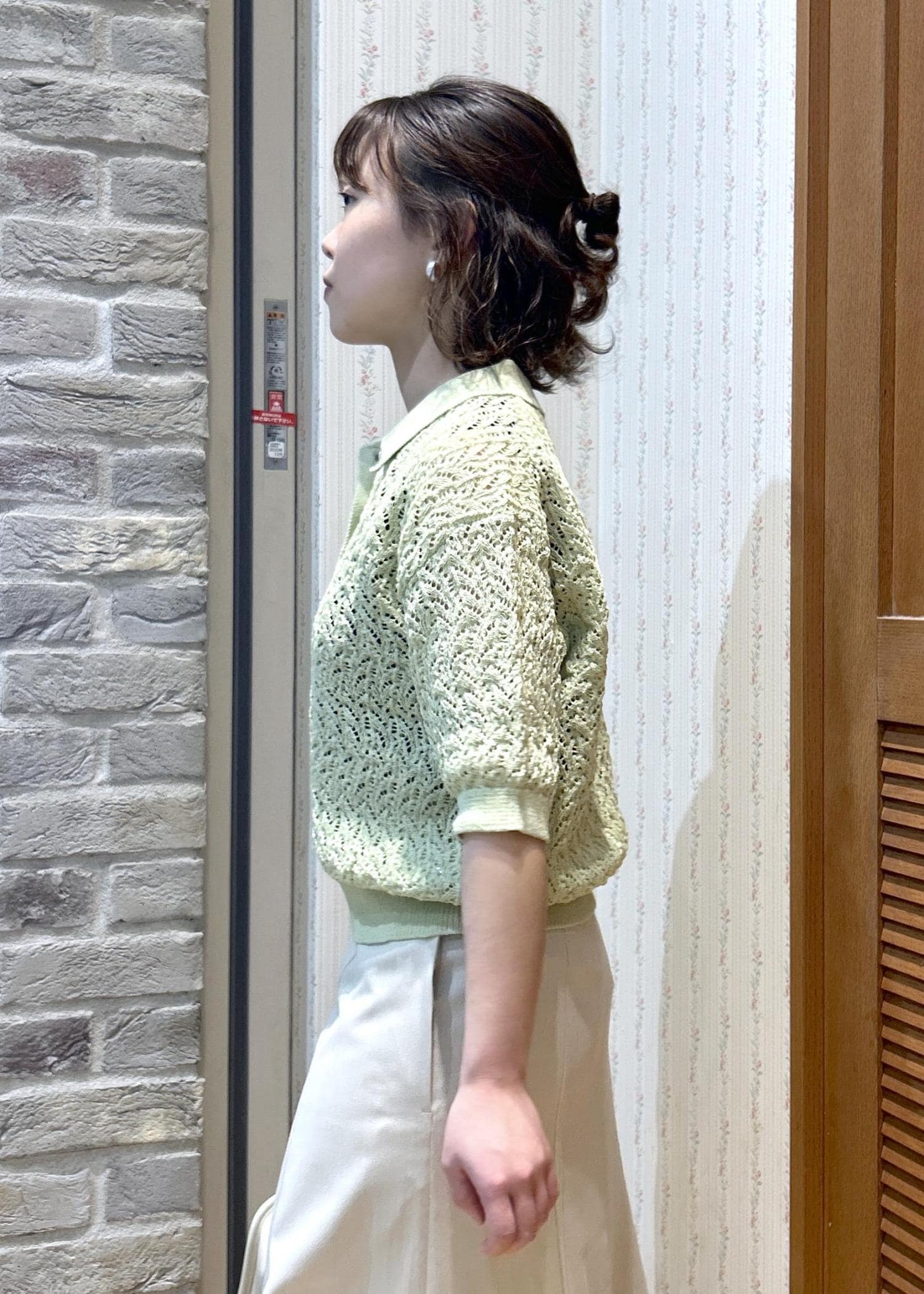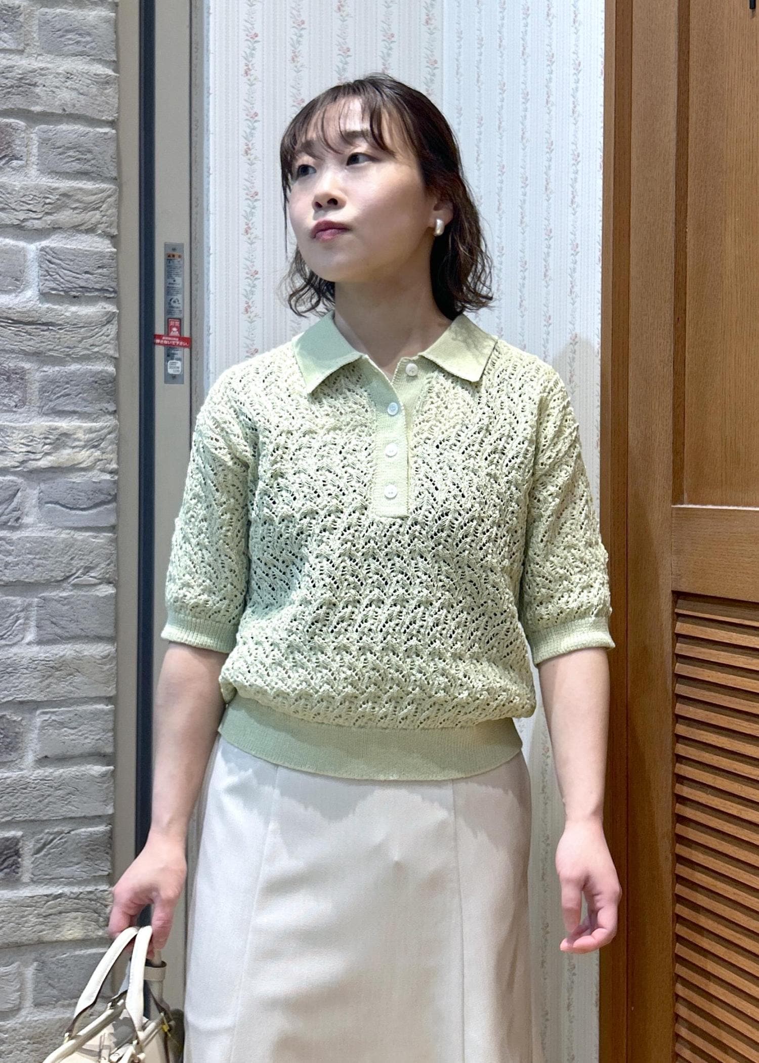 ROPÉ PICNICレースポロニットキミドリ / F¥5,995レビューサイズ感は程よくゆとりがあり、袖丈はひじが隠れるくらいです。ハリ感のあるしっかりした生地で、透かし編みですが生地が伸びてきたりしなさそうな印象でした!スカート、パンツともに相性良く、着回ししやすいです。