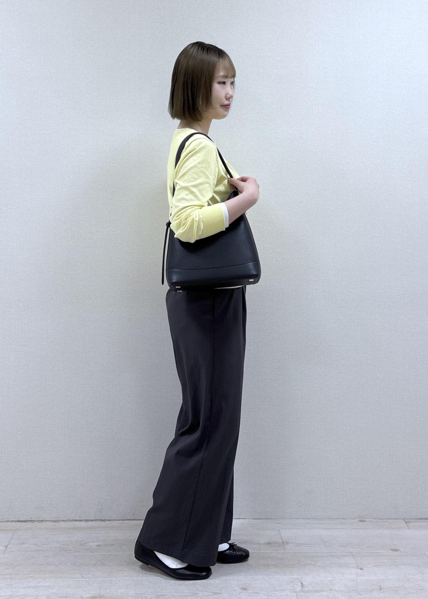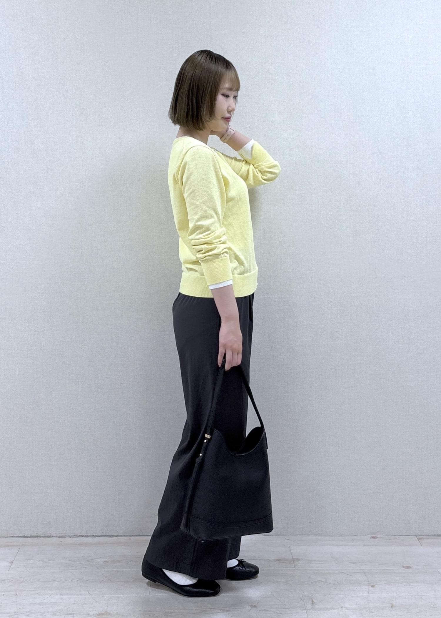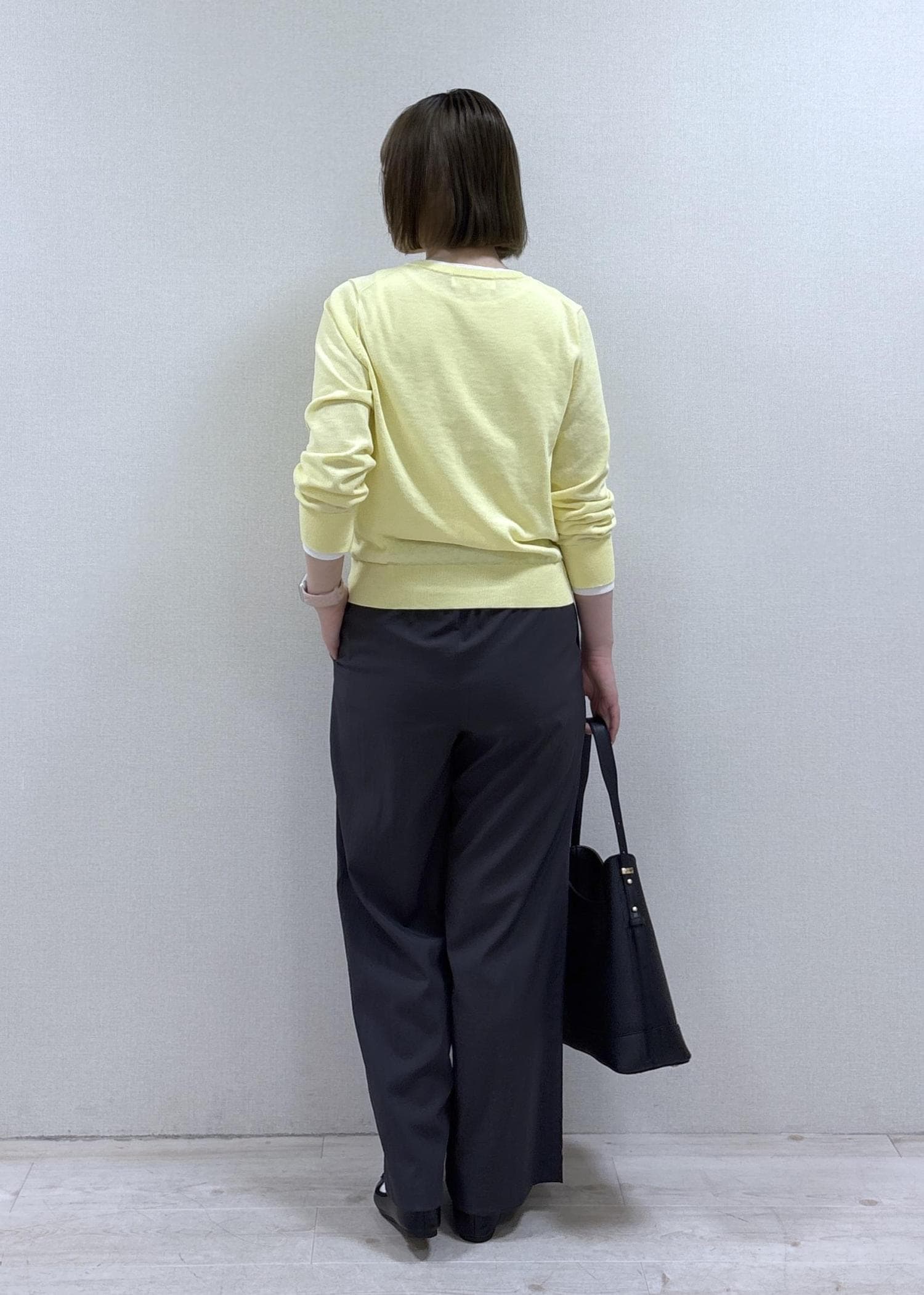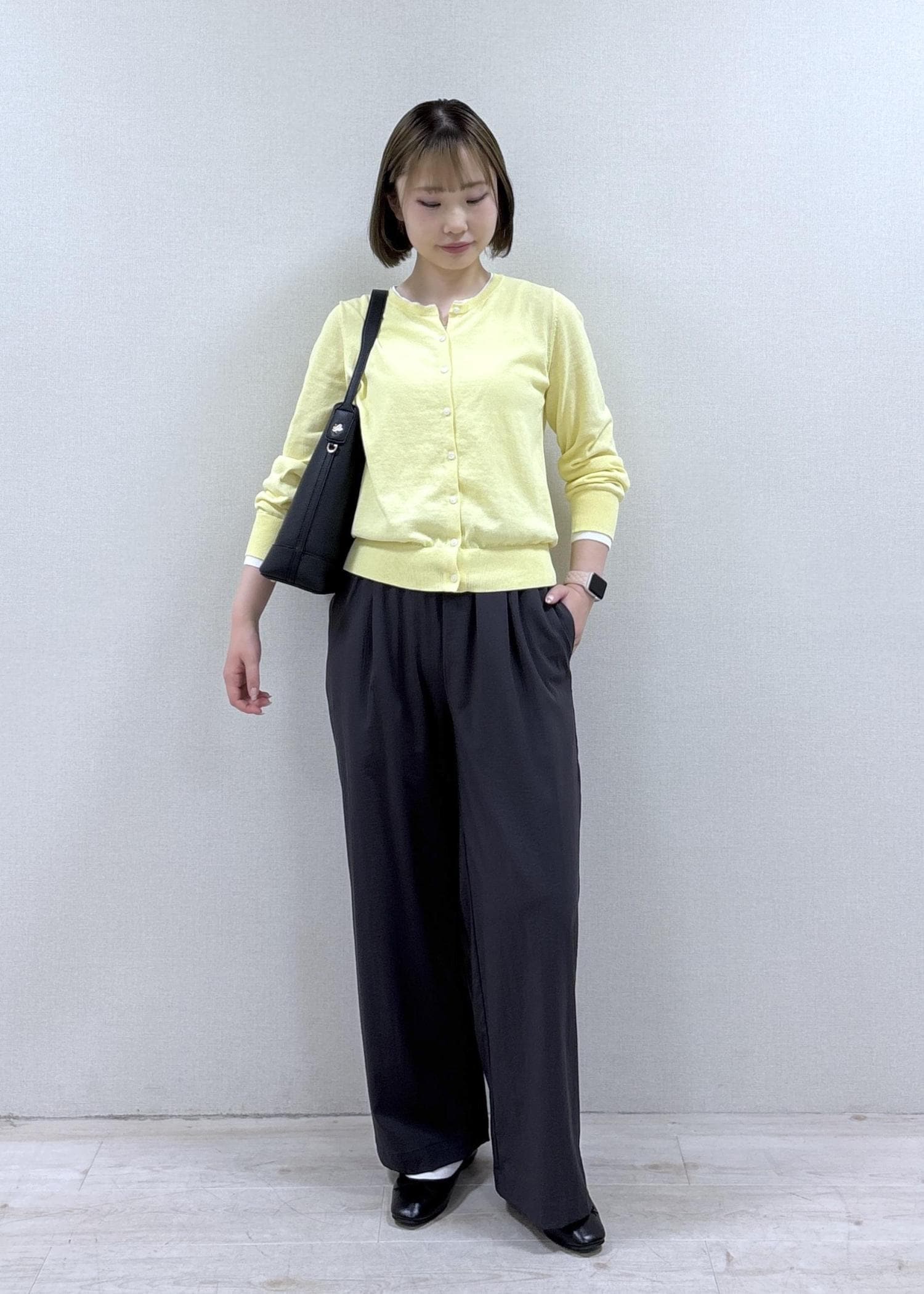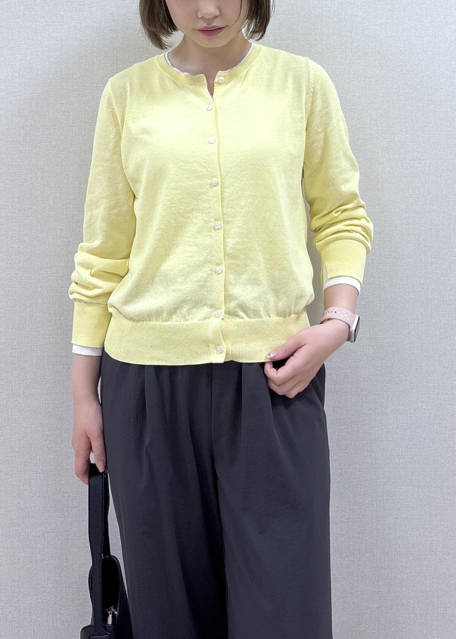 クリーム色のカーディガンがカラーアクセントになったリラックススタイルです。