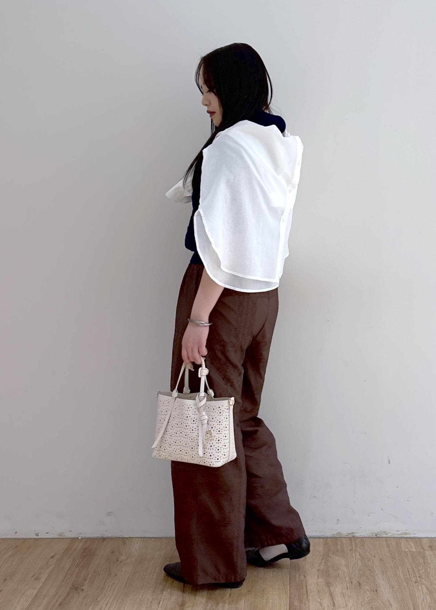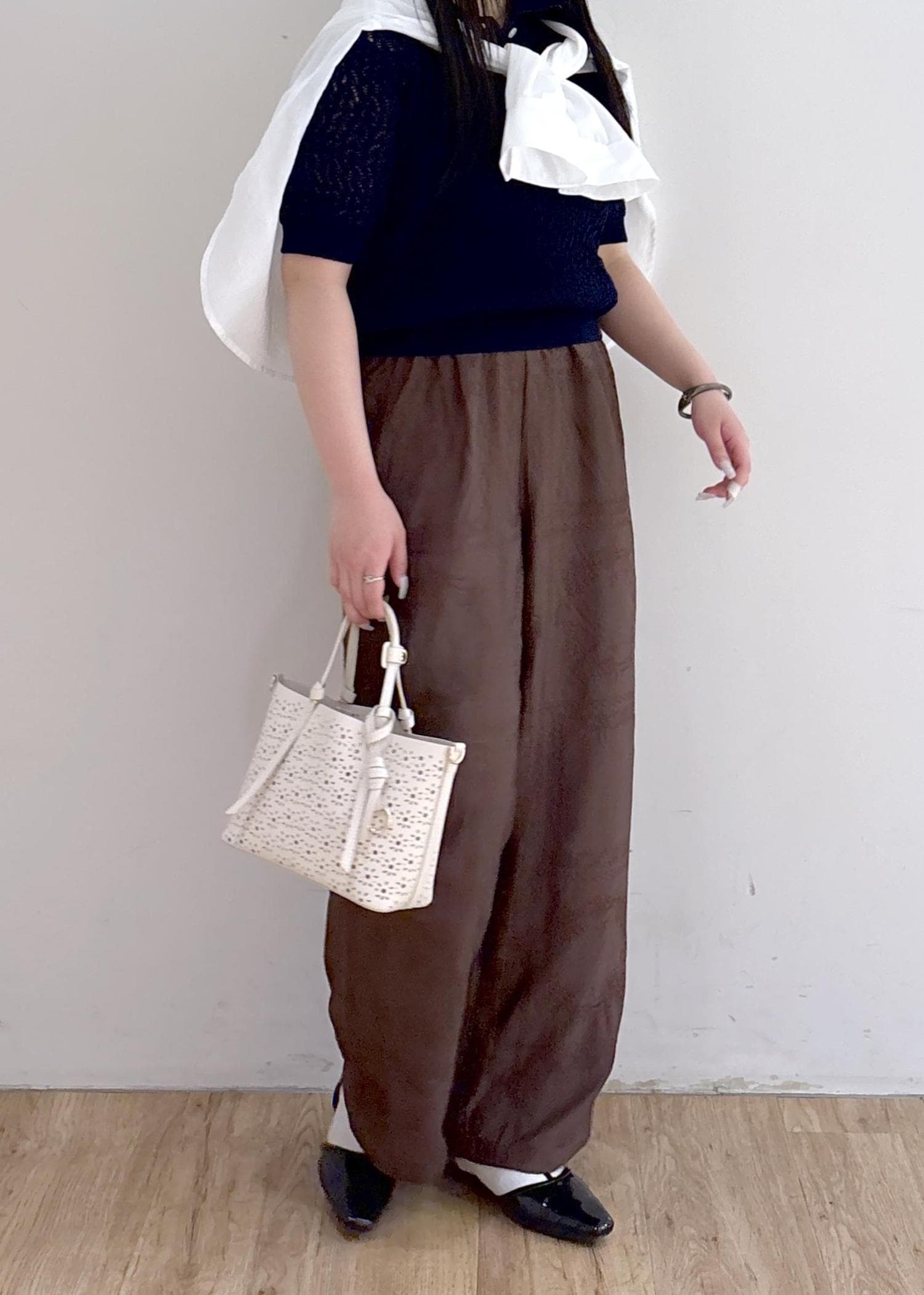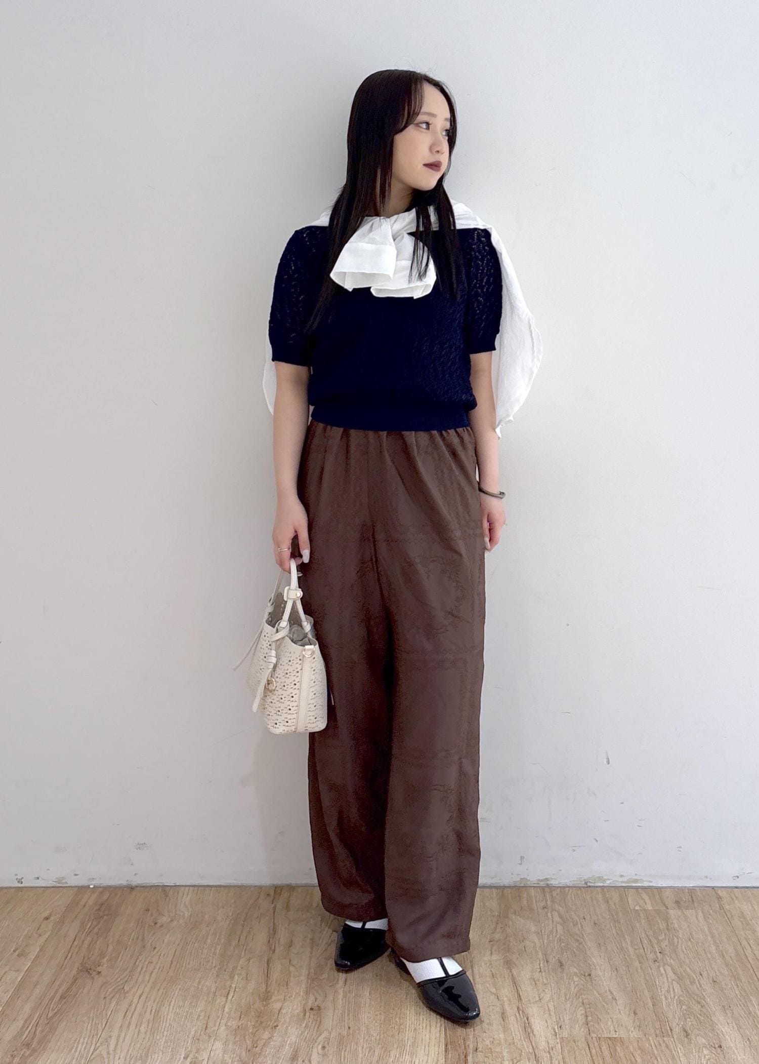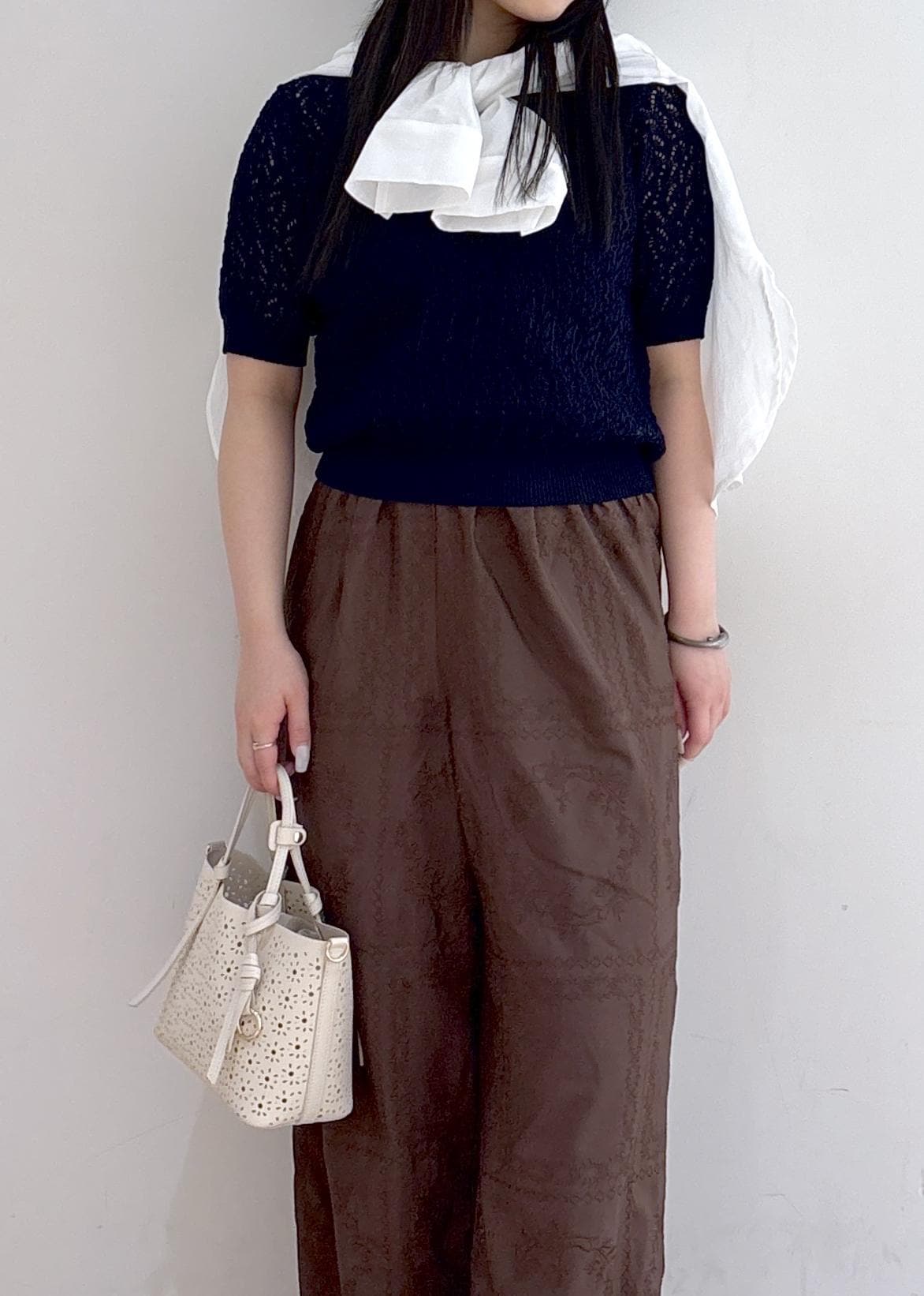 シンプルなスタイリングですがレースアイテムを取り入れてこなれ感も◎ シャツを肩巻きしてアレンジしてみました!