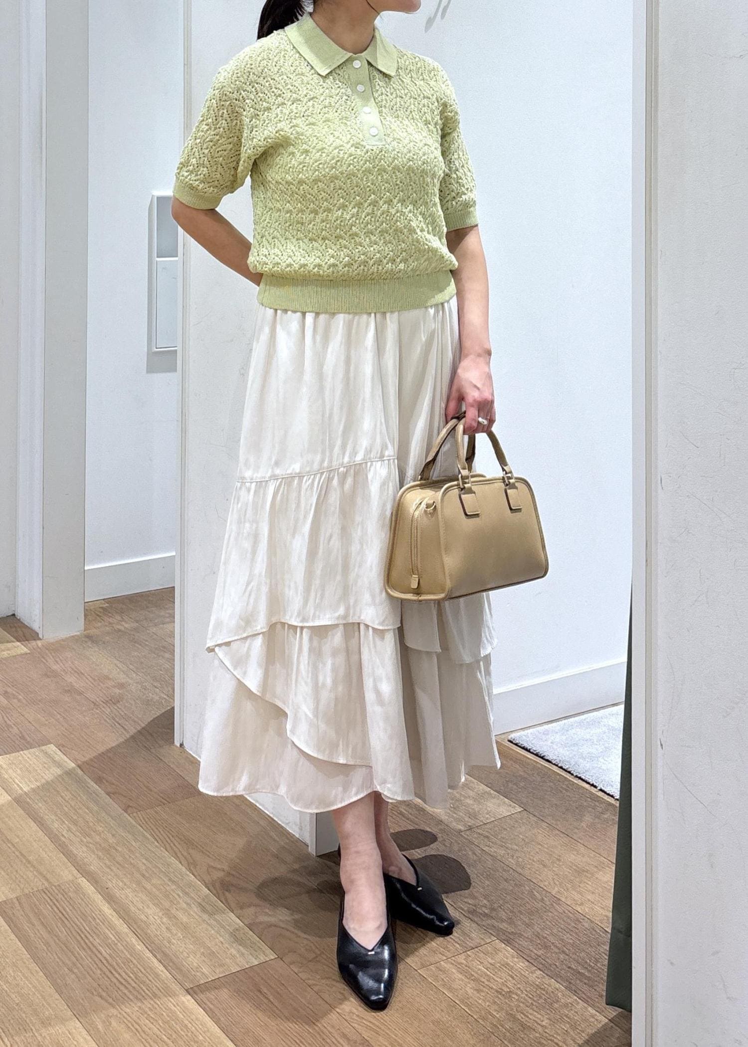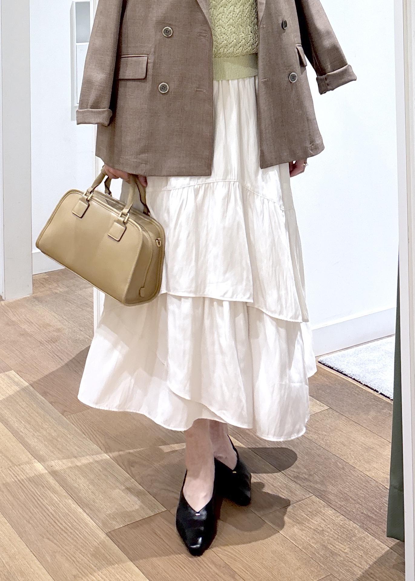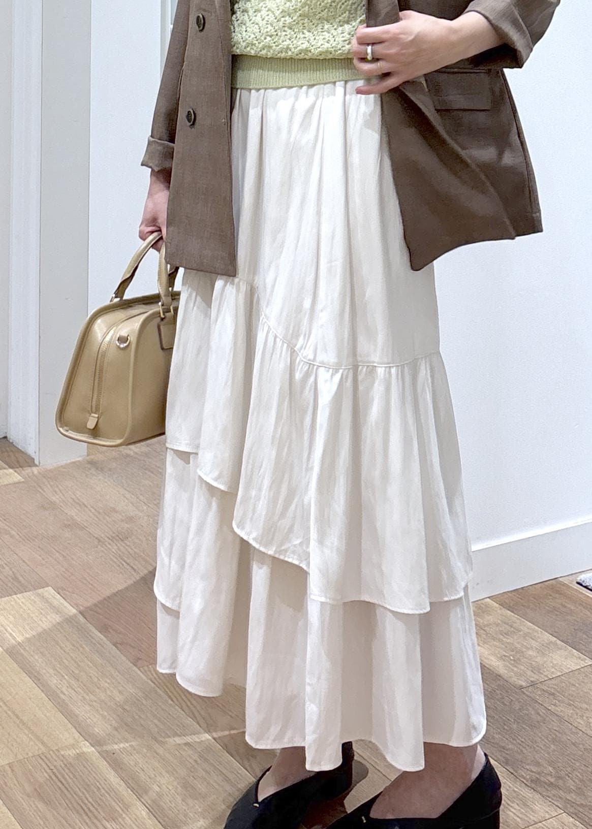 ROPÉ PICNICダンダンティアードスカートオフホワイト / F¥7,491レビュー裾に向かってボリュームが出るデザインで、腰回りはすっきりとしているので、着丈が長めのトップスやジャケットと合わせてもバランス感◎です。