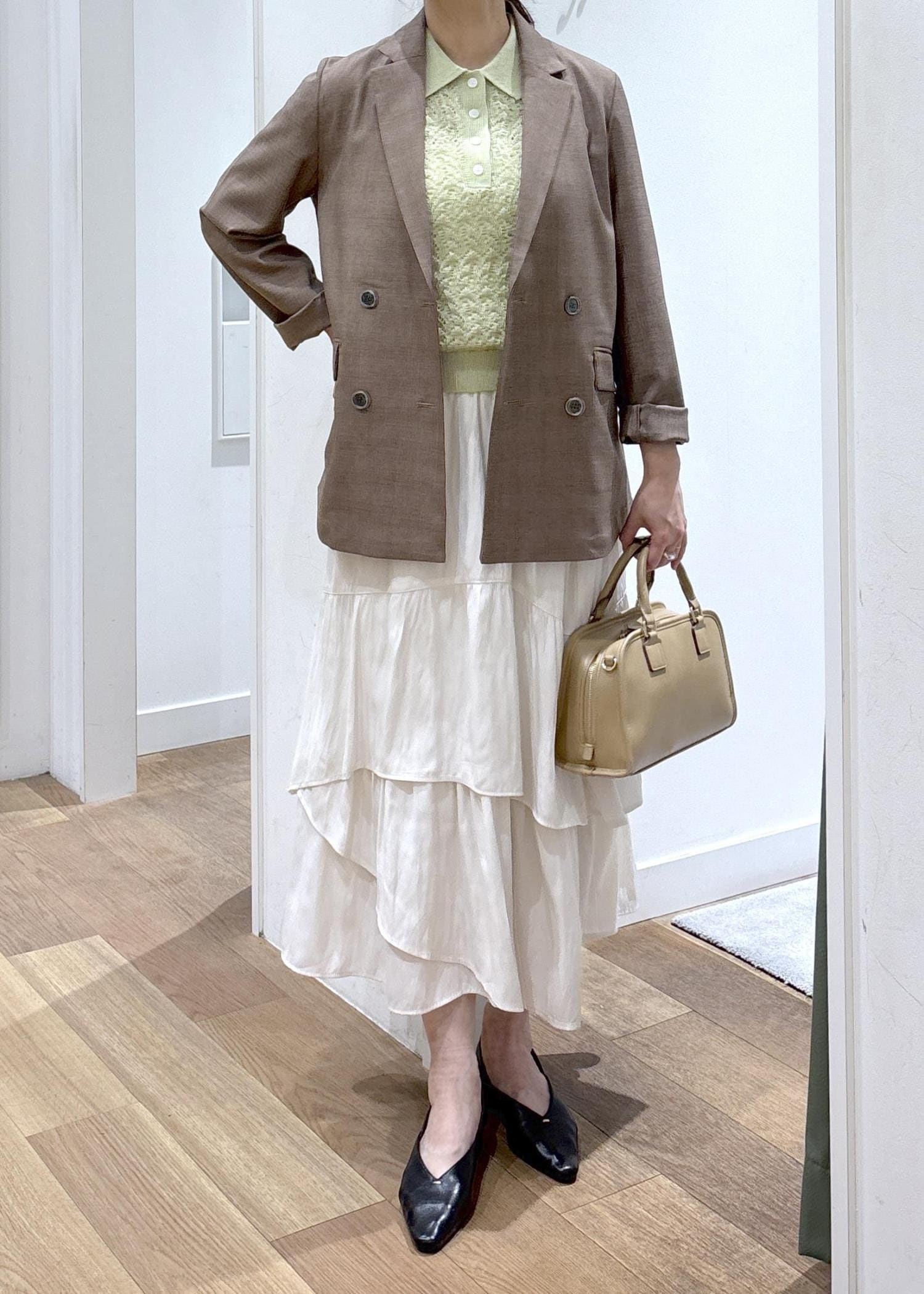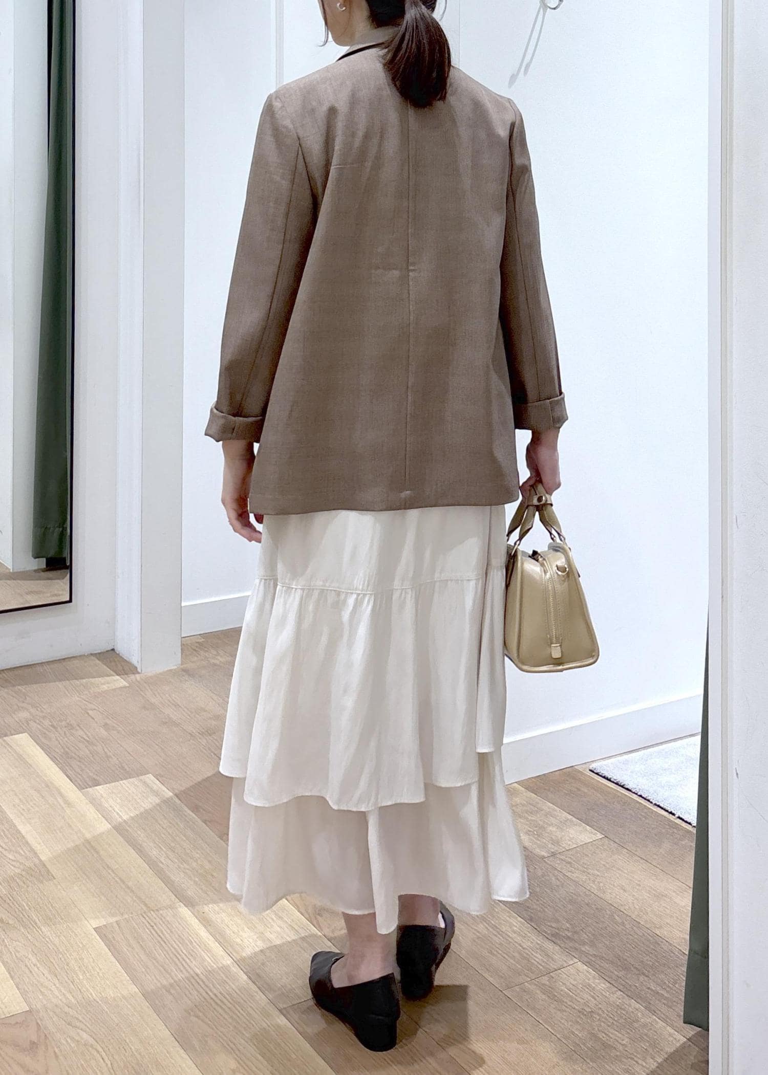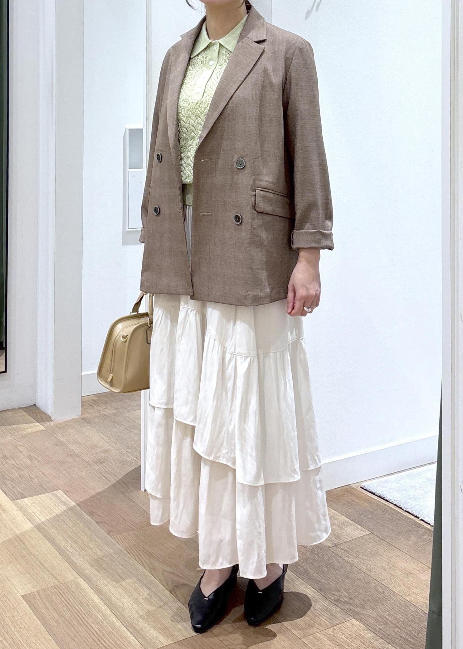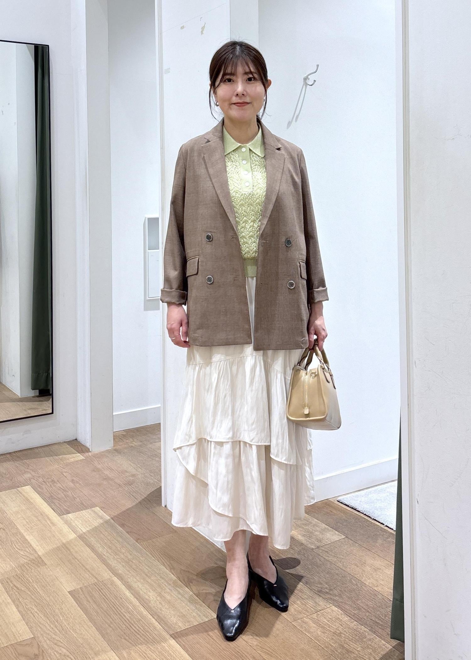 ROPÉ PICNICダンダンティアードスカートオフホワイト / F¥7,491レビュー裾に向かってボリュームが出るデザインで、腰回りはすっきりとしているので、着丈が長めのトップスやジャケットと合わせてもバランス感◎です。