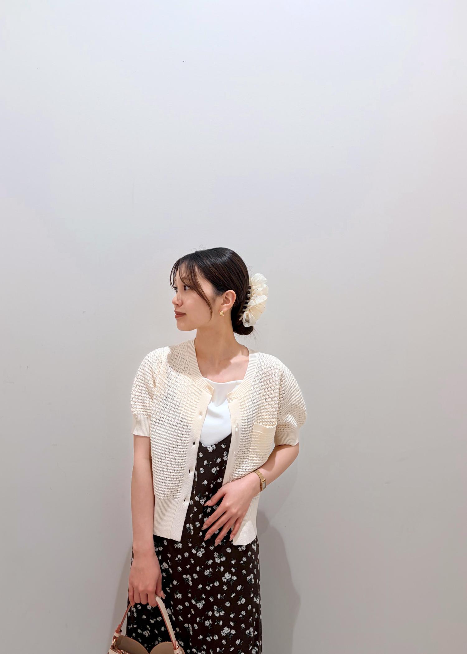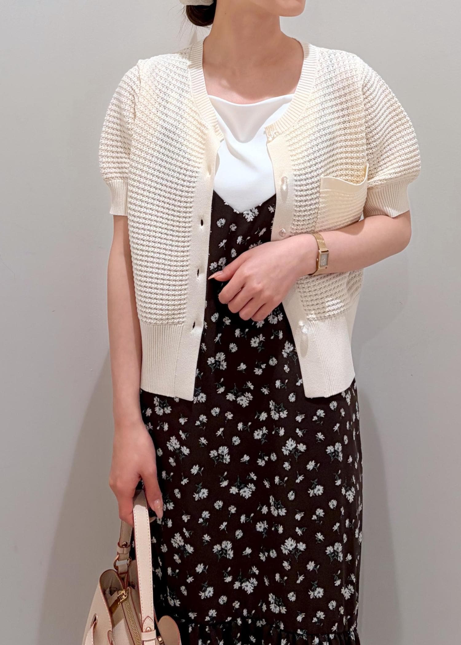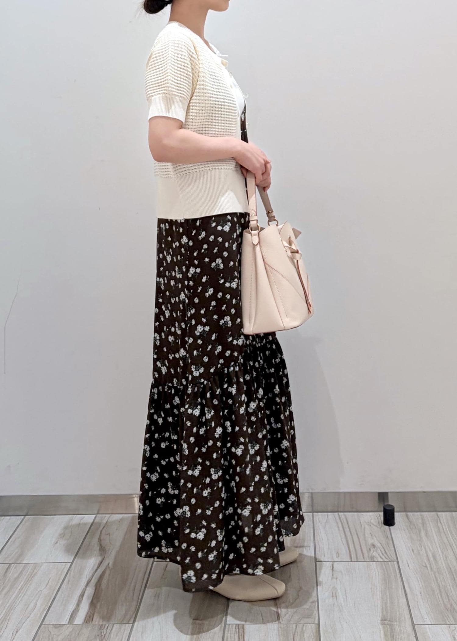 女性らしいシルエットの小花柄キャミワンピとコンパクトめなカーデで肌見せしすぎない女性らしい柔らかなコーデにしてみました。全体的に茶系がほんのり優しい印象に魅せてくれます。