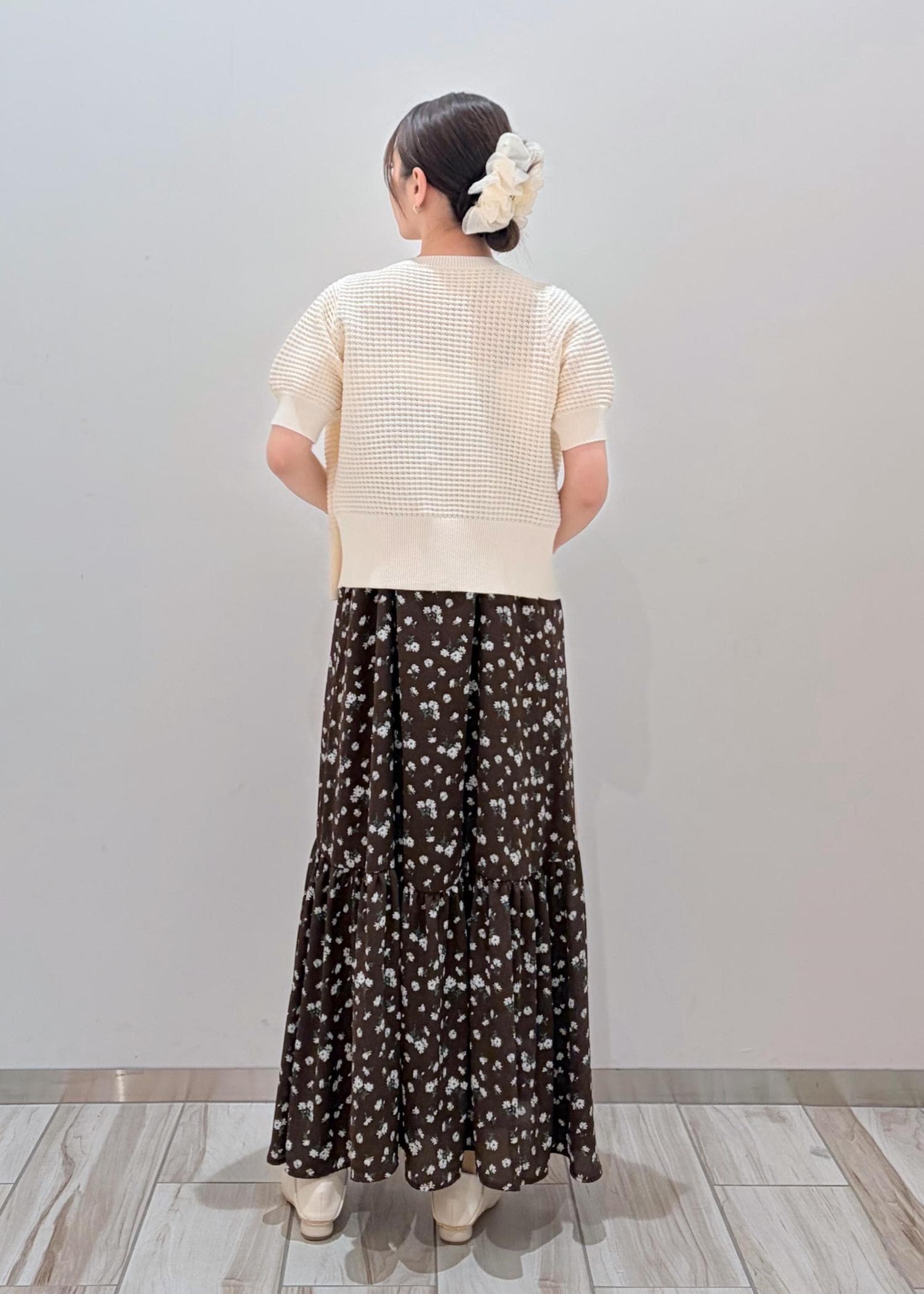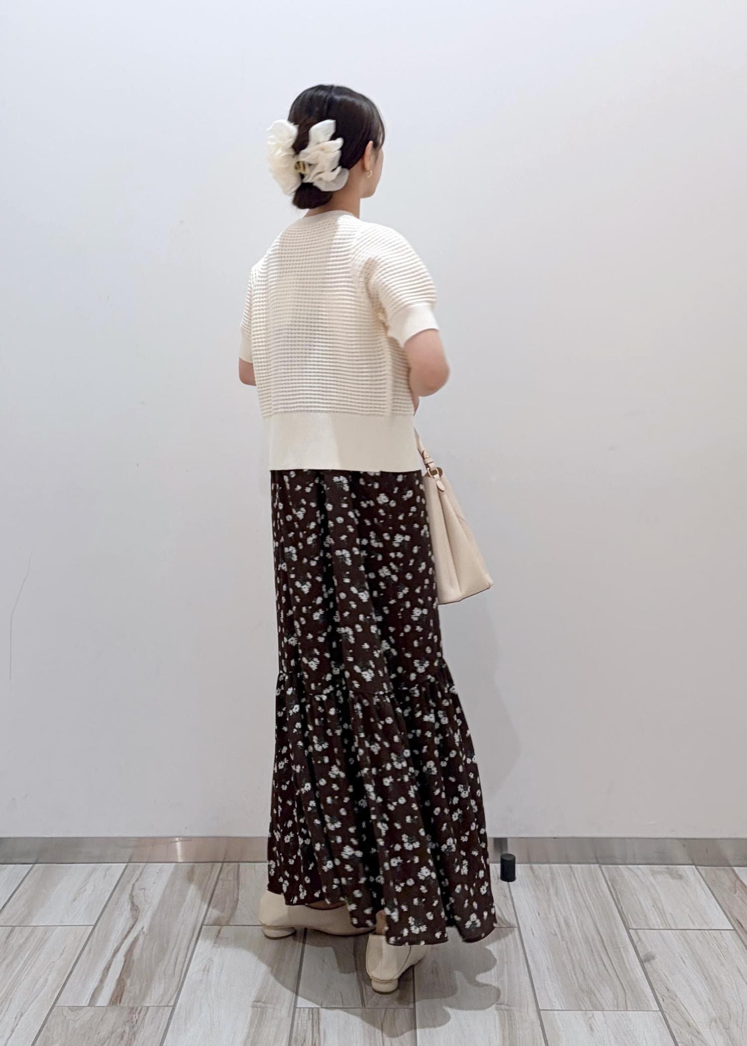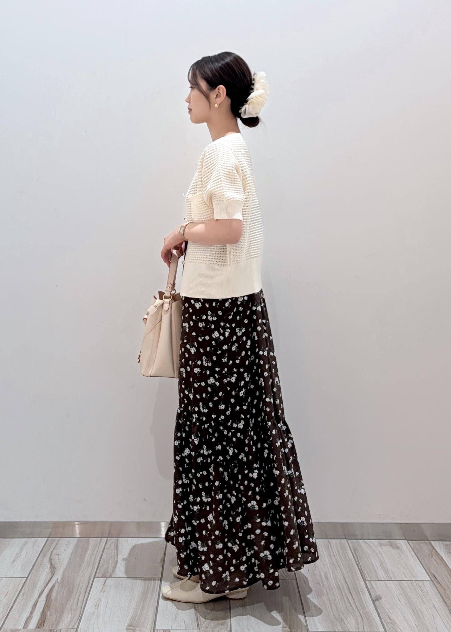 女性らしいシルエットの小花柄キャミワンピとコンパクトめなカーデで肌見せしすぎない女性らしい柔らかなコーデにしてみました。全体的に茶系がほんのり優しい印象に魅せてくれます。