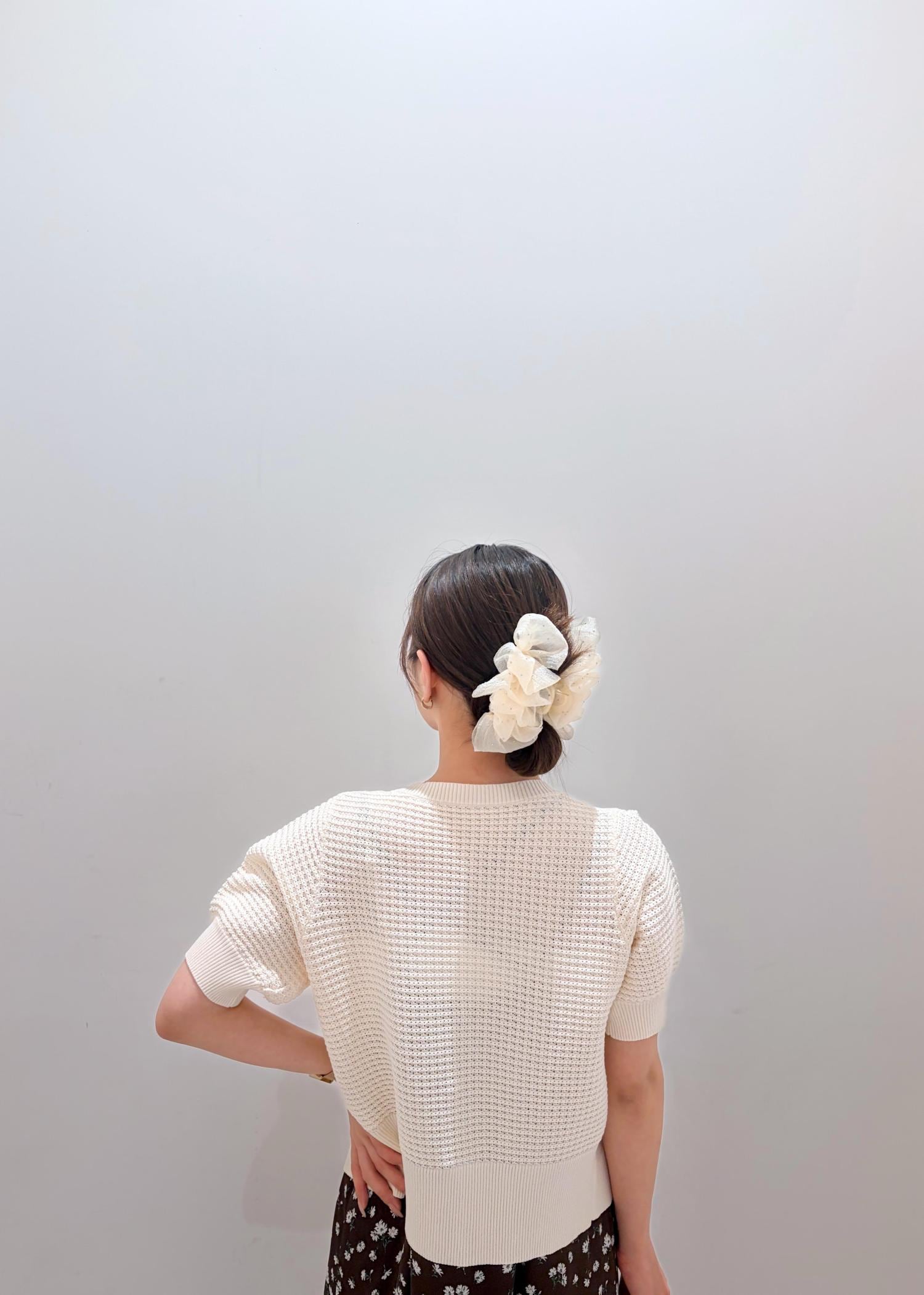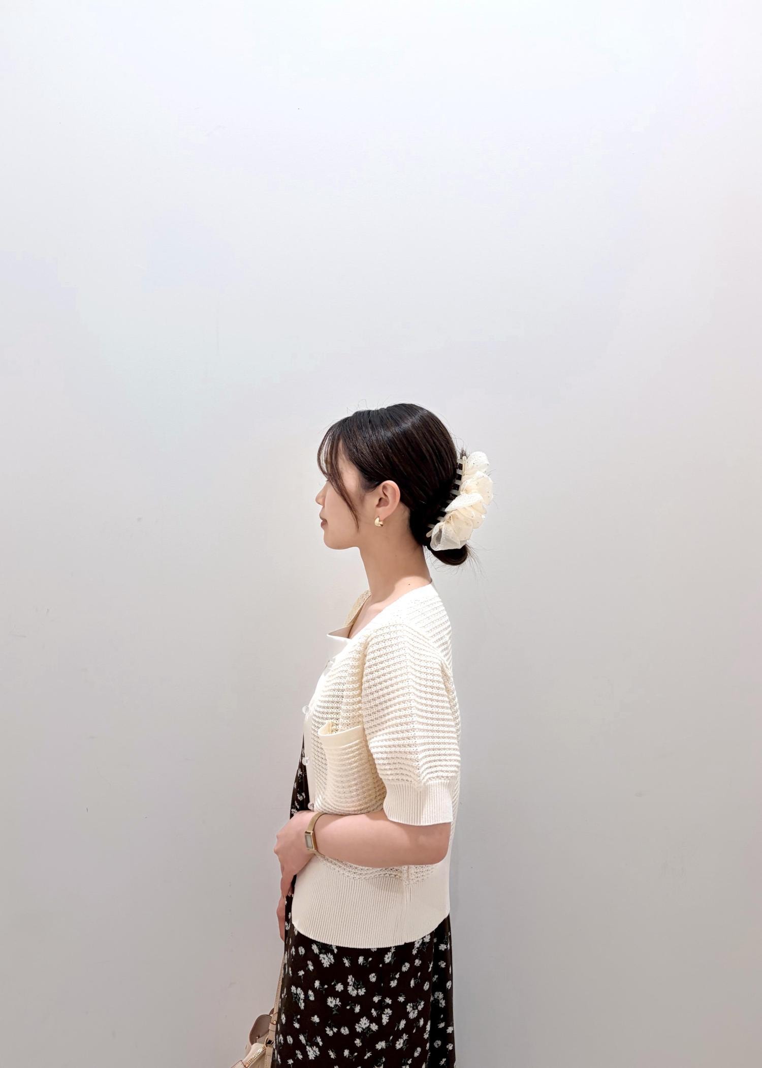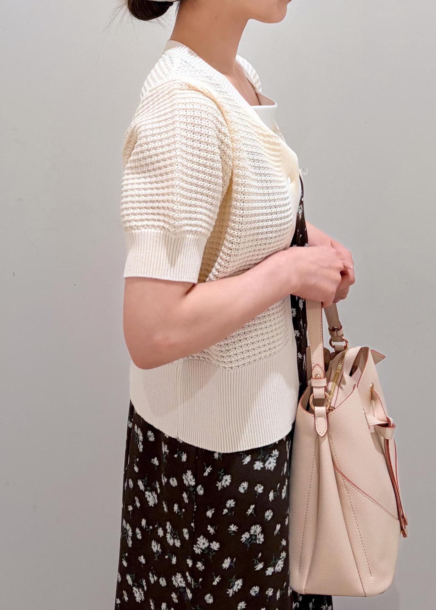 袖は膝上の長さで、着丈は腰にかかるスッキリとした長さです。しっかりとした生地感と程よい透かし感のあるデザイン。伸縮性もあるのでとても着やすいトップスにも、カーディガンにもなるアイテムです。 -