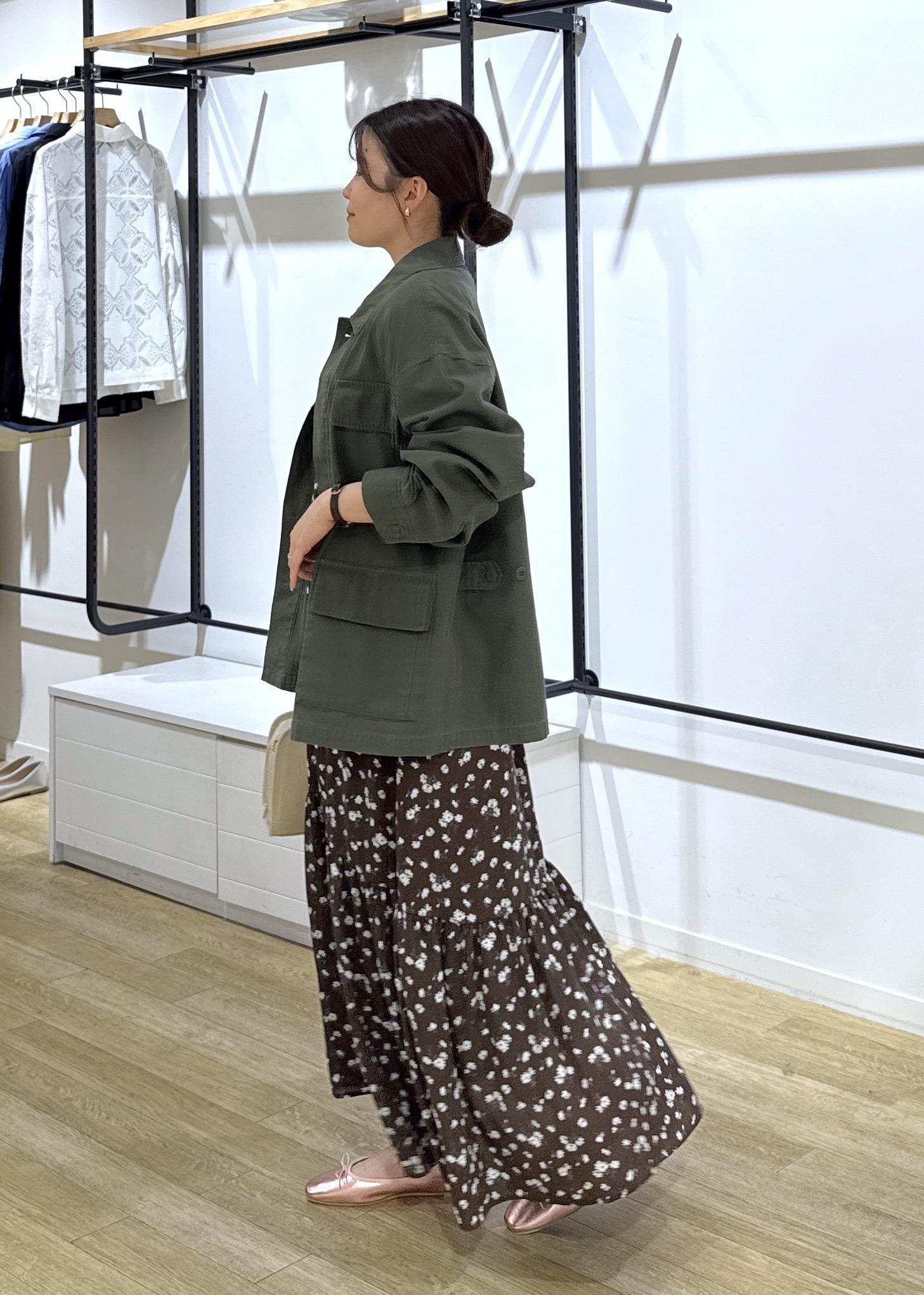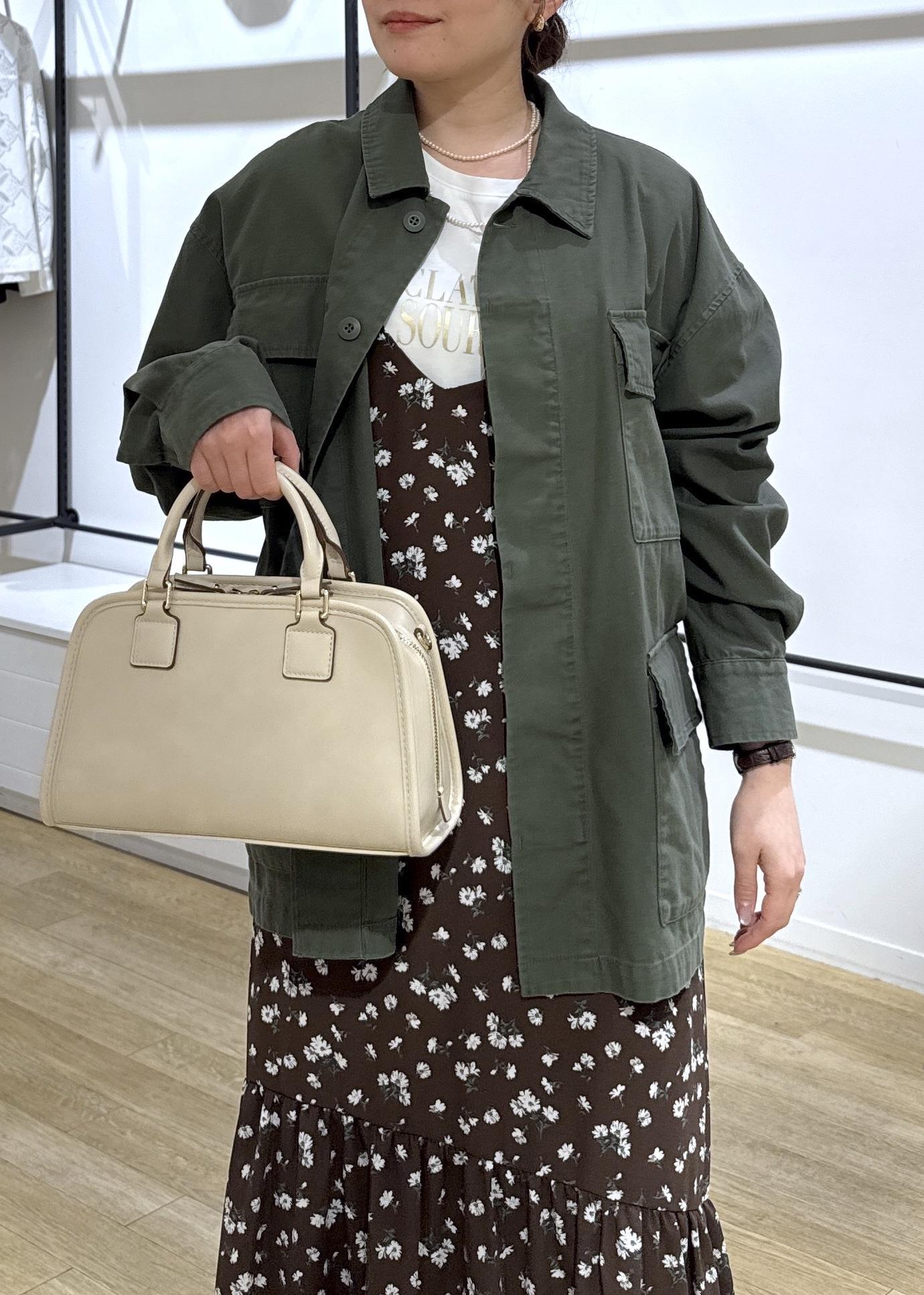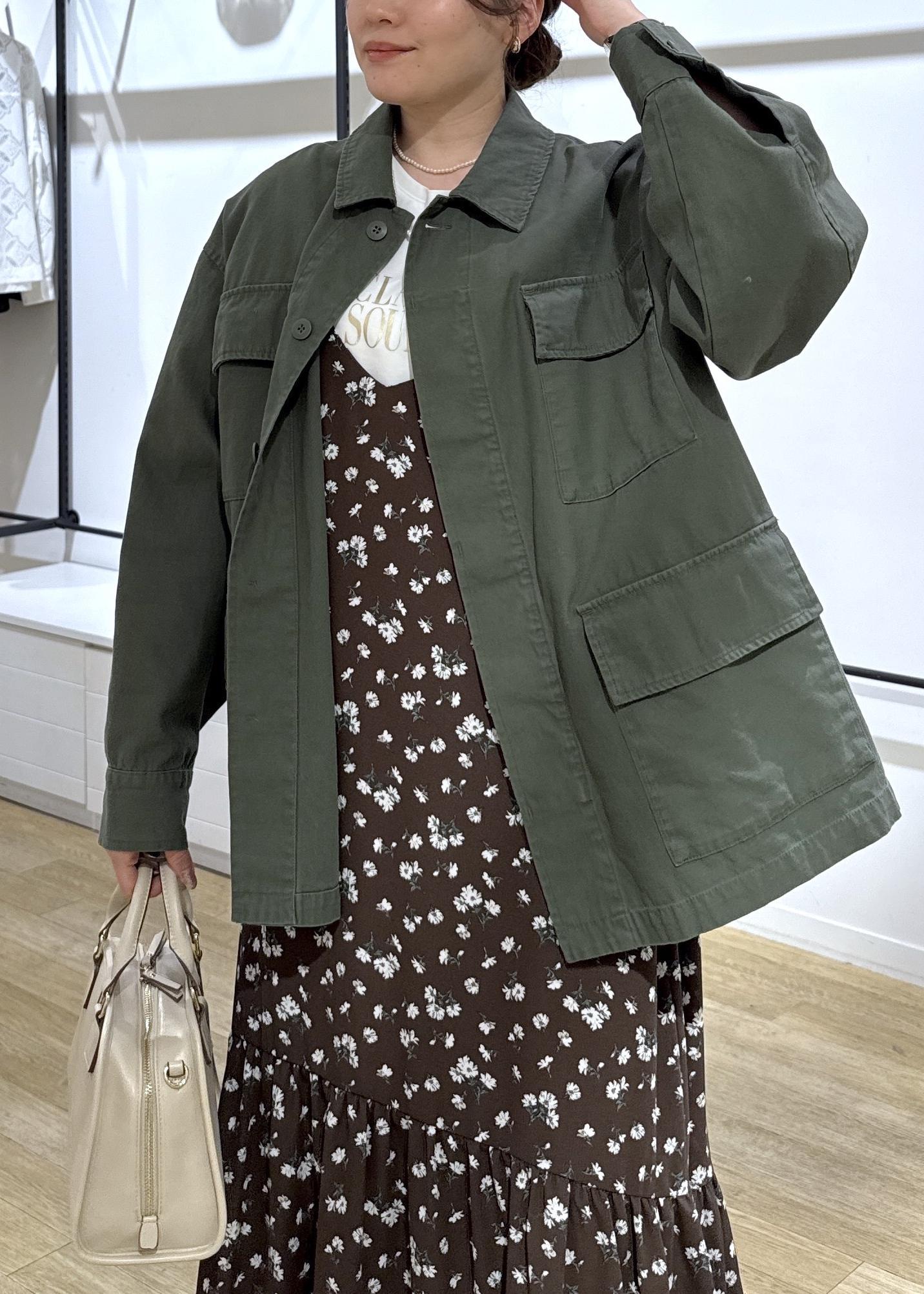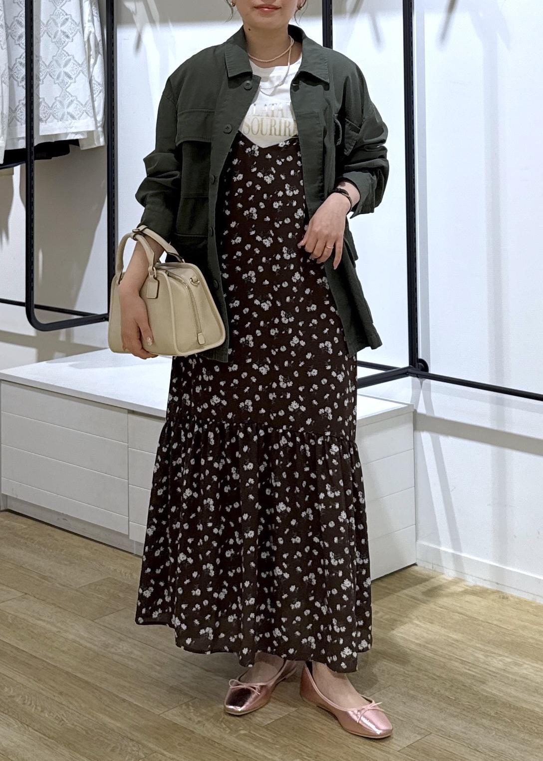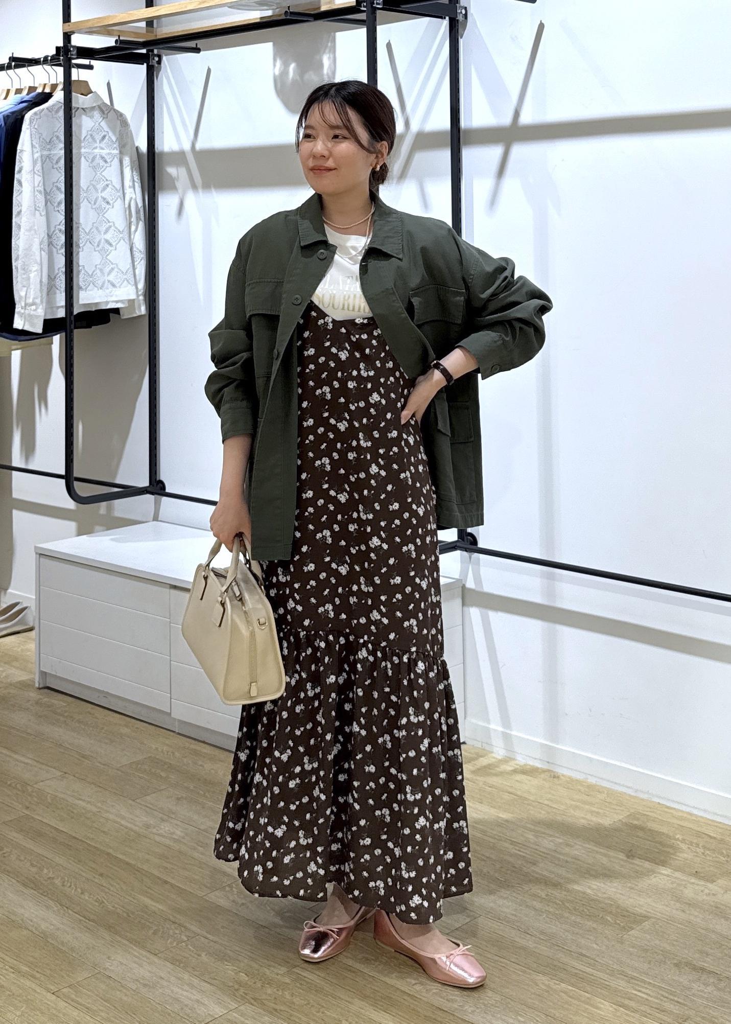日中と朝晩の寒暖差のある今の時期に使いやすいミリタリーブルゾンにキャミワンピコーデを合わせて