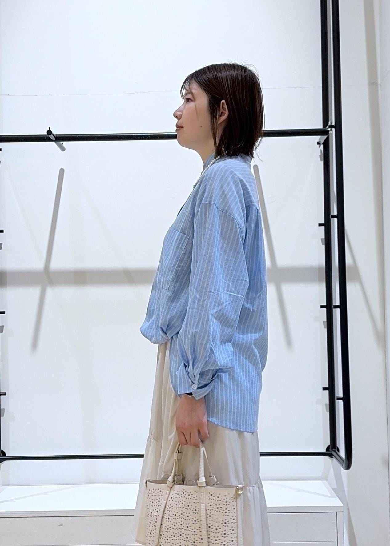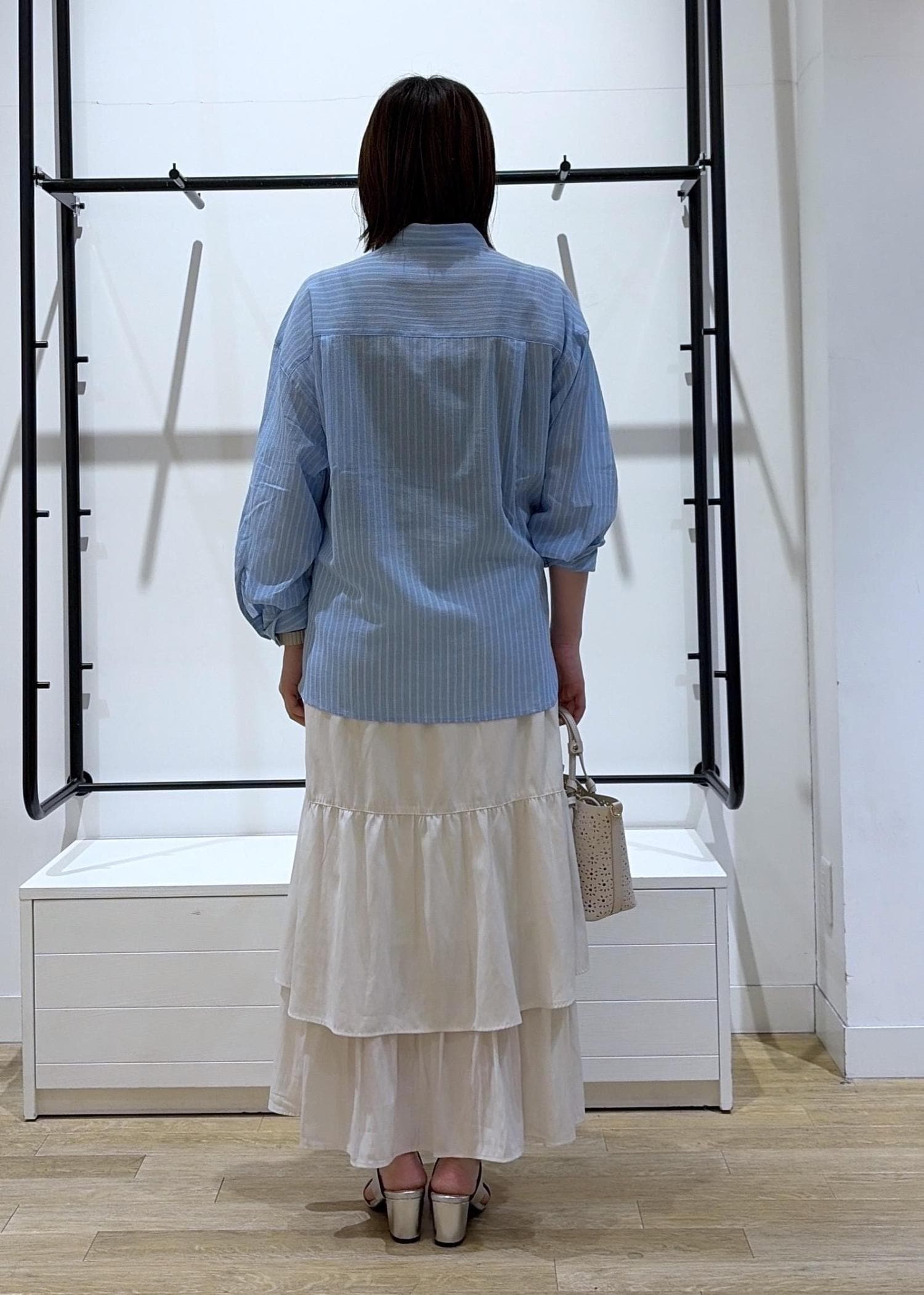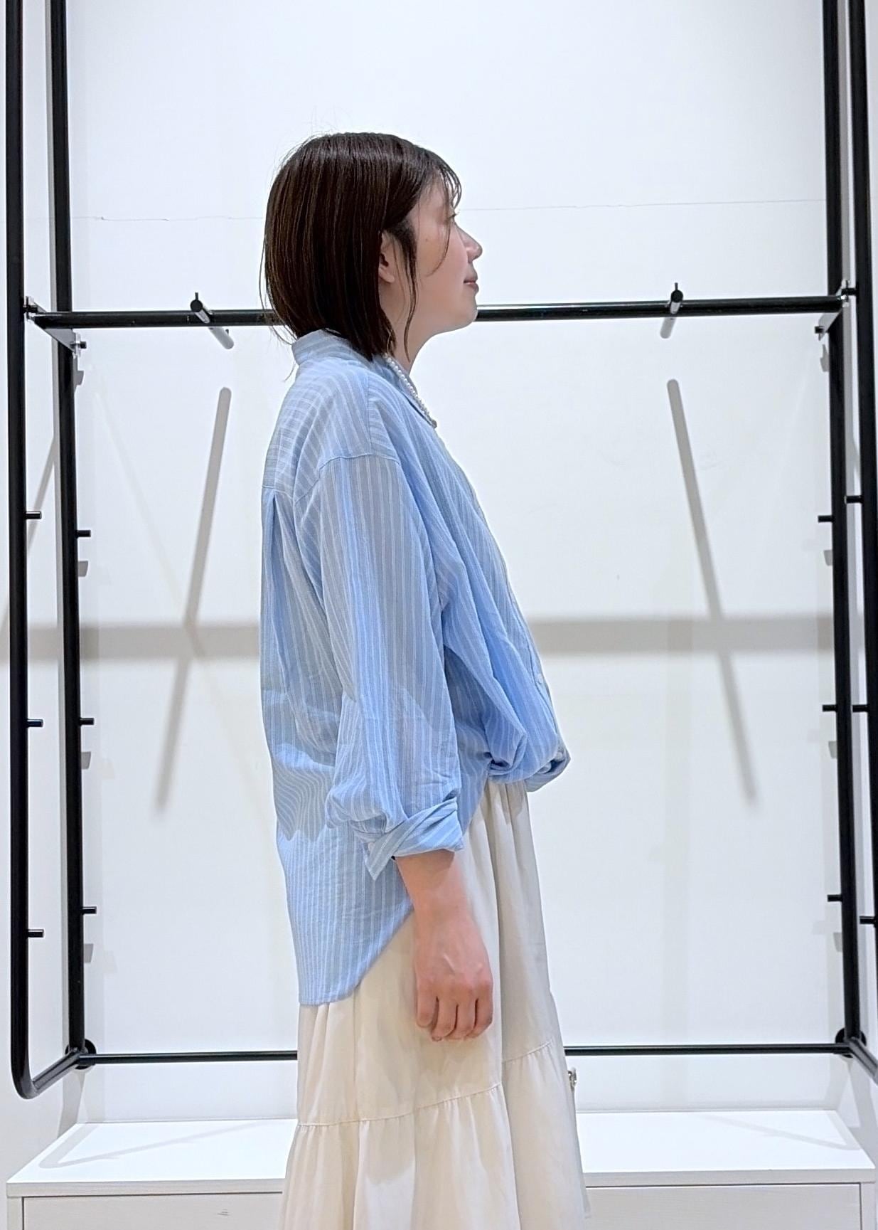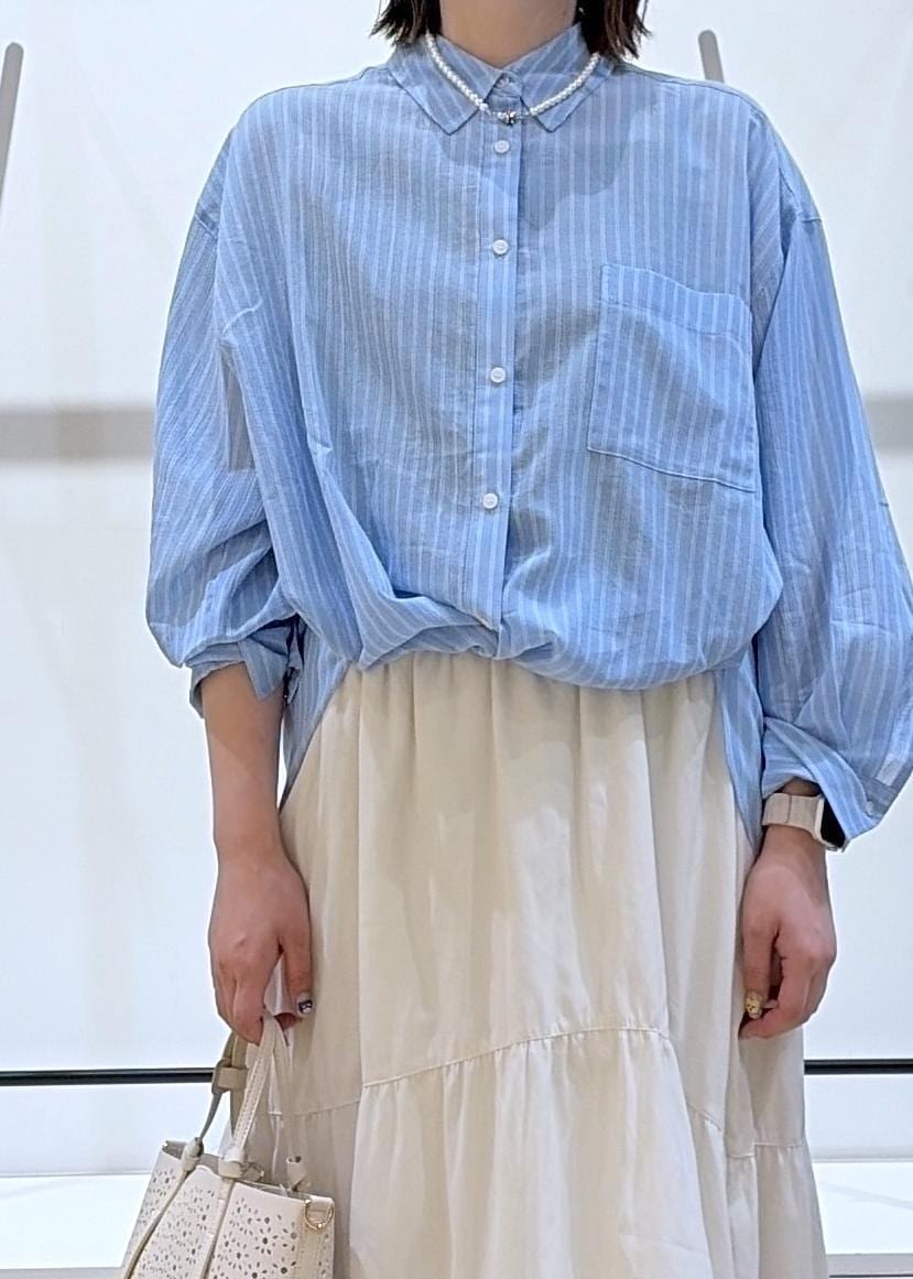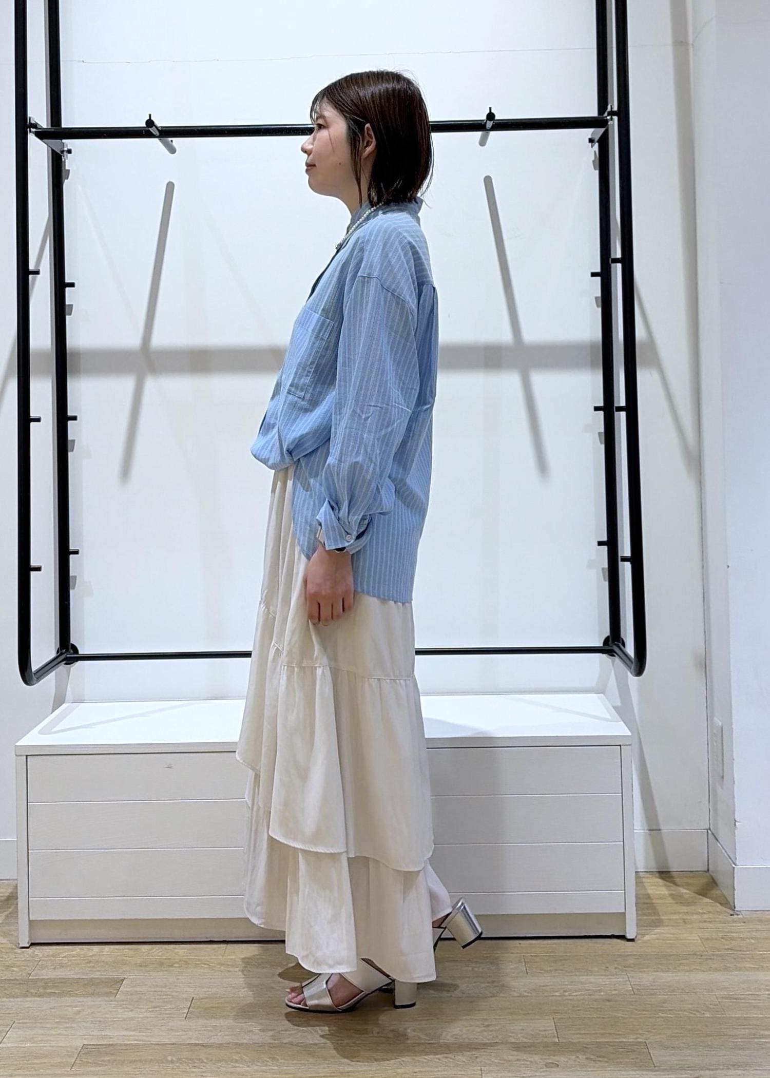シャツはカシュクールにアレンジをしてインせず着用してます♩広がりの控えめなスカートなので、トップスはこういったシャツとも相性◎です¨̮⃝