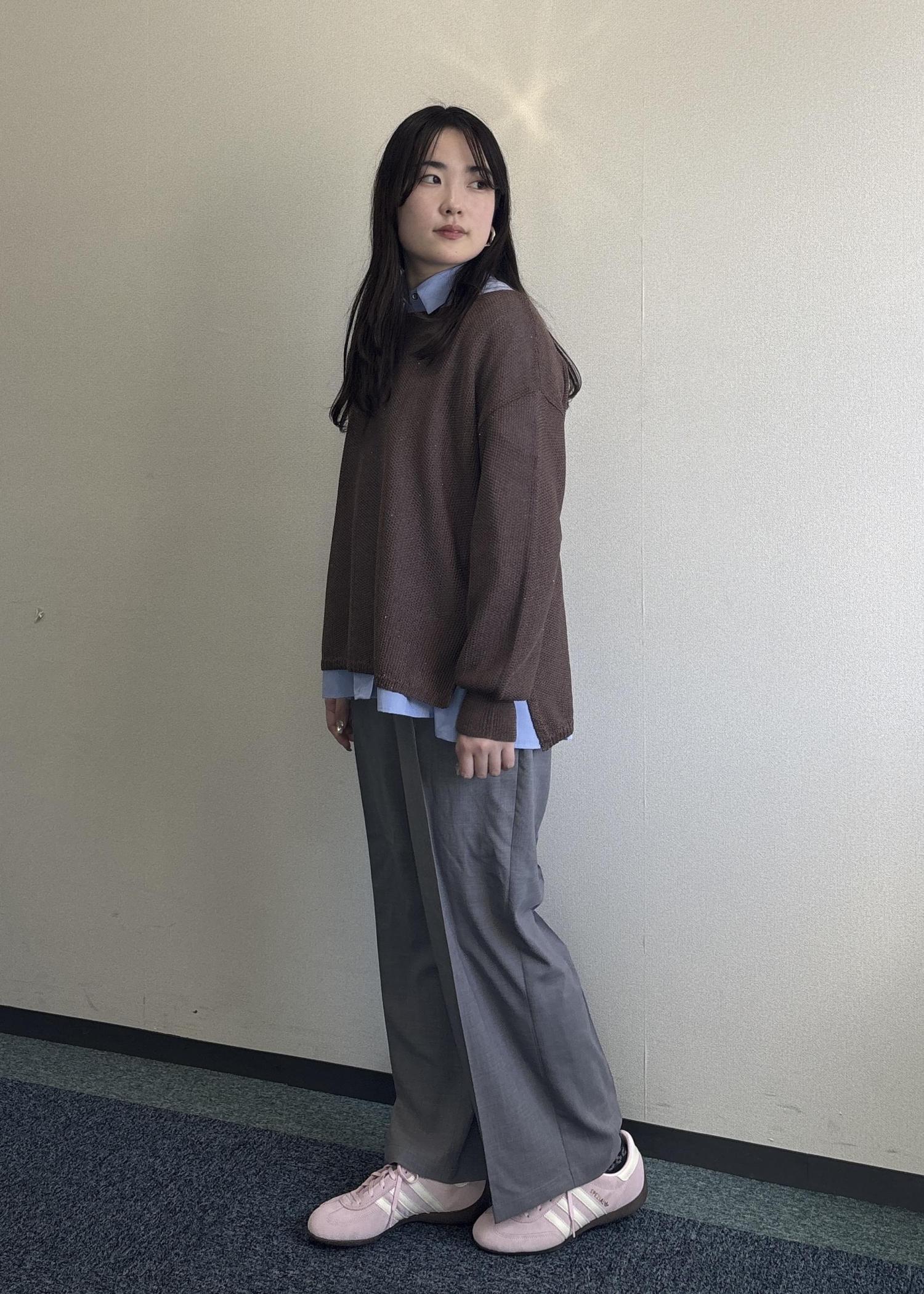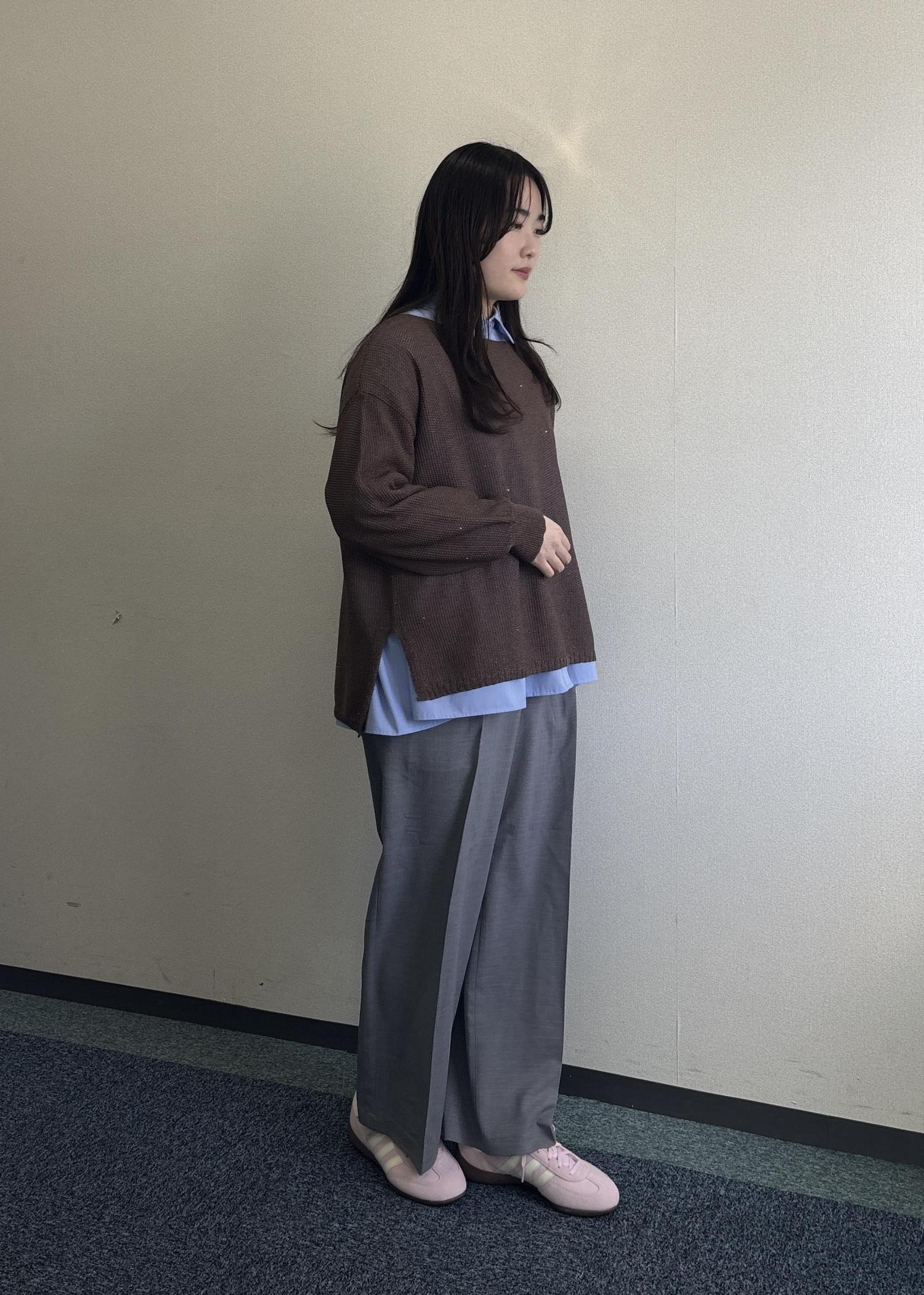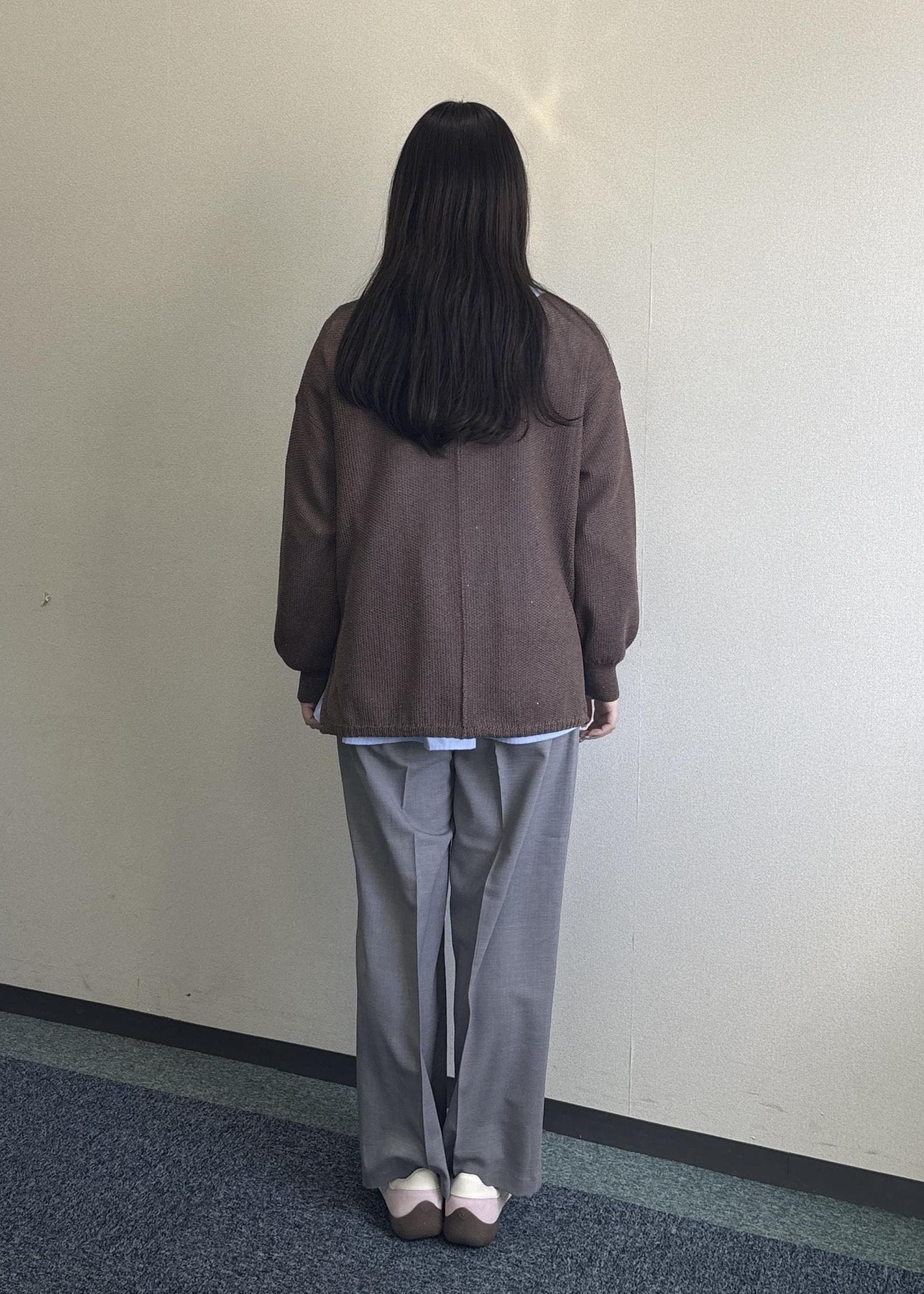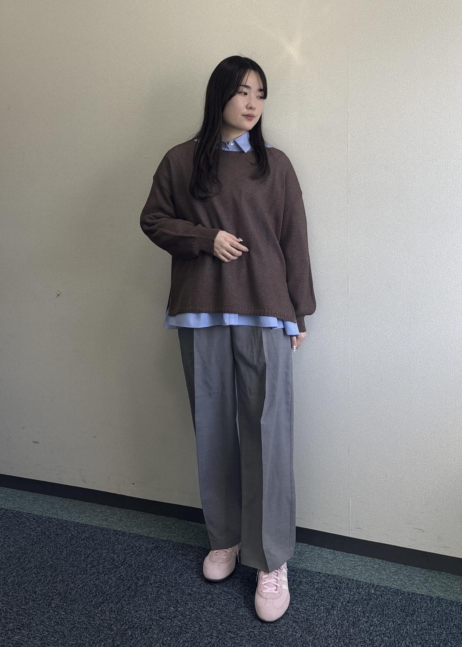 グレーのパンツと合わせて落ち着いた春コーデができました。