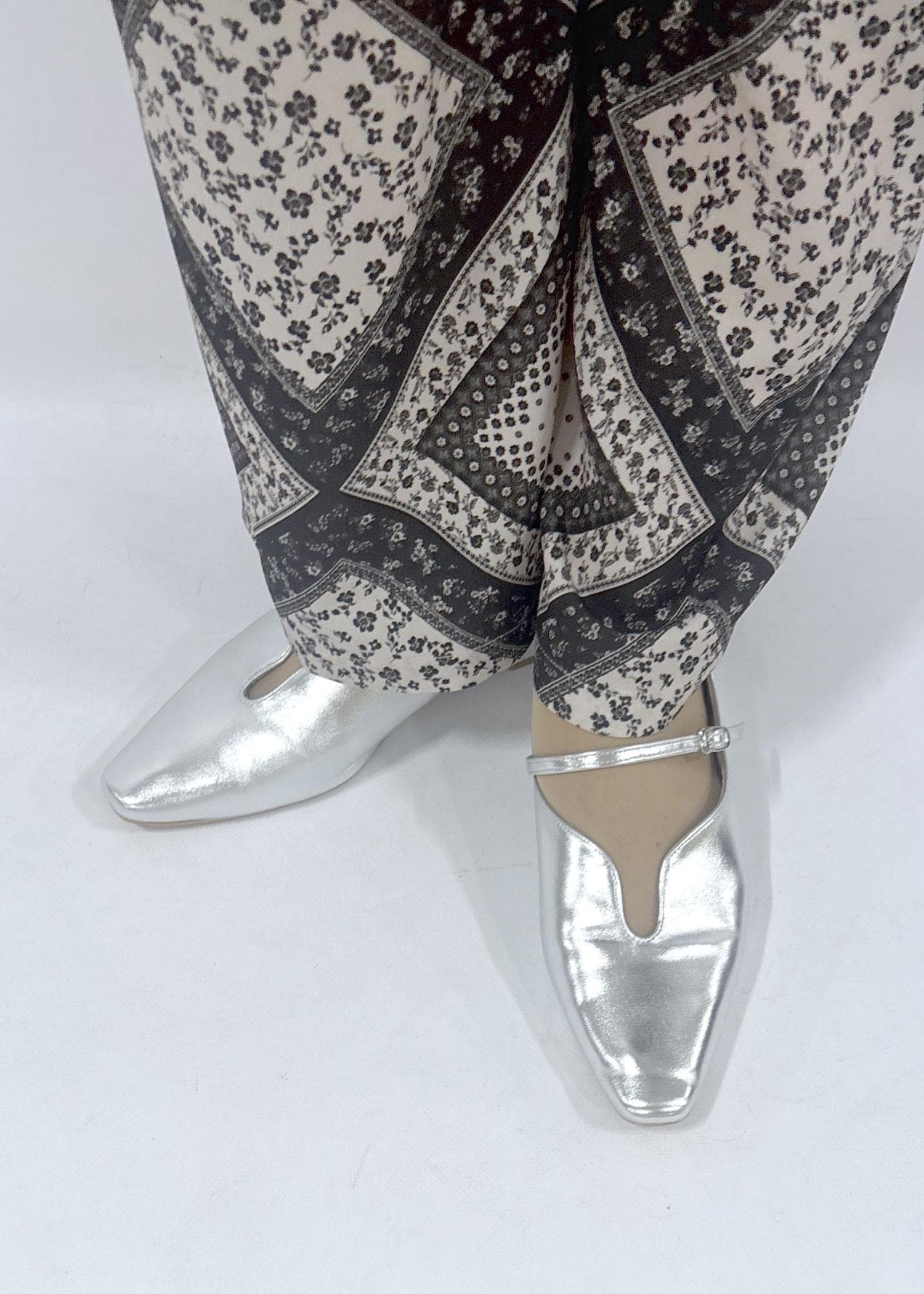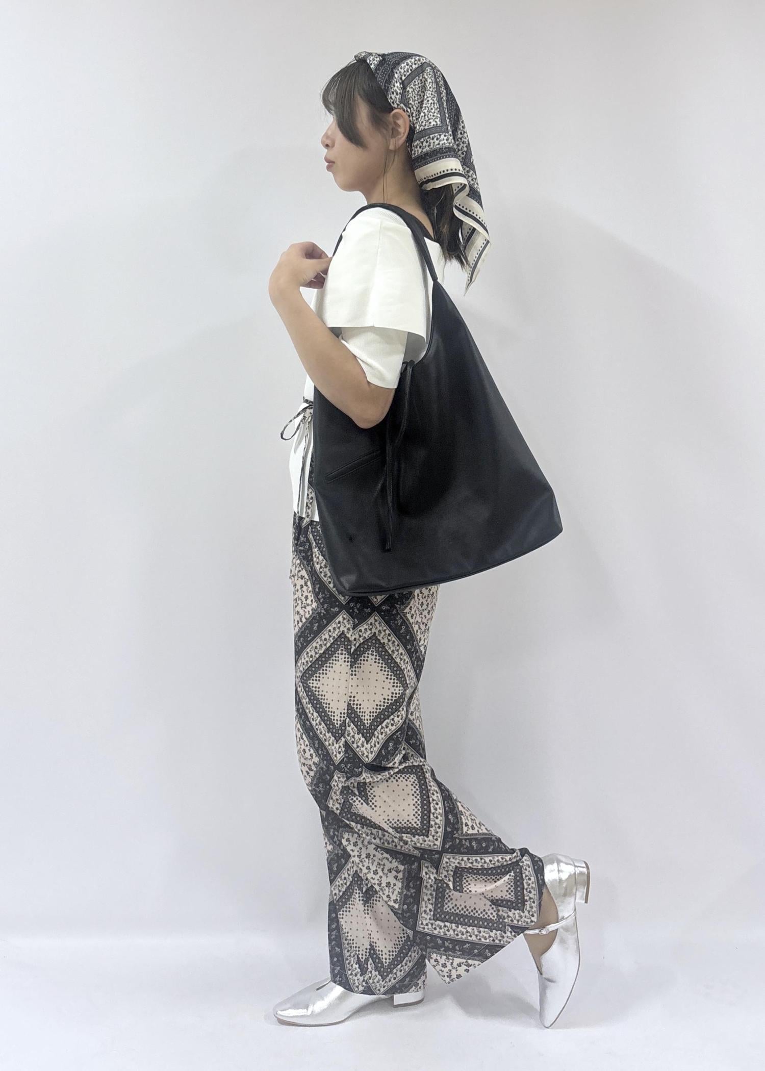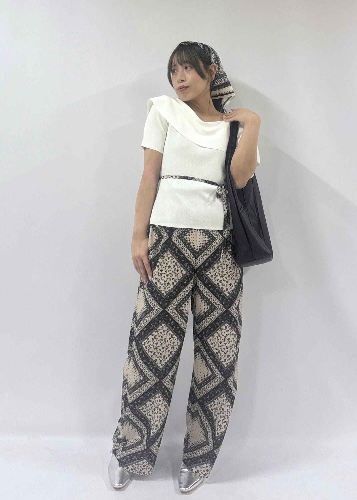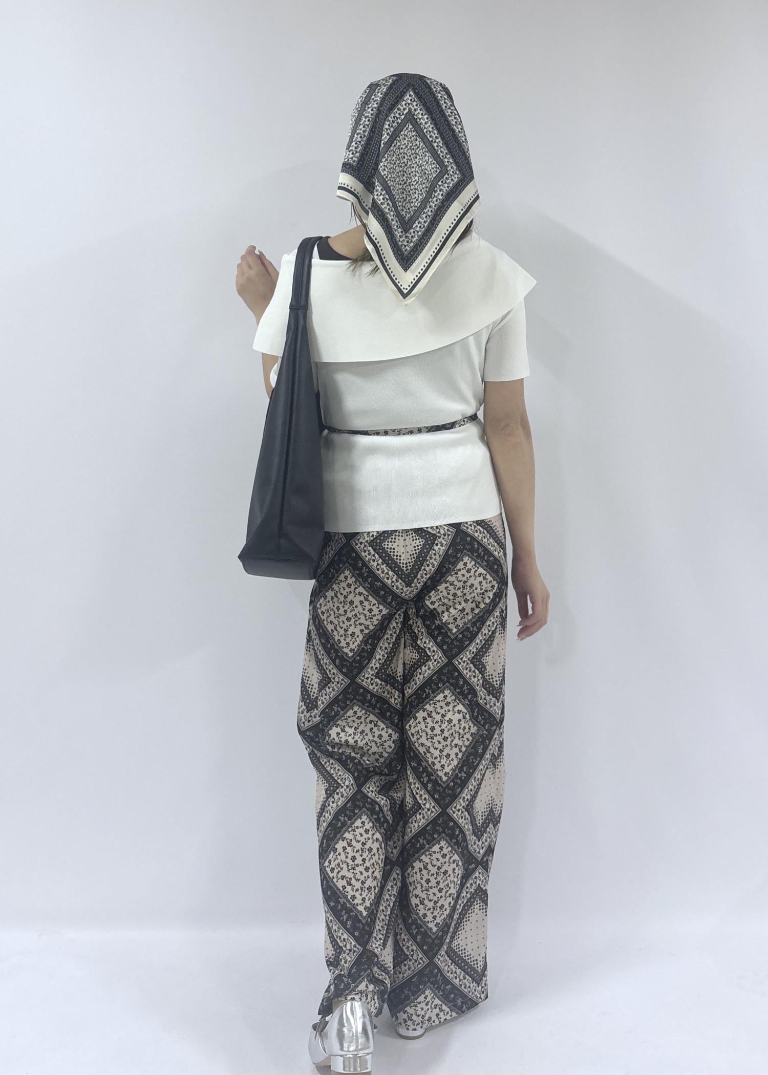 華やかなパンツとシンプルなアイテムの緩急をつけ、パンツと同じ柄のスカーフを取り入れることで統一感のあるスタイリングになりました。