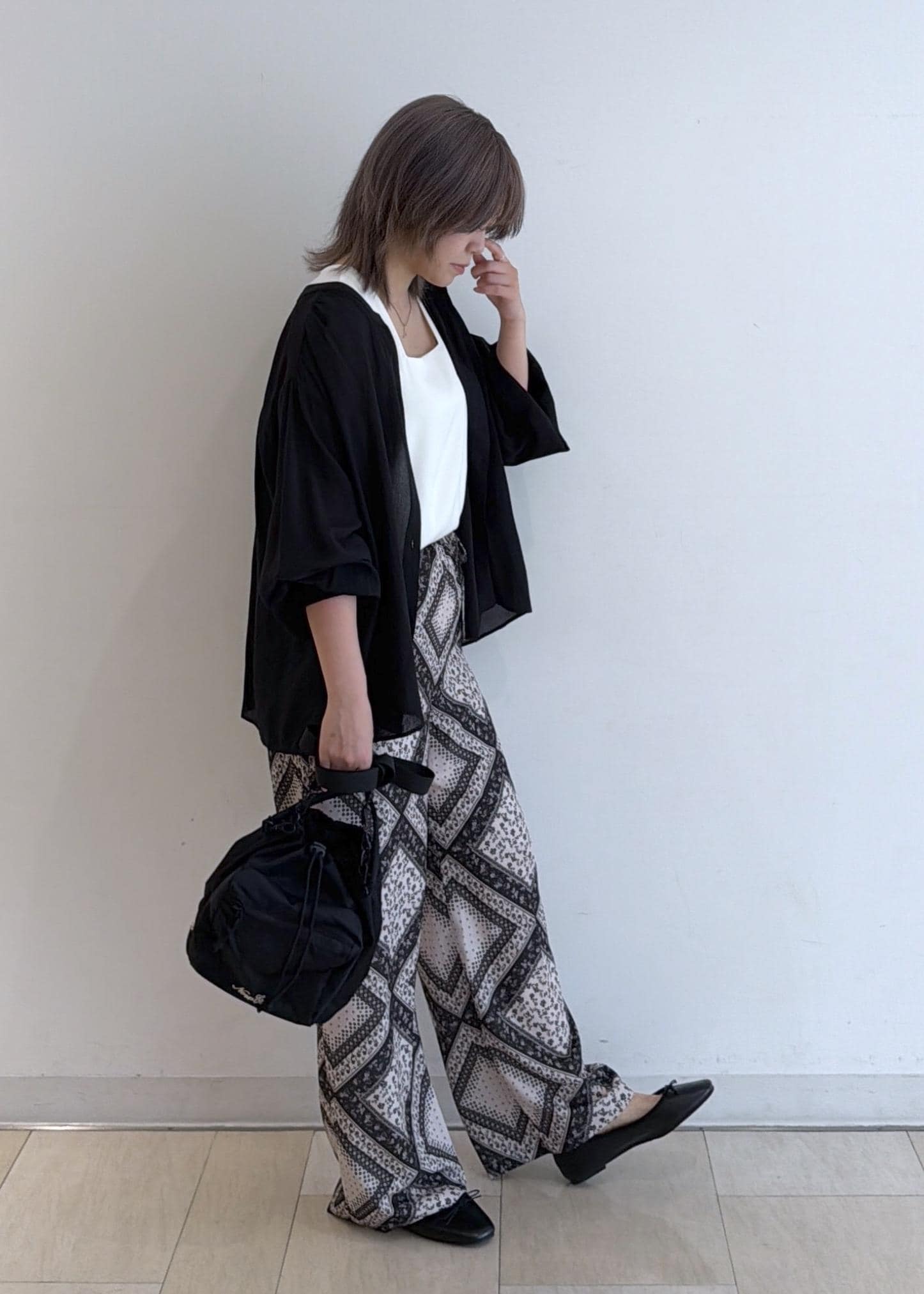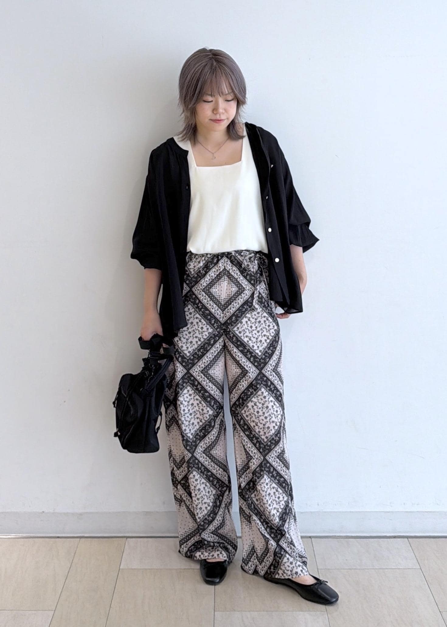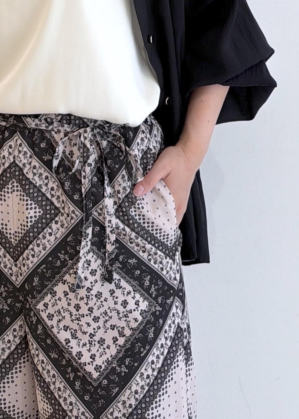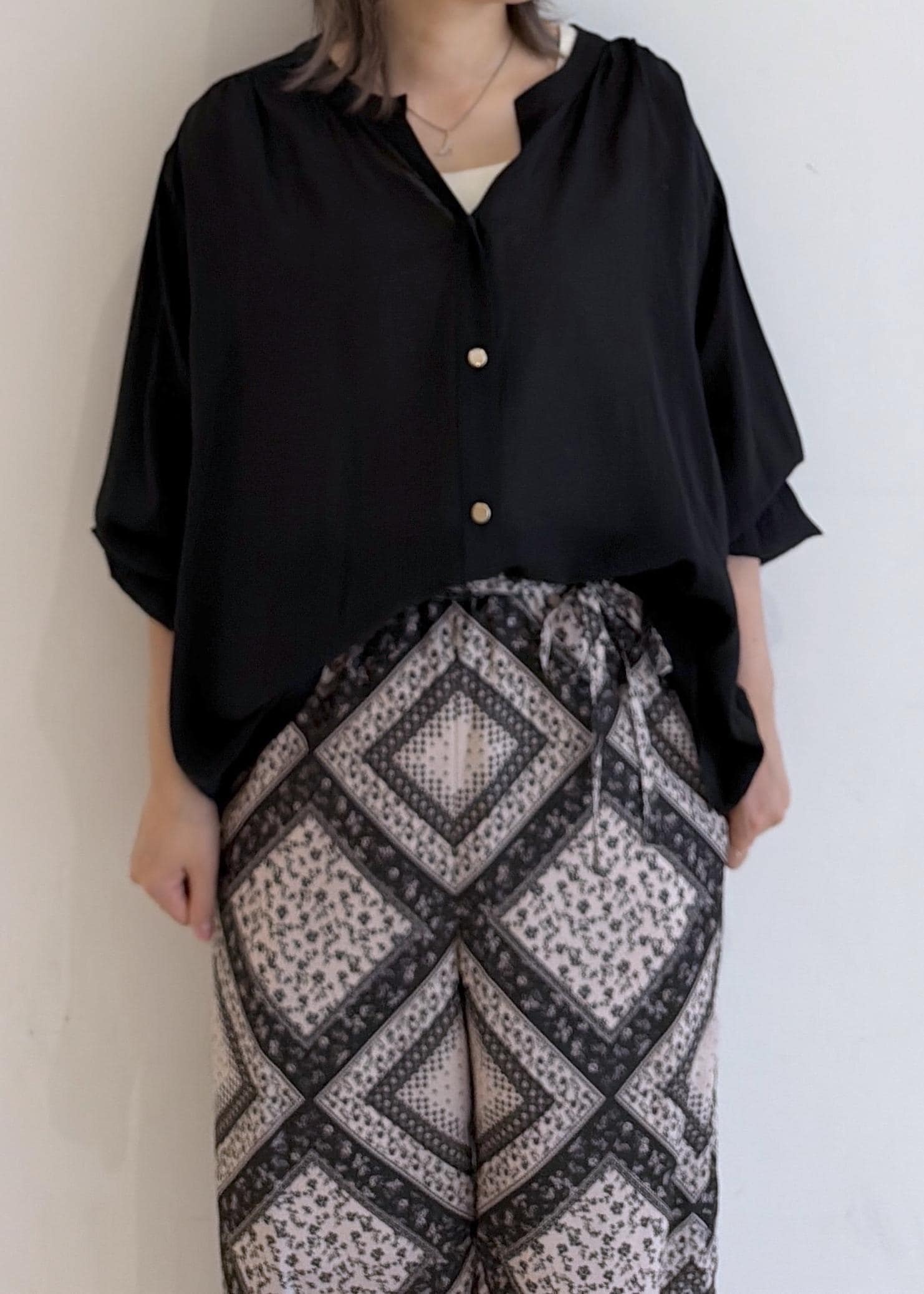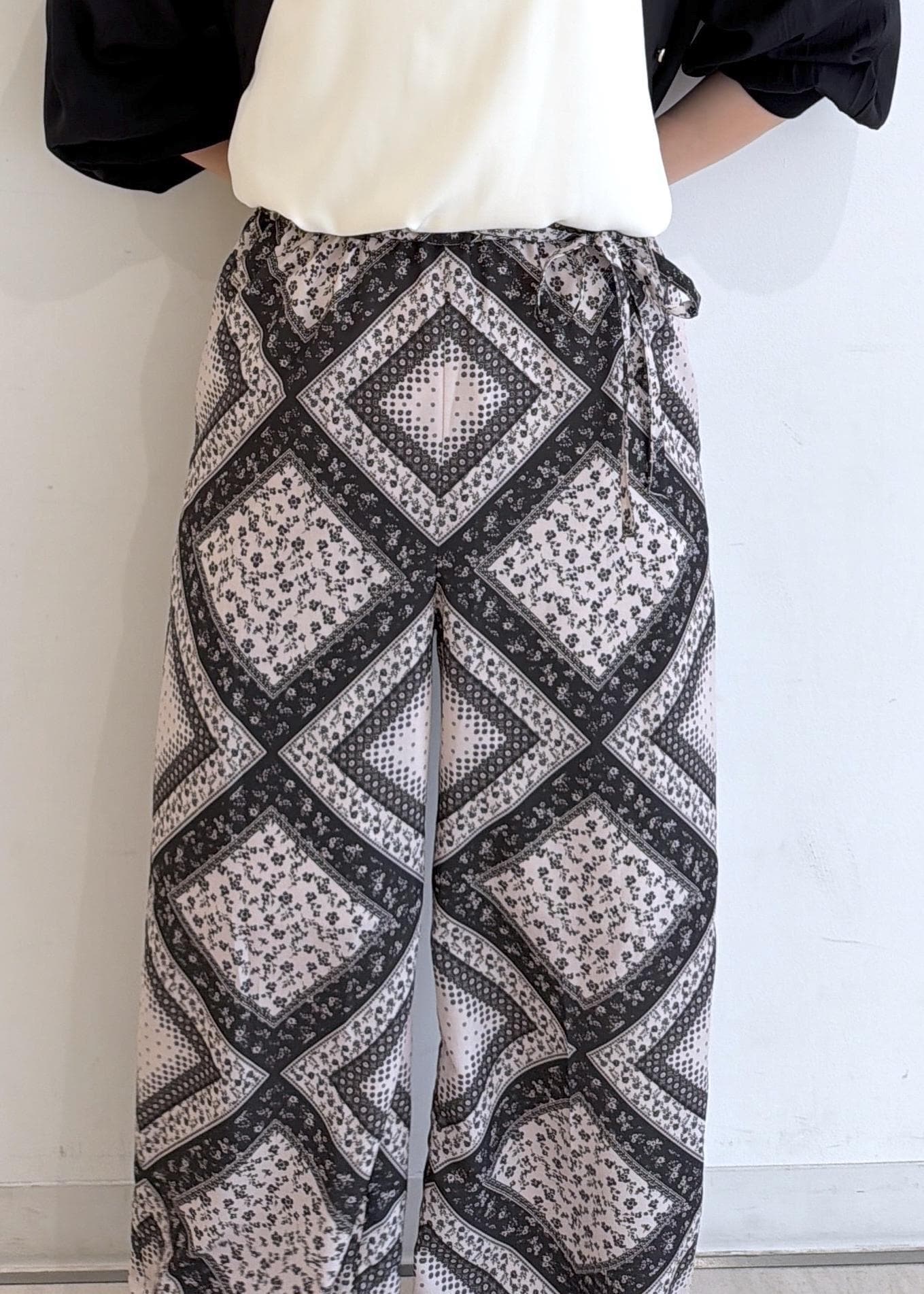 スカーフ柄の華やかパンツを使った、ブラックコーデです!
