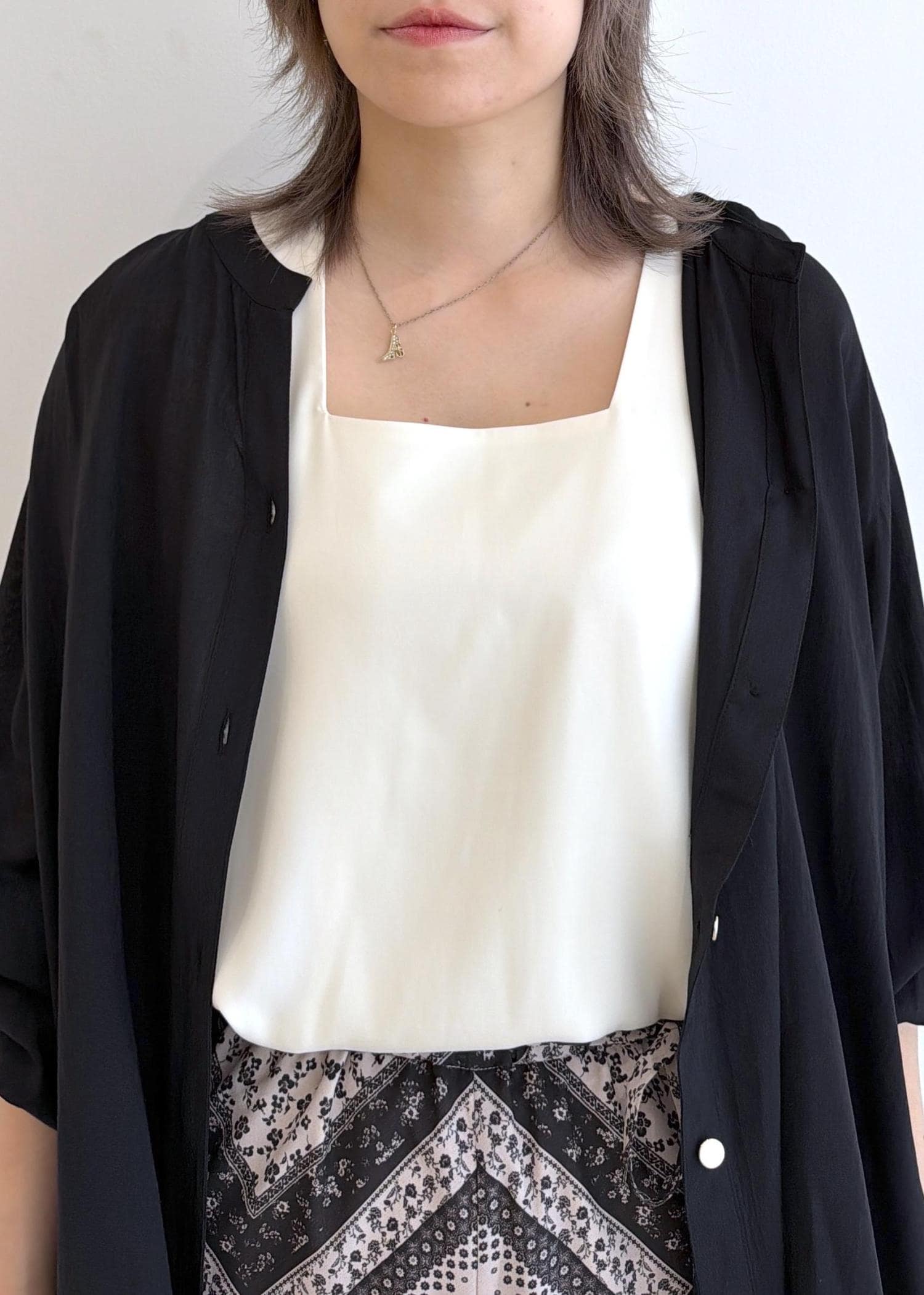 インナーはサテン生地のタンクトップを合わせて、とことん涼しく着れるコーディネートです!