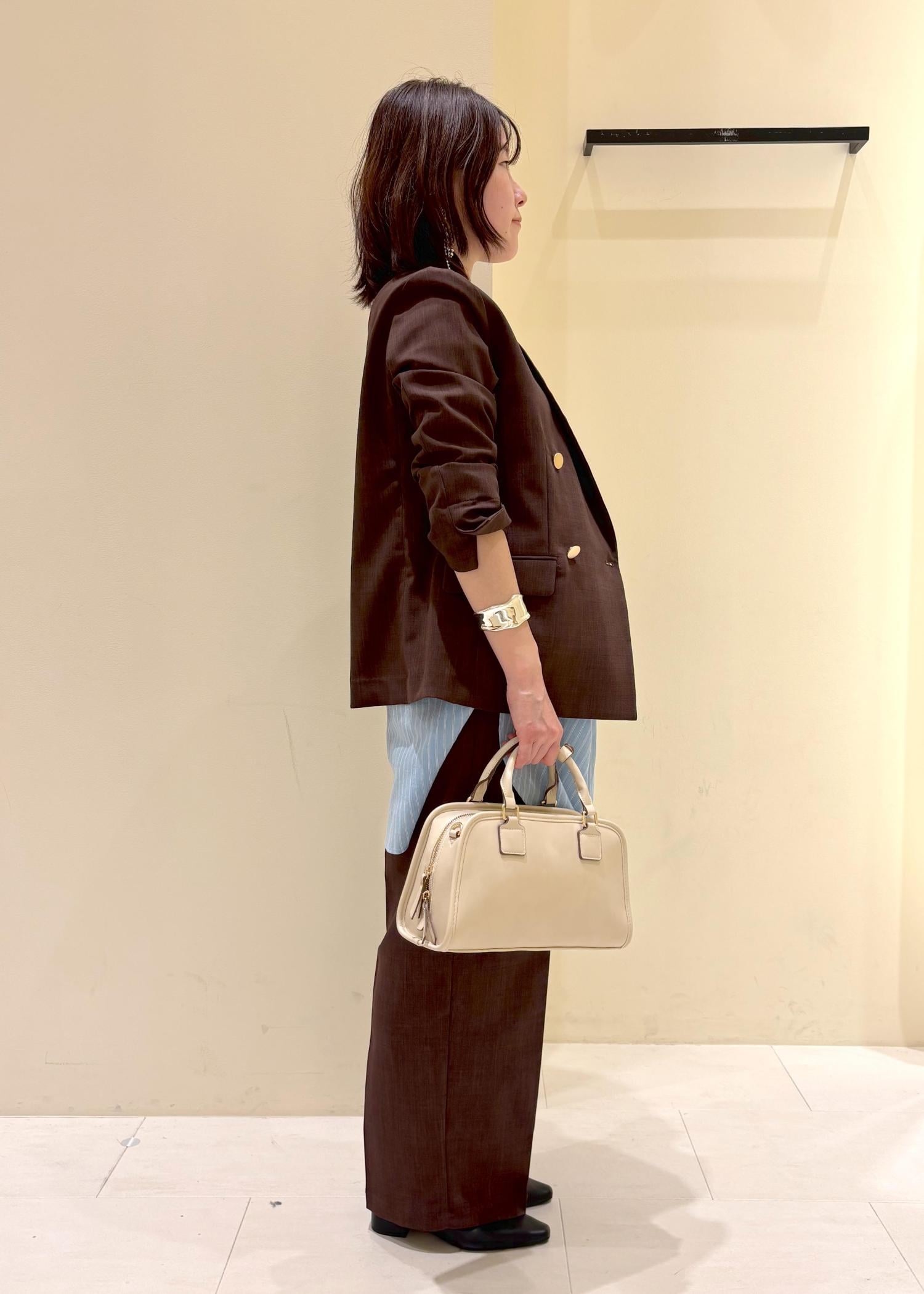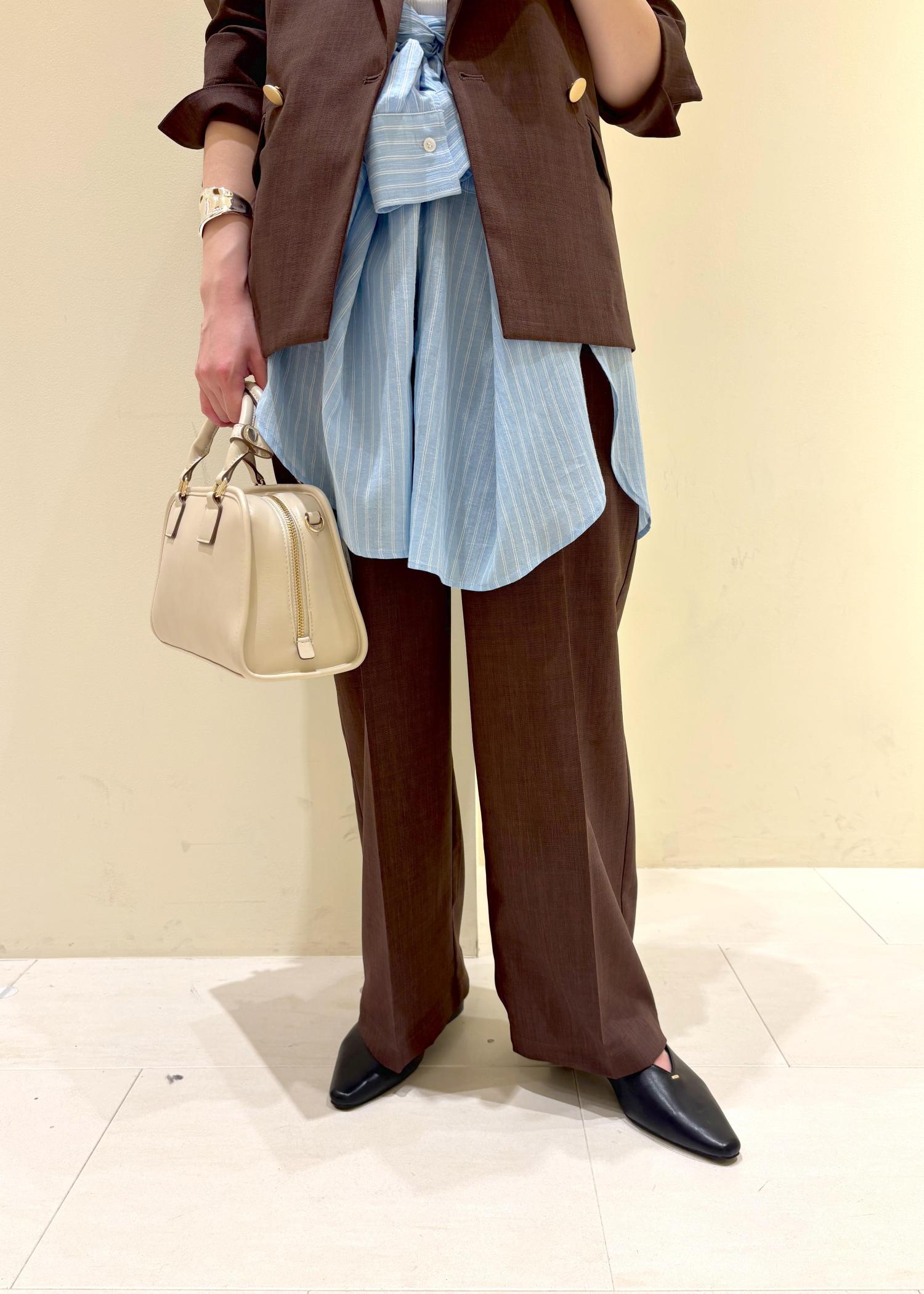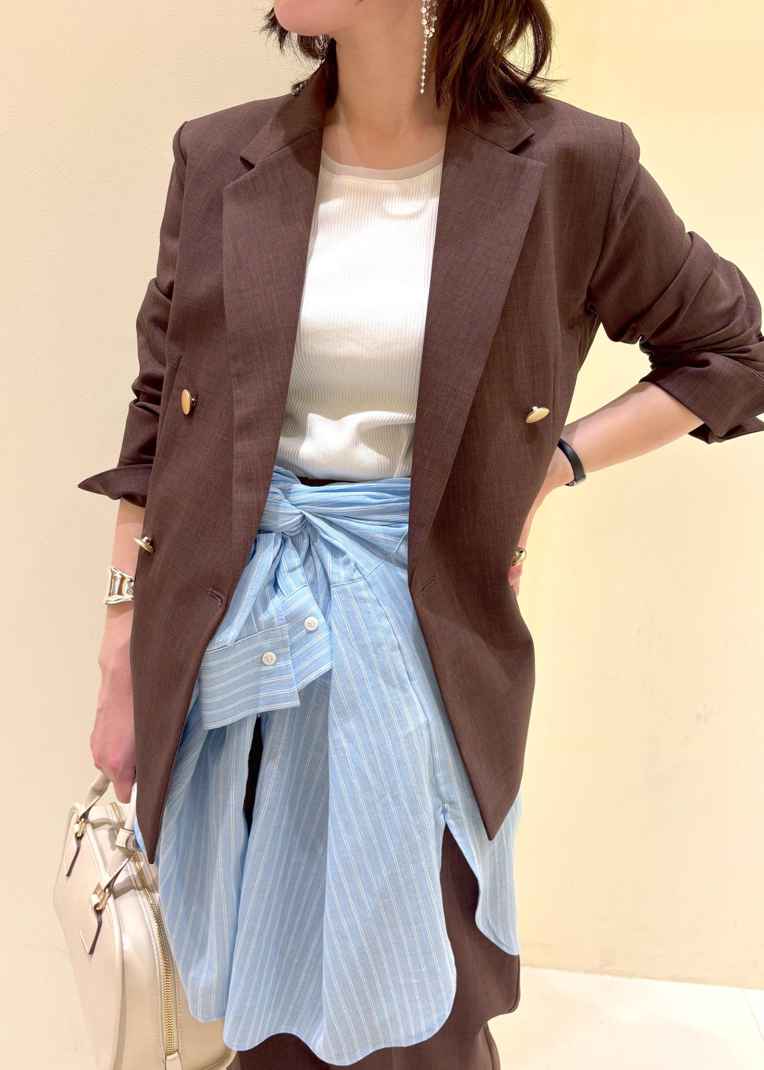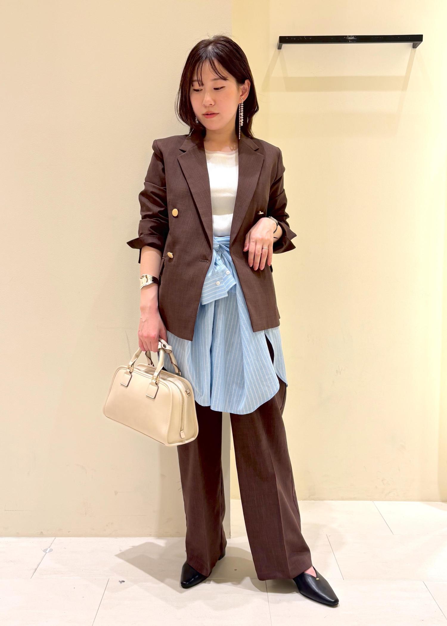 毎年大人気のCANAPAのセットアップコーデにシャツをプラスしてセットアップのきちっと感を抑えました♫今からの季節はインナーは半袖やタンクトップにシフトチェンジ。ブラウンは今季注目カラーです!