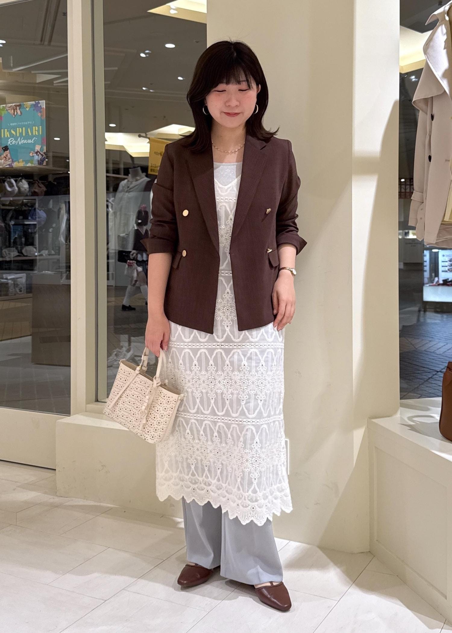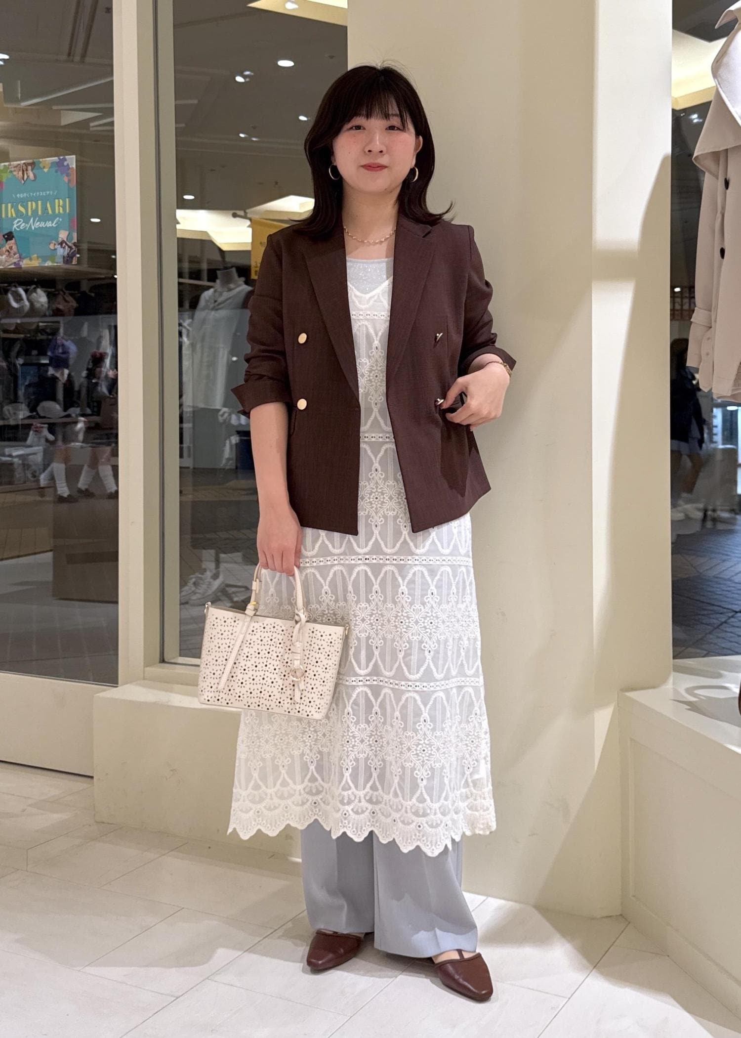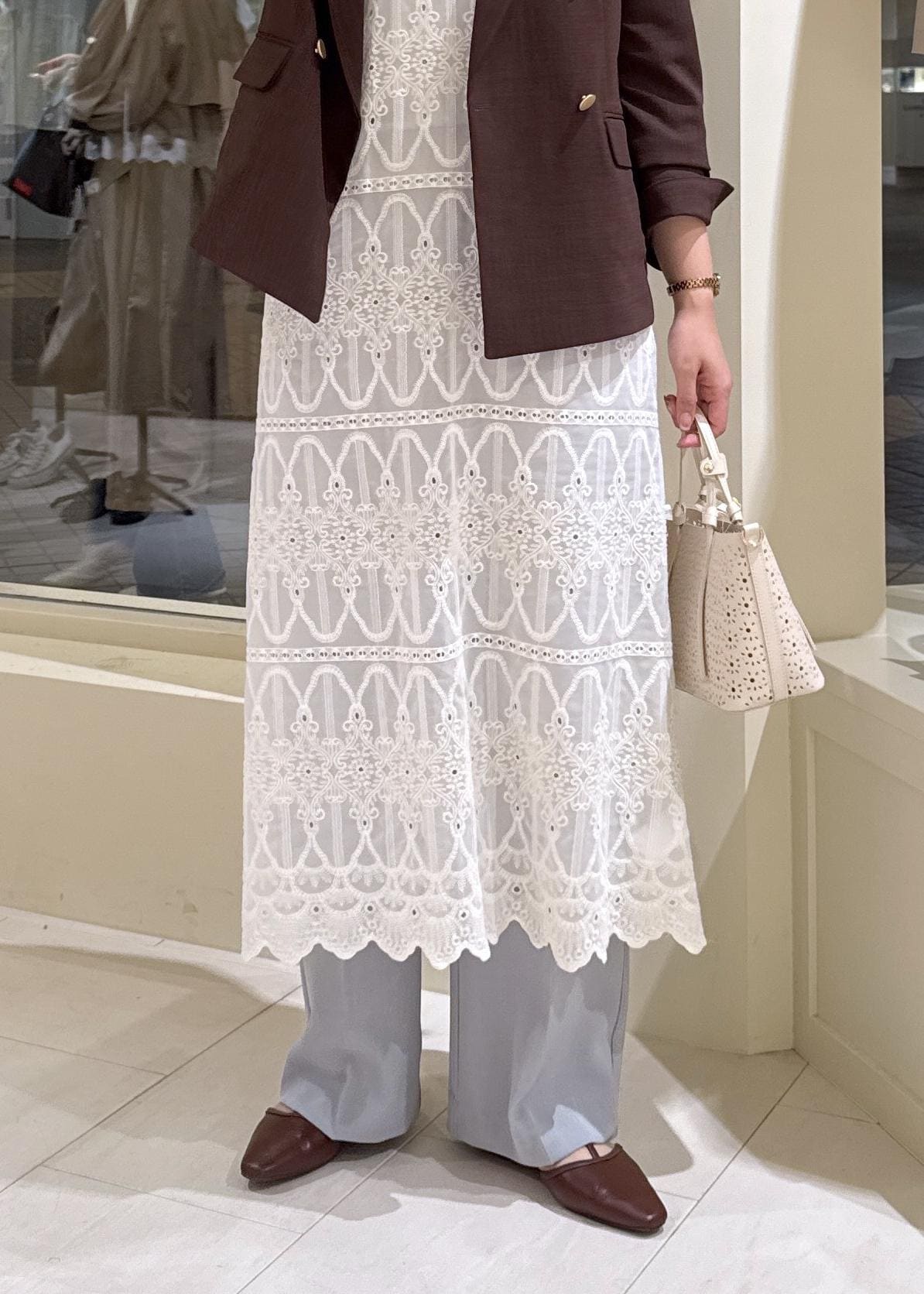 レースワンピ×ブラウンジャケット