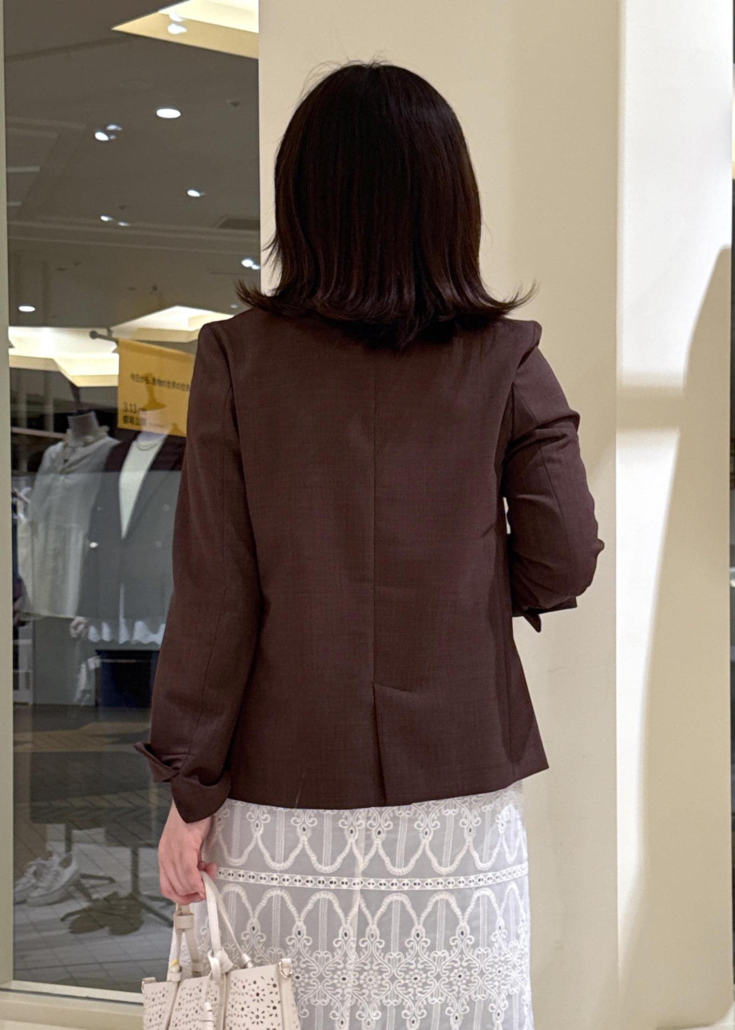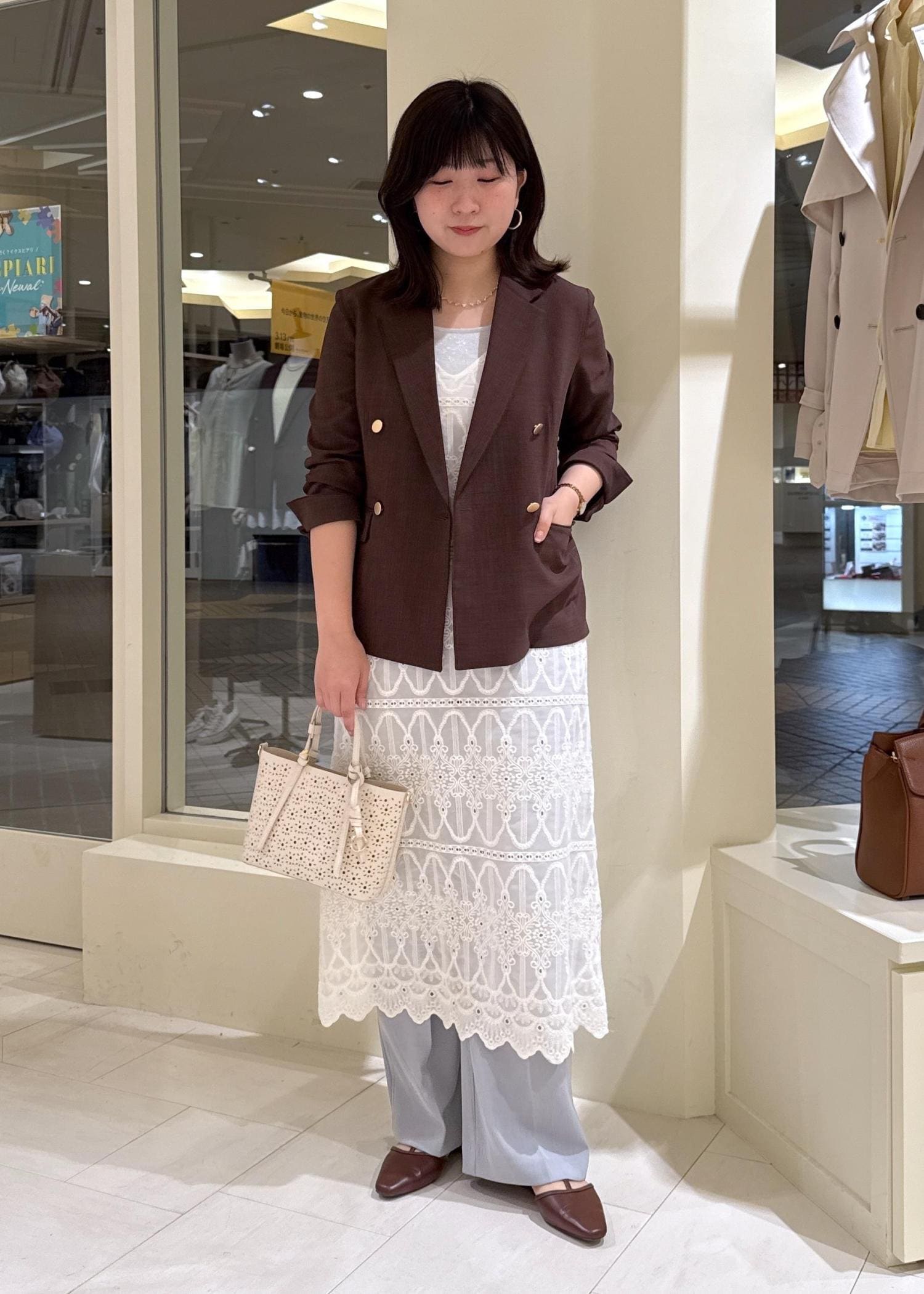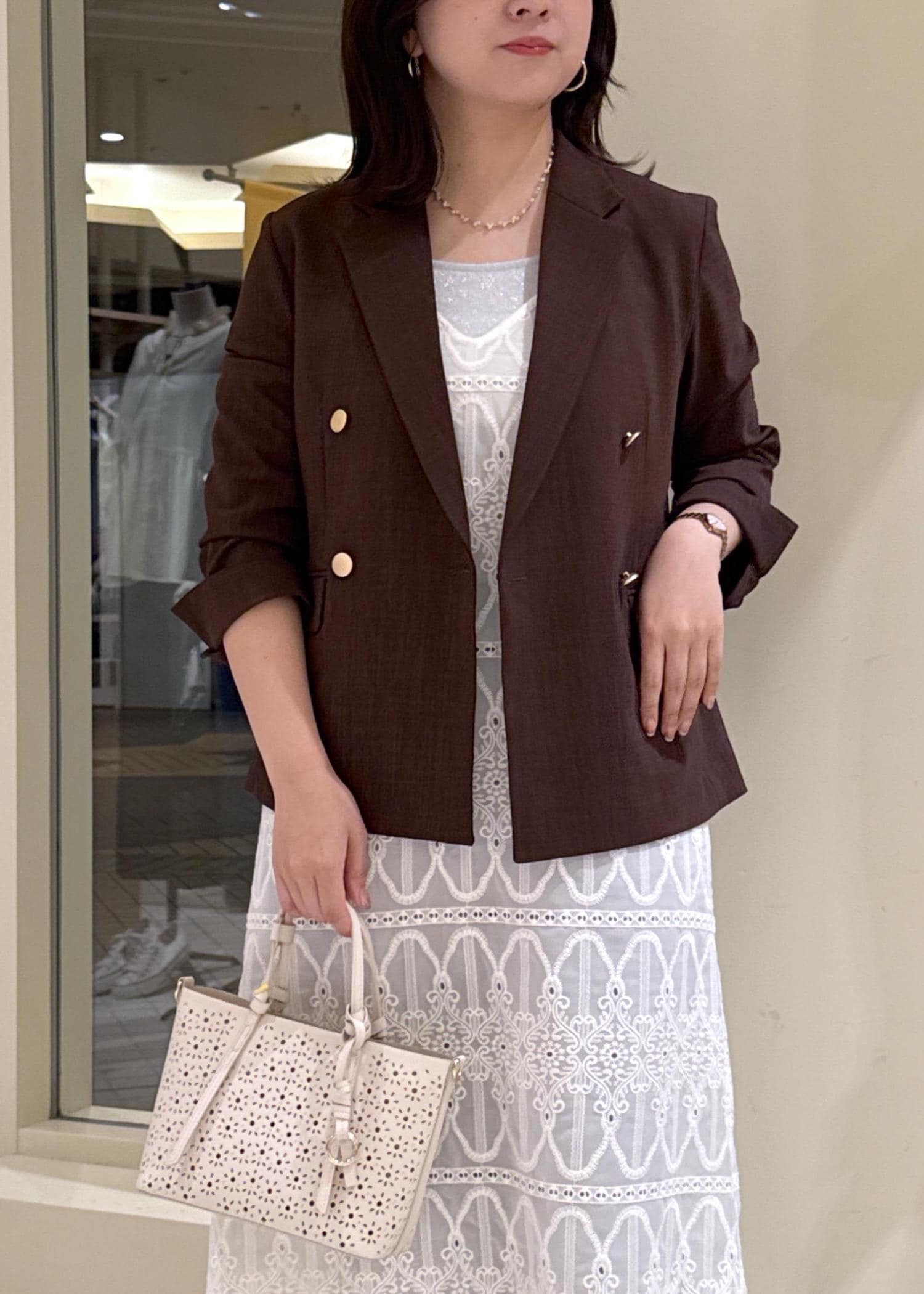 レースワンピ×ブラウンジャケット