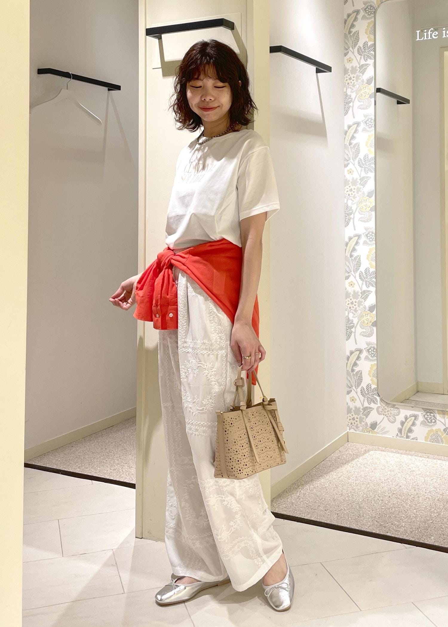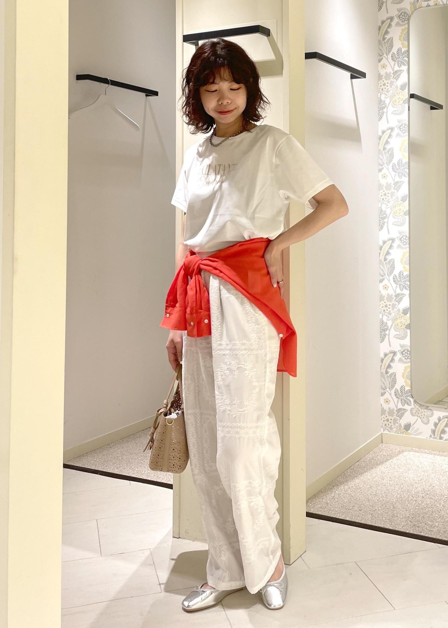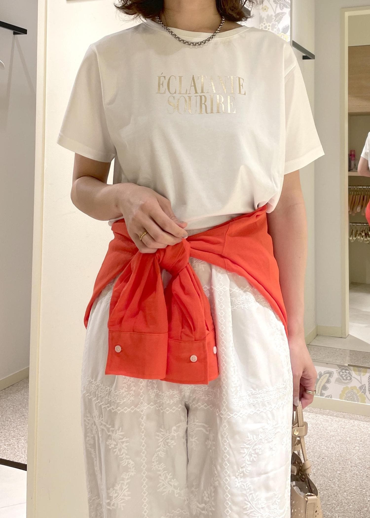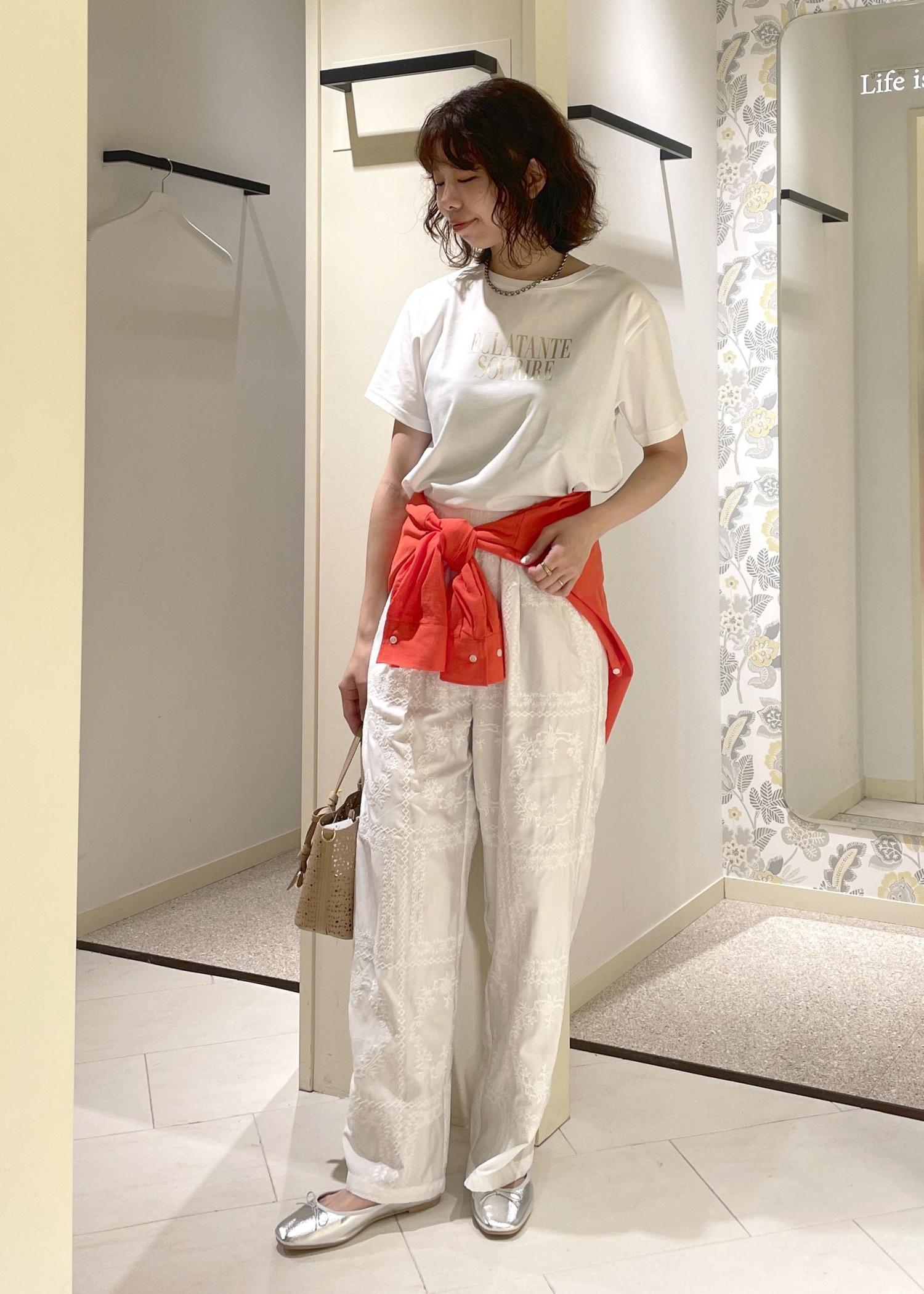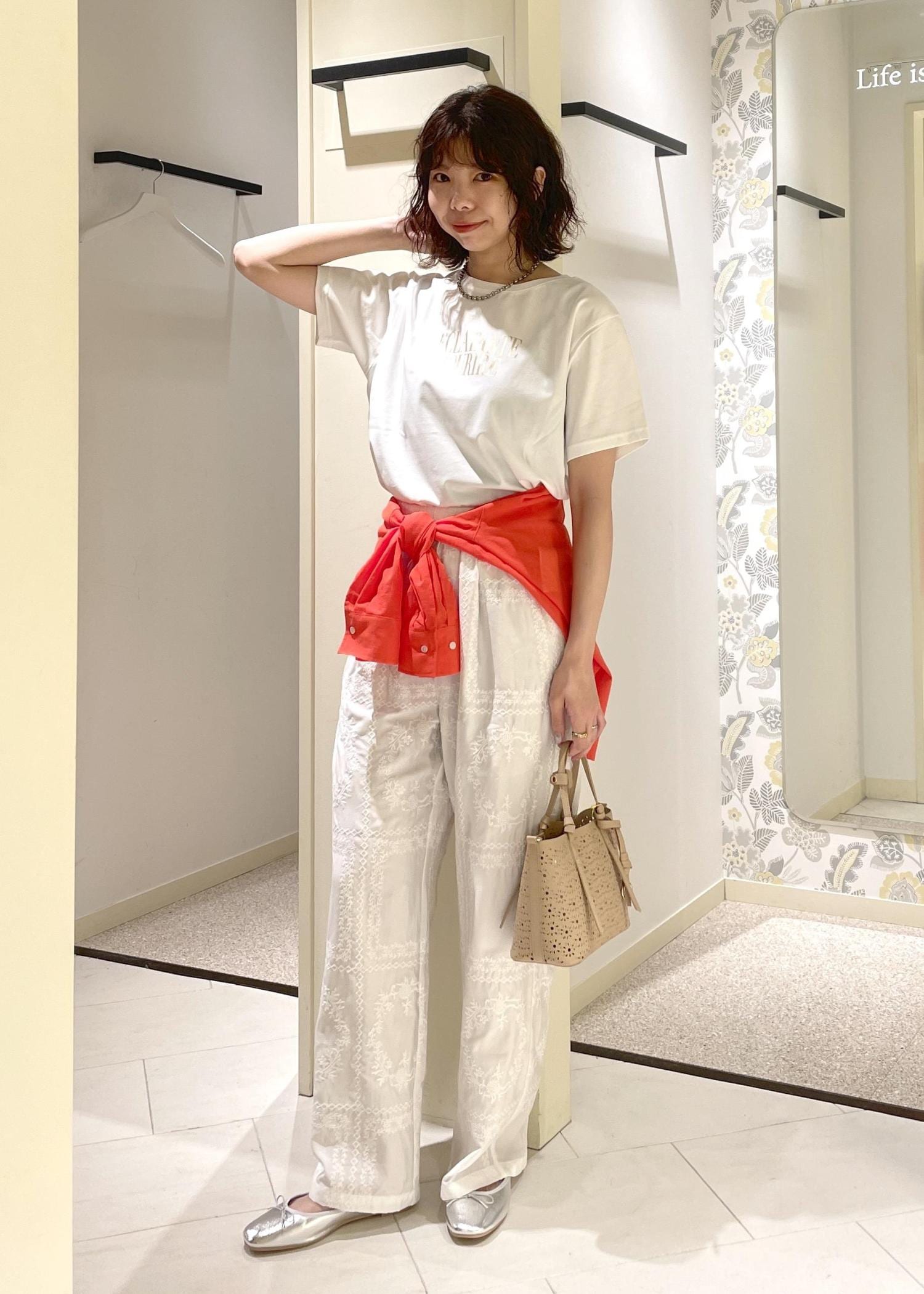 Tシャツ×レースパンツのワントーンコーデに、オレンジのシアーブラウスをアクセントに合わせた初夏にオススメのリラックスコーデ。