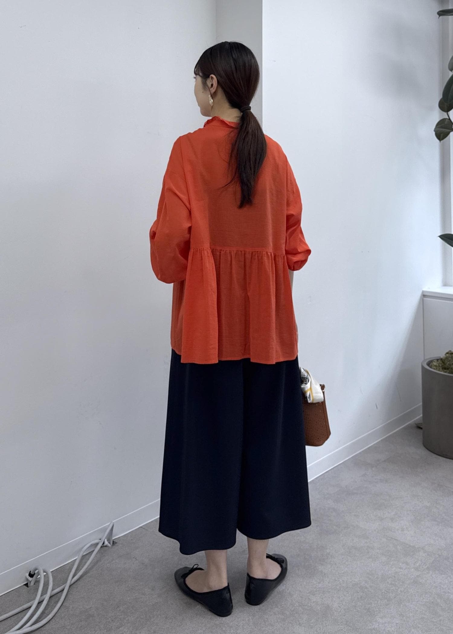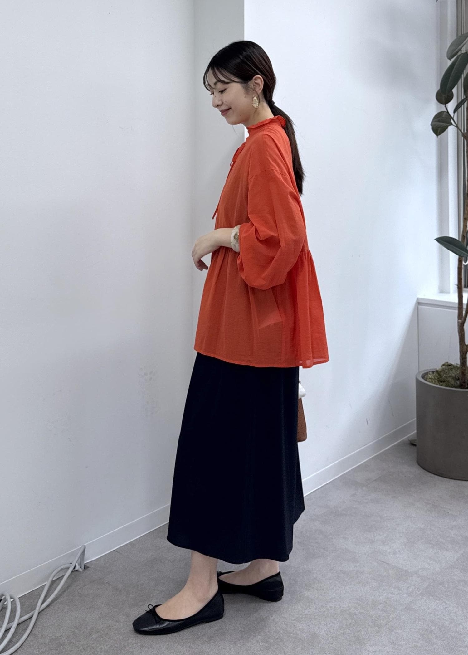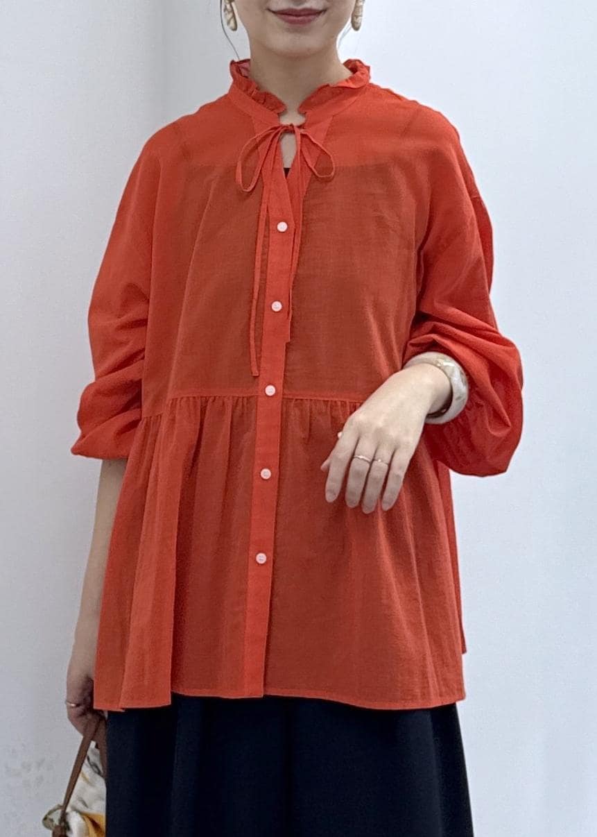ROPÉ PICNICお着軽シャツシリーズ フリルカラーシアーペプラムブラウス/接触冷感・通気性オレンジ / F¥4,994レビュー麺100ならではの柔らかさ・清涼感を感じられる1枚。お尻が隠れる着丈で安心感がありますが高めの切替えでバランス良く着られます◎そのまま着たり、ボタンを開けて羽織ったりと着こなしを楽しめるのも嬉しいポイント。