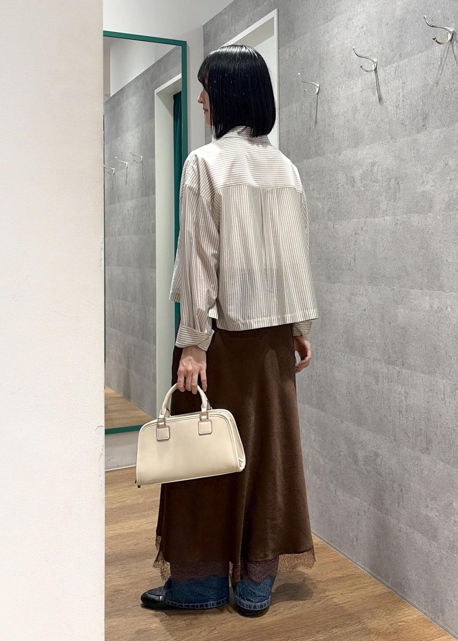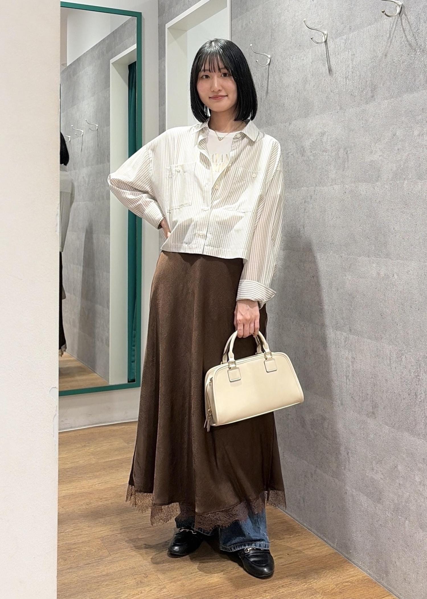 ボトムの色が暗めだったので、トップスは明るめにしてバランスをとりました。