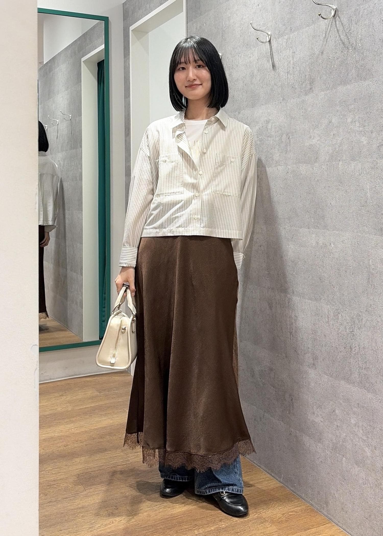 デニムにサテンスカートを重ねて、こなれ感のあるコーデにしました。