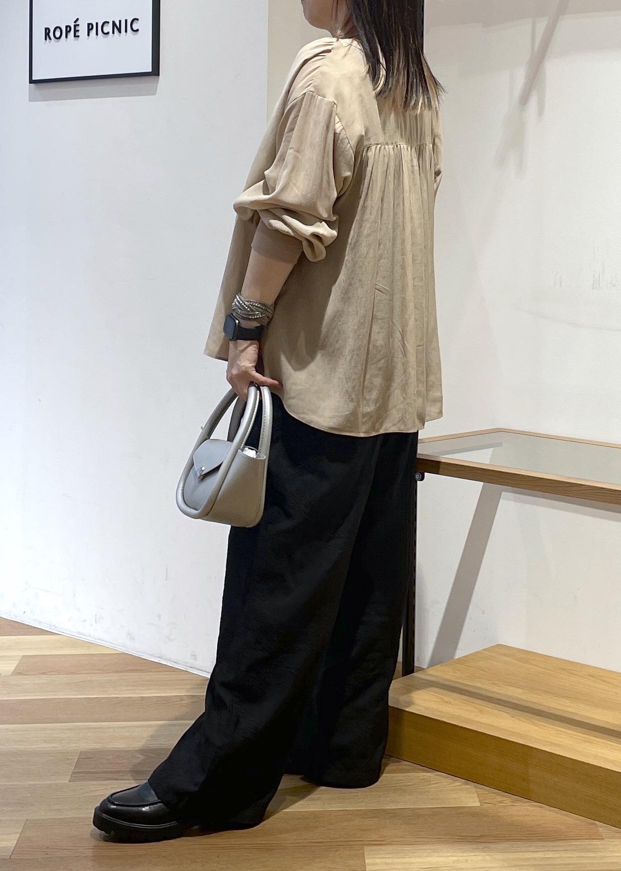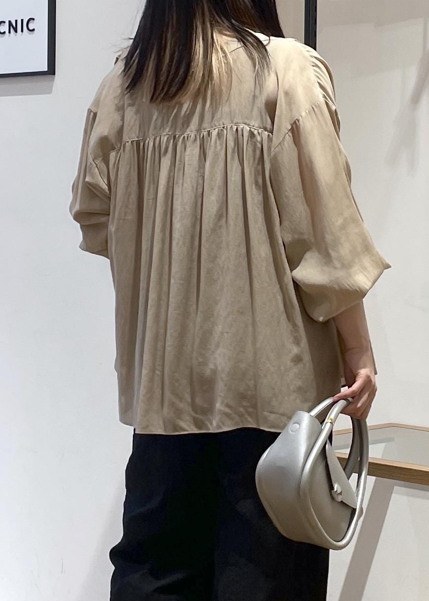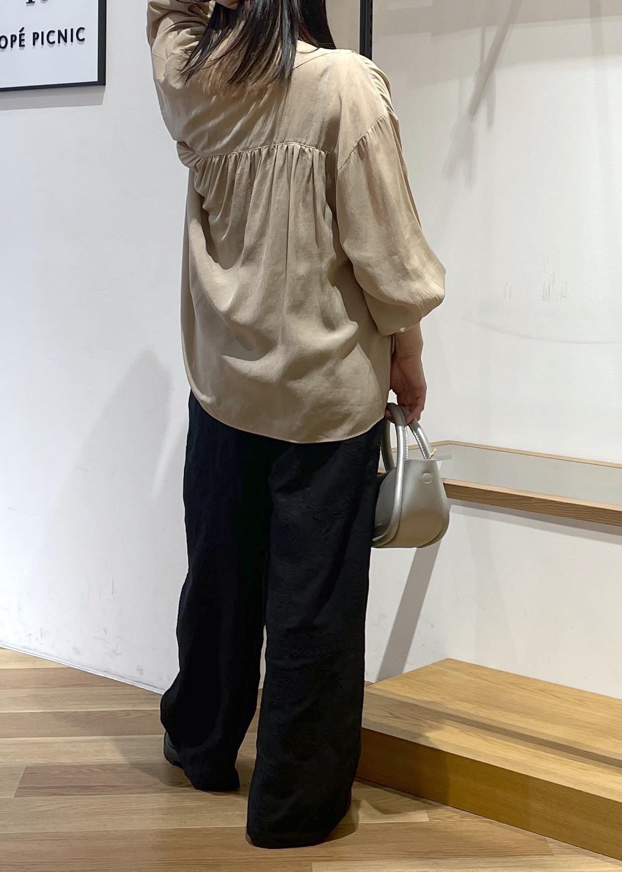 サラッとした着心地です。お袖はゆったりしておりストレスフリーで着用していただけます。袖口にはリブもついており袖まくりしていただくとふんわり可愛いです。