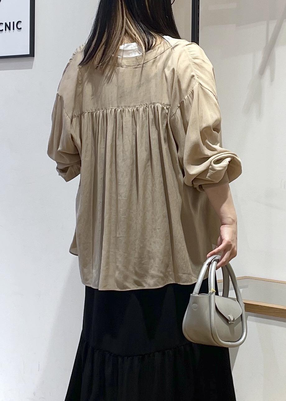 サラッとした着心地です。お袖はゆったりしておりストレスフリーで着用していただけます。袖口にはリブもついており袖まくりしていただくとふんわり可愛いです。