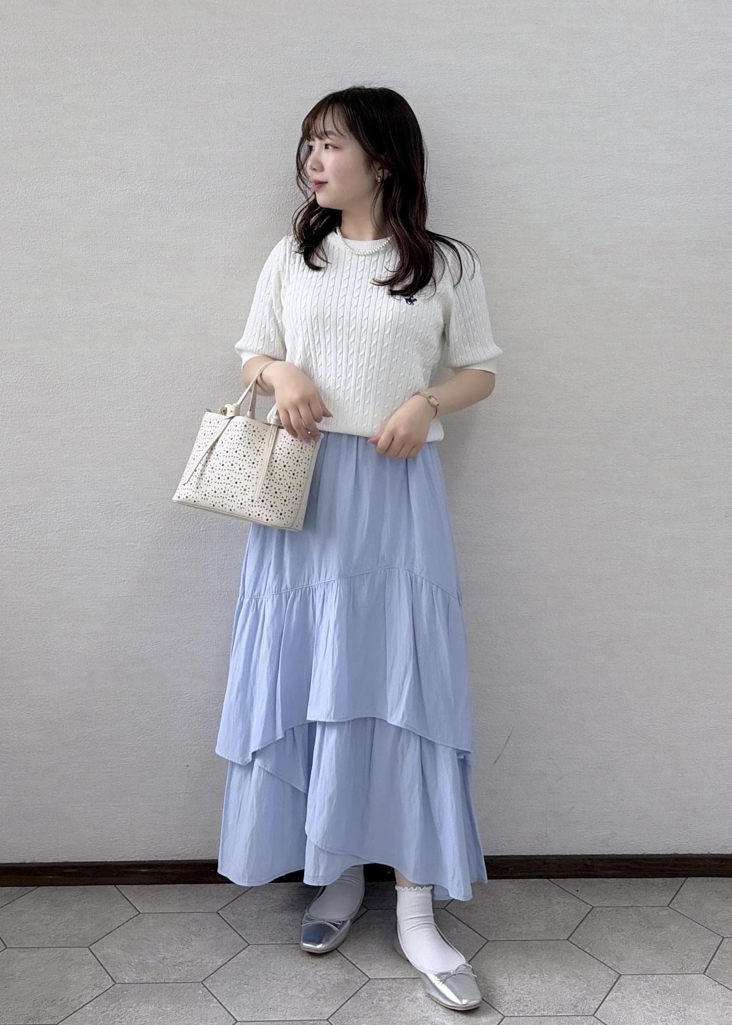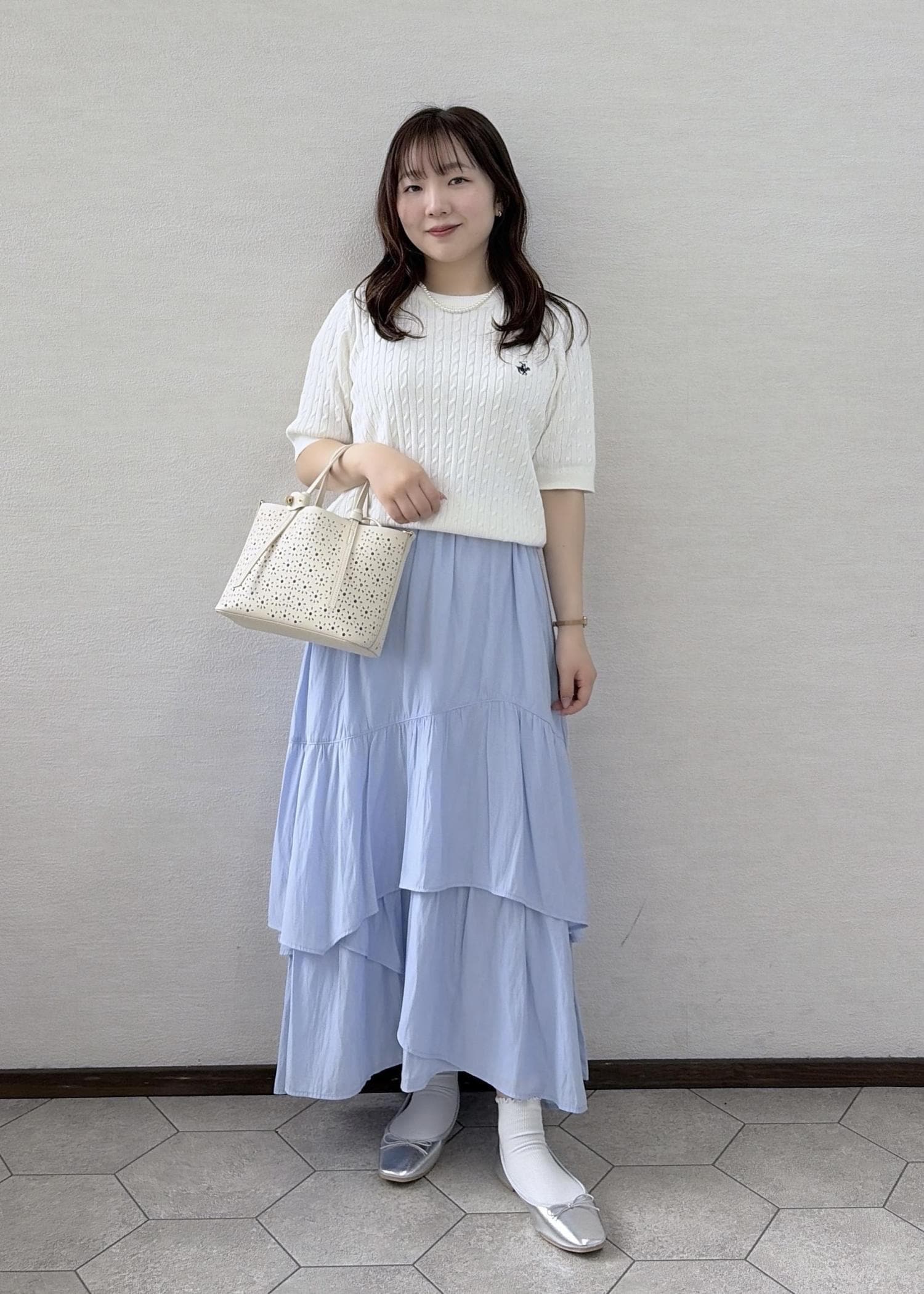 お花畑に着て行きたくなるような爽やかなコーデにしました!ホワイトにブルーやシルバーを合わせて柔らかい印象に◎