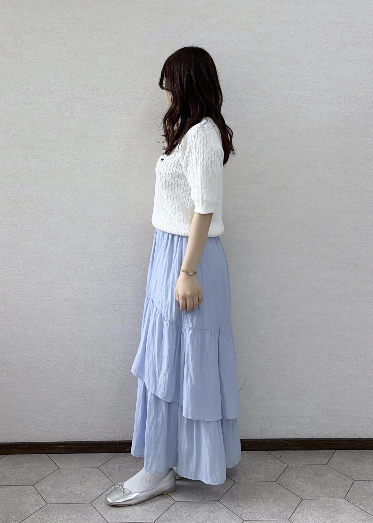 デザイン性のあるスカートなのでシンプルにTシャツ合わせも可愛いです!シューズでカジュアルダウンさせるのもおすすめです!