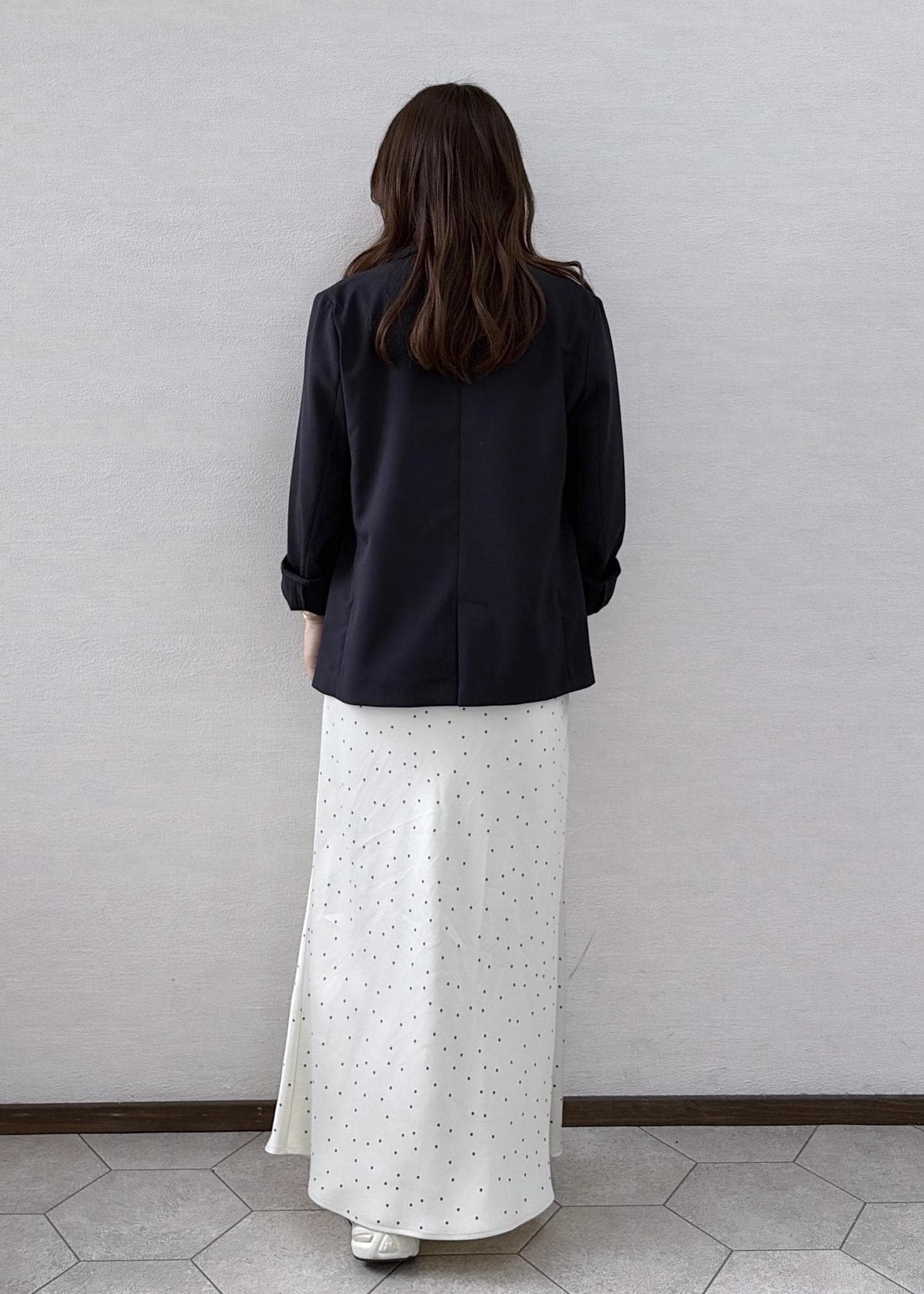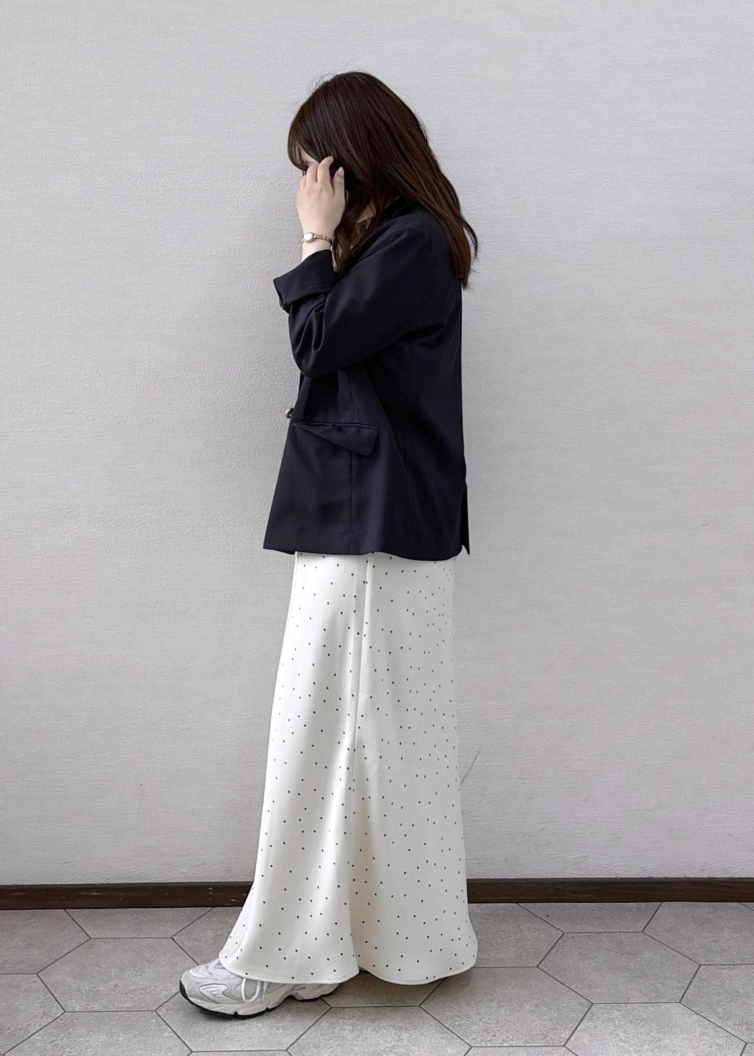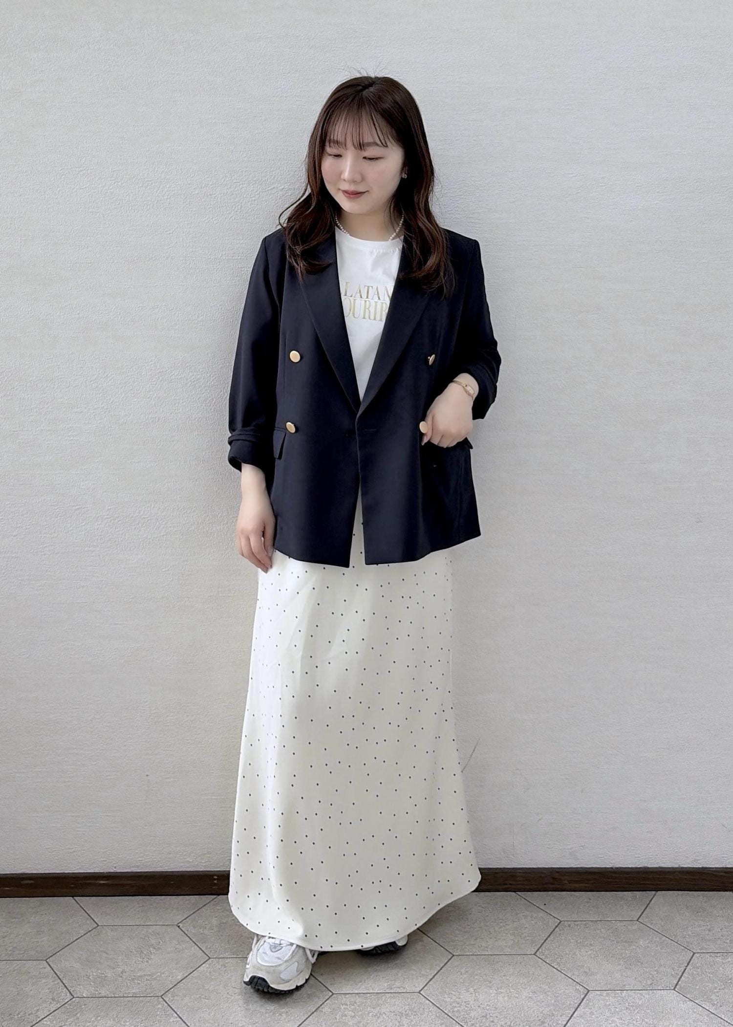 厚みのあるジャケットだと上半身がゴツく見えてしまうのですが、こちらはサラッとしていて薄めの生地なのにしっかりとしたジャケットの形が華奢さを出してくれます!
