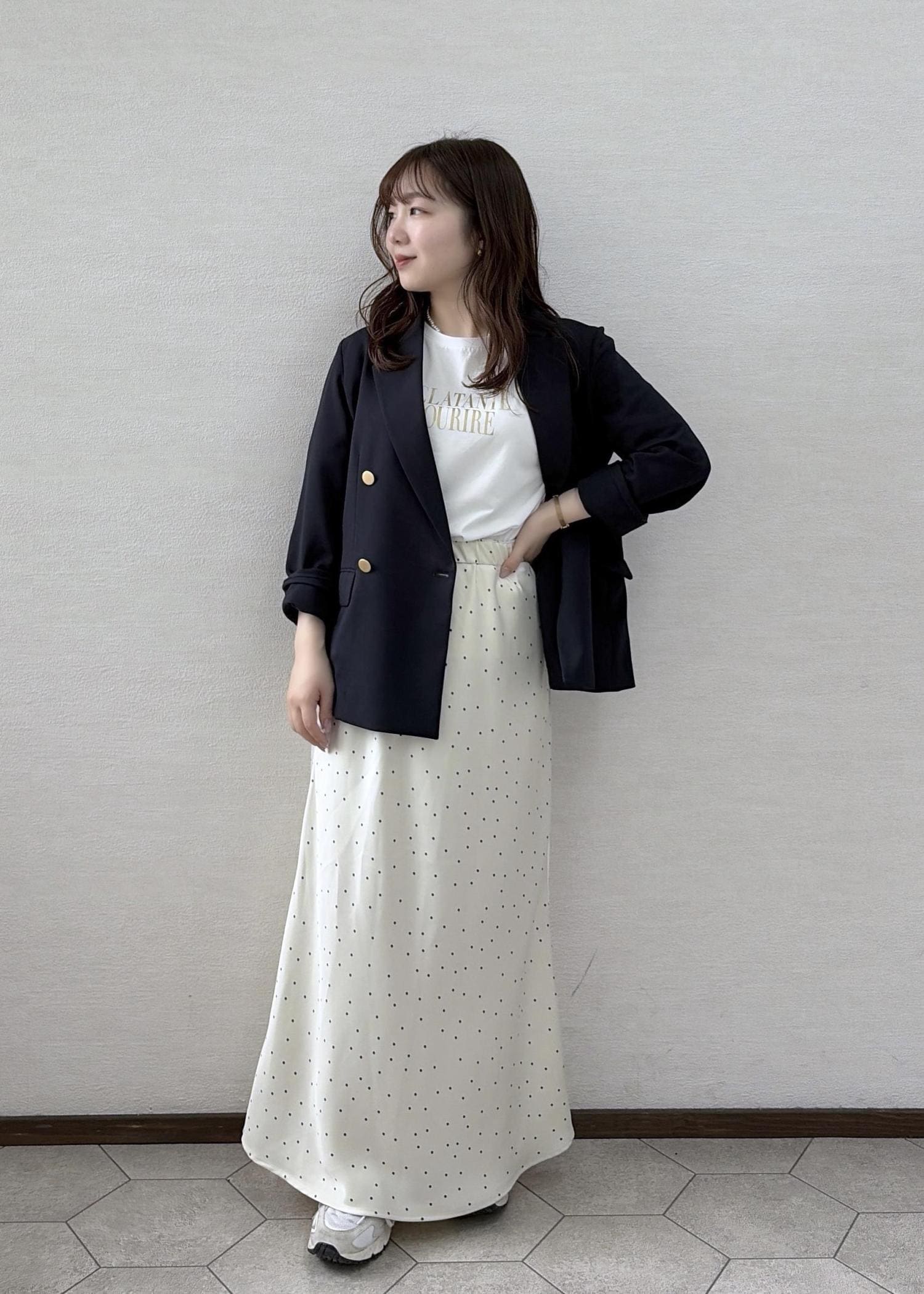 トレンドのドット柄スカートで綺麗めカジュアルなカフェコーデにしました!