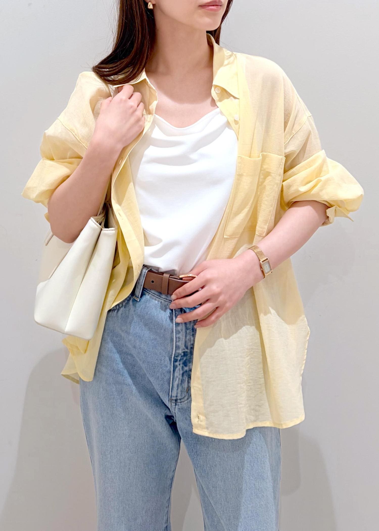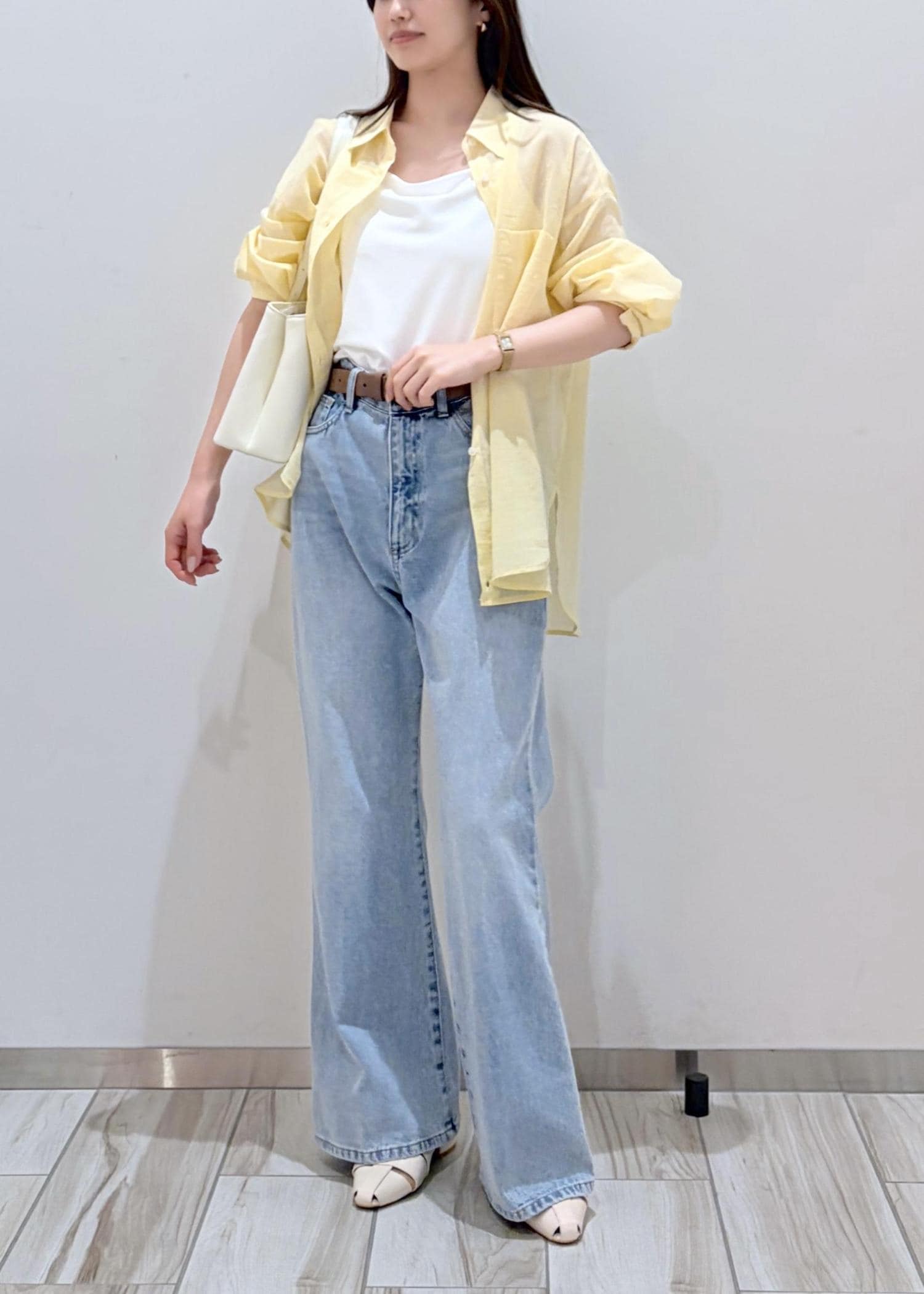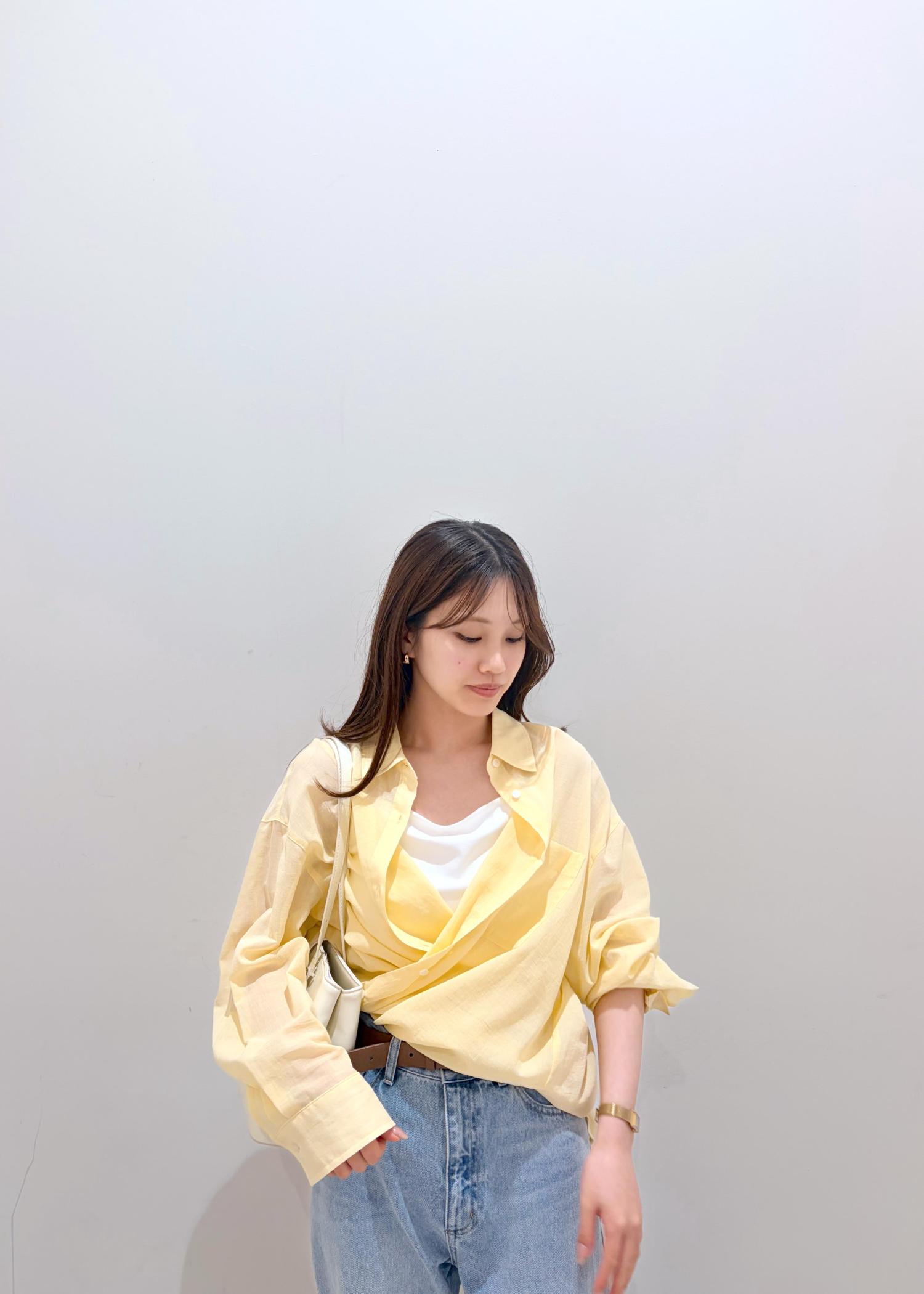 明るめなイエローシャツを夏らしい色味のデニムと合わせてシンプル&爽やかなコーデにしてみました。インナーと小物は白合わせで軽さと統一感をだし、夏らしいスタイリングに。
