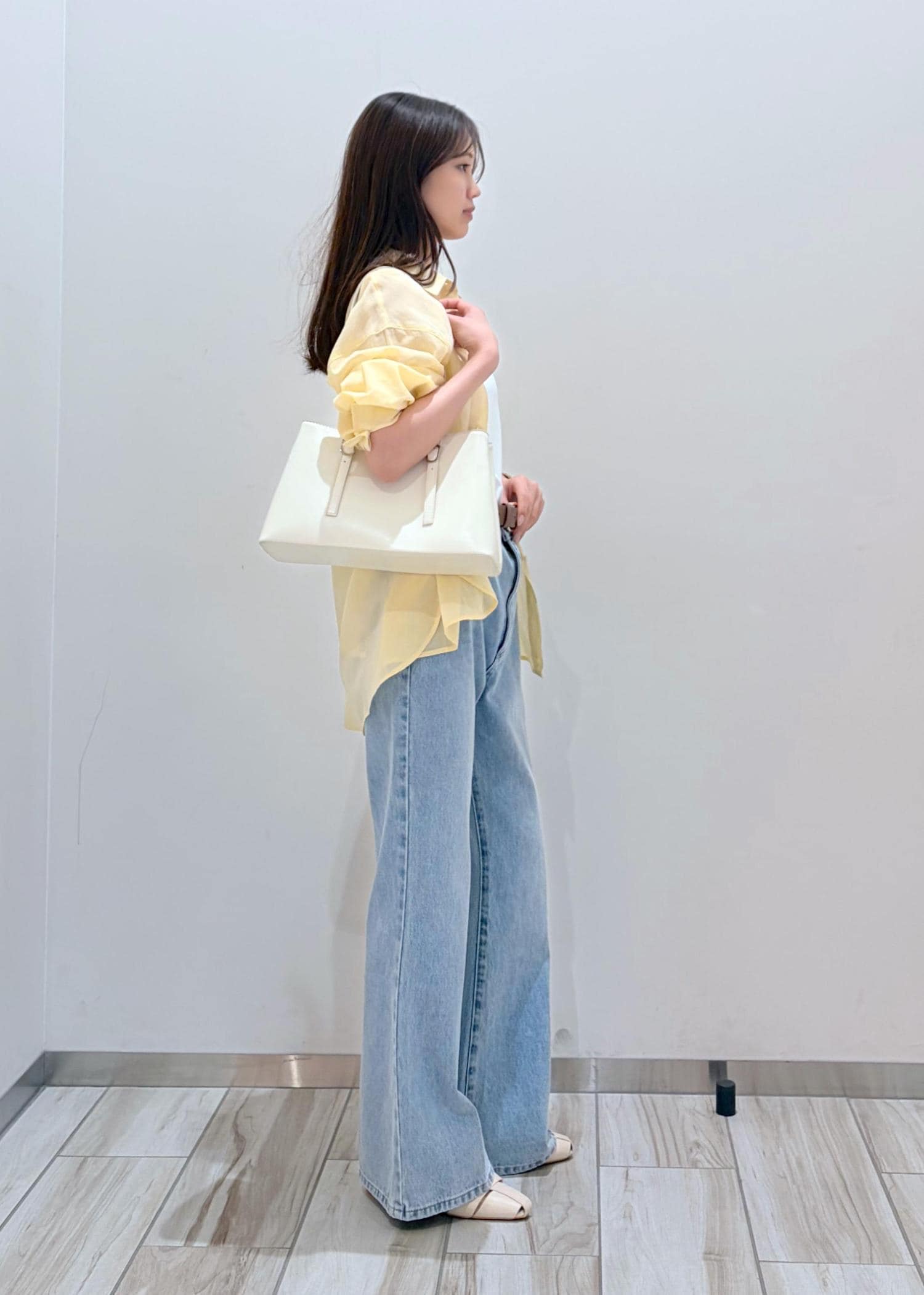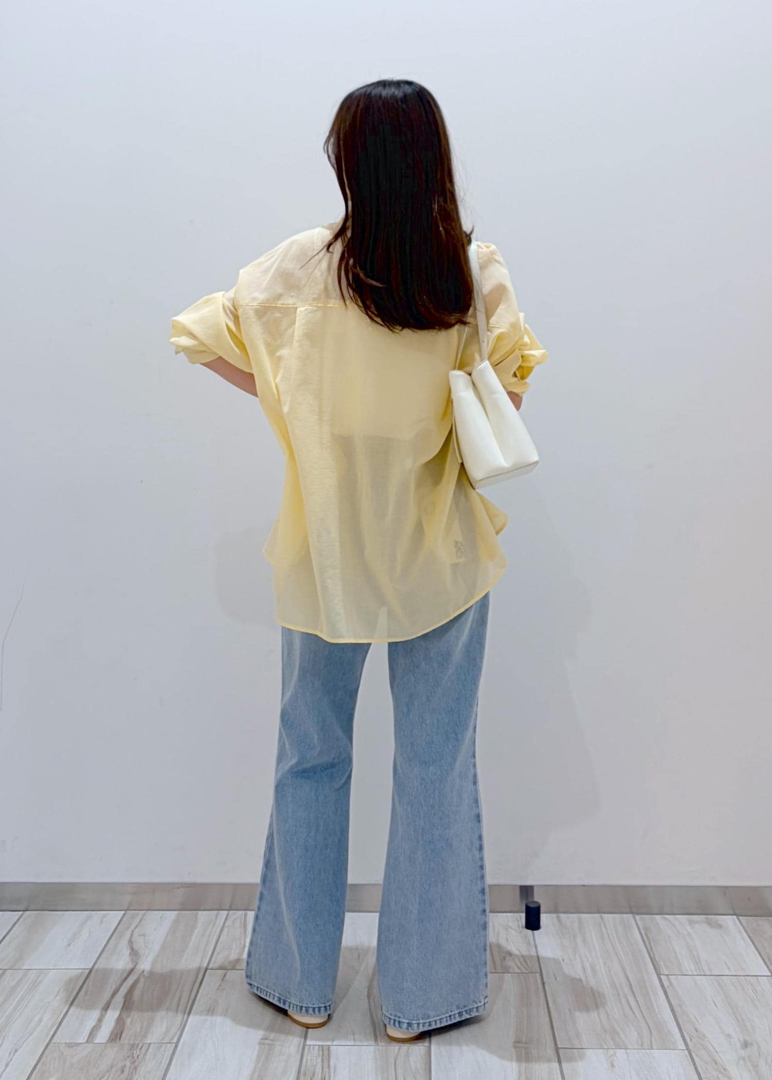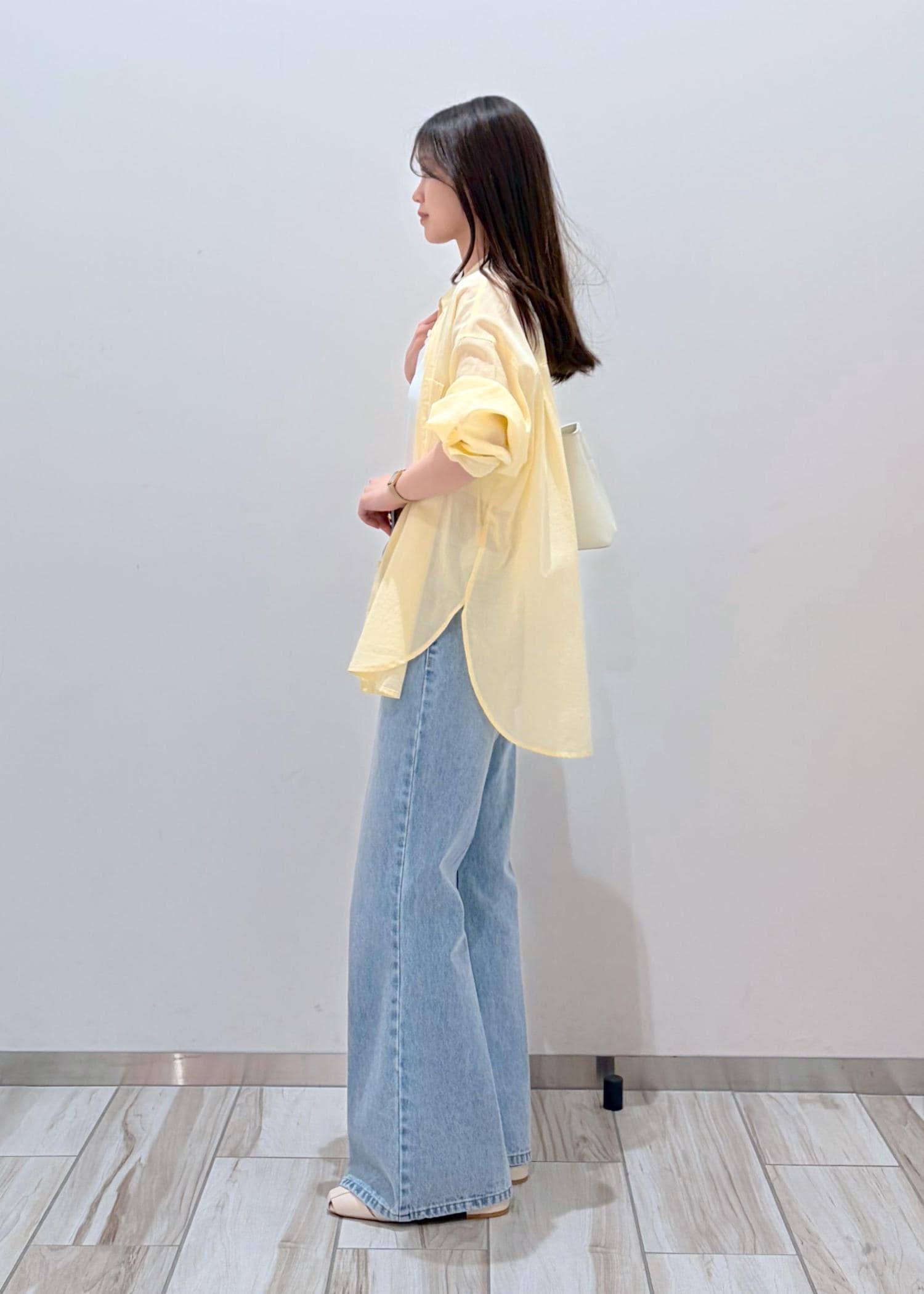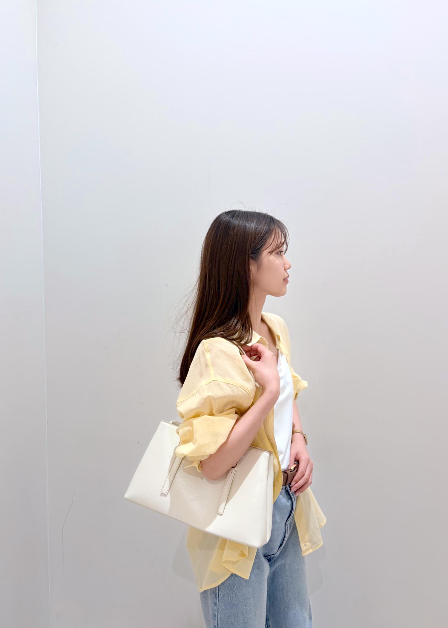 明るめなイエローシャツを夏らしい色味のデニムと合わせてシンプル&爽やかなコーデにしてみました。インナーと小物は白合わせで軽さと統一感をだし、夏らしいスタイリングに。