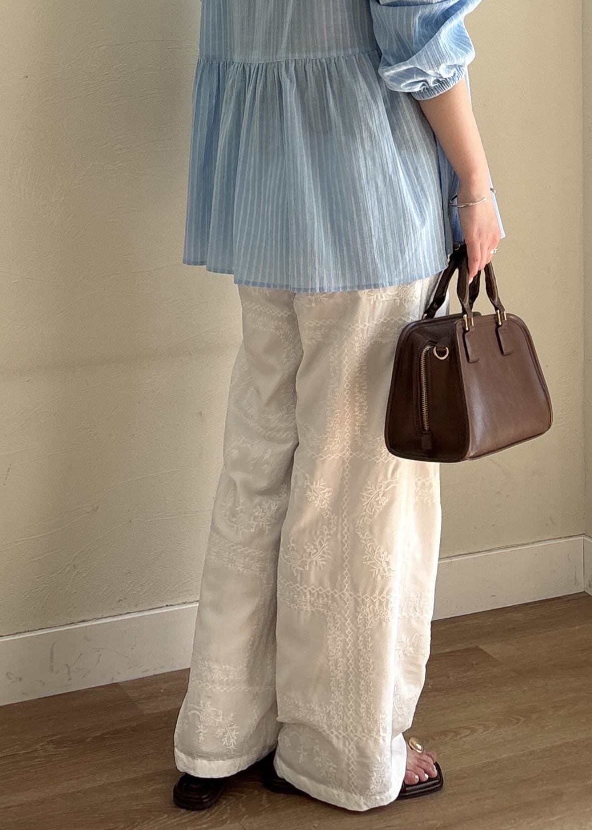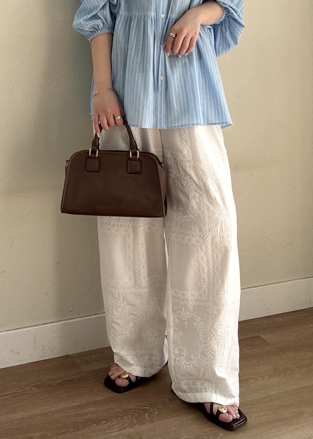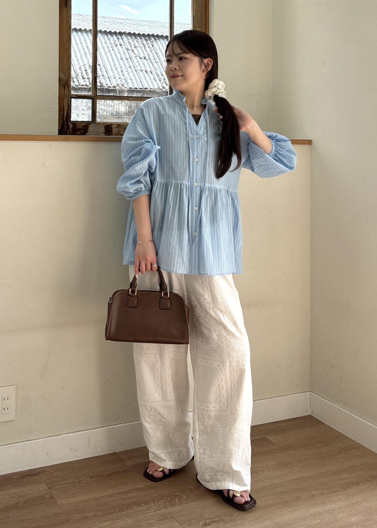 ブルー×ホワイトの爽やかな色合わせに、小物はブラウンでまとめてみました。さらりと着られる初夏のお出かけコーデです。