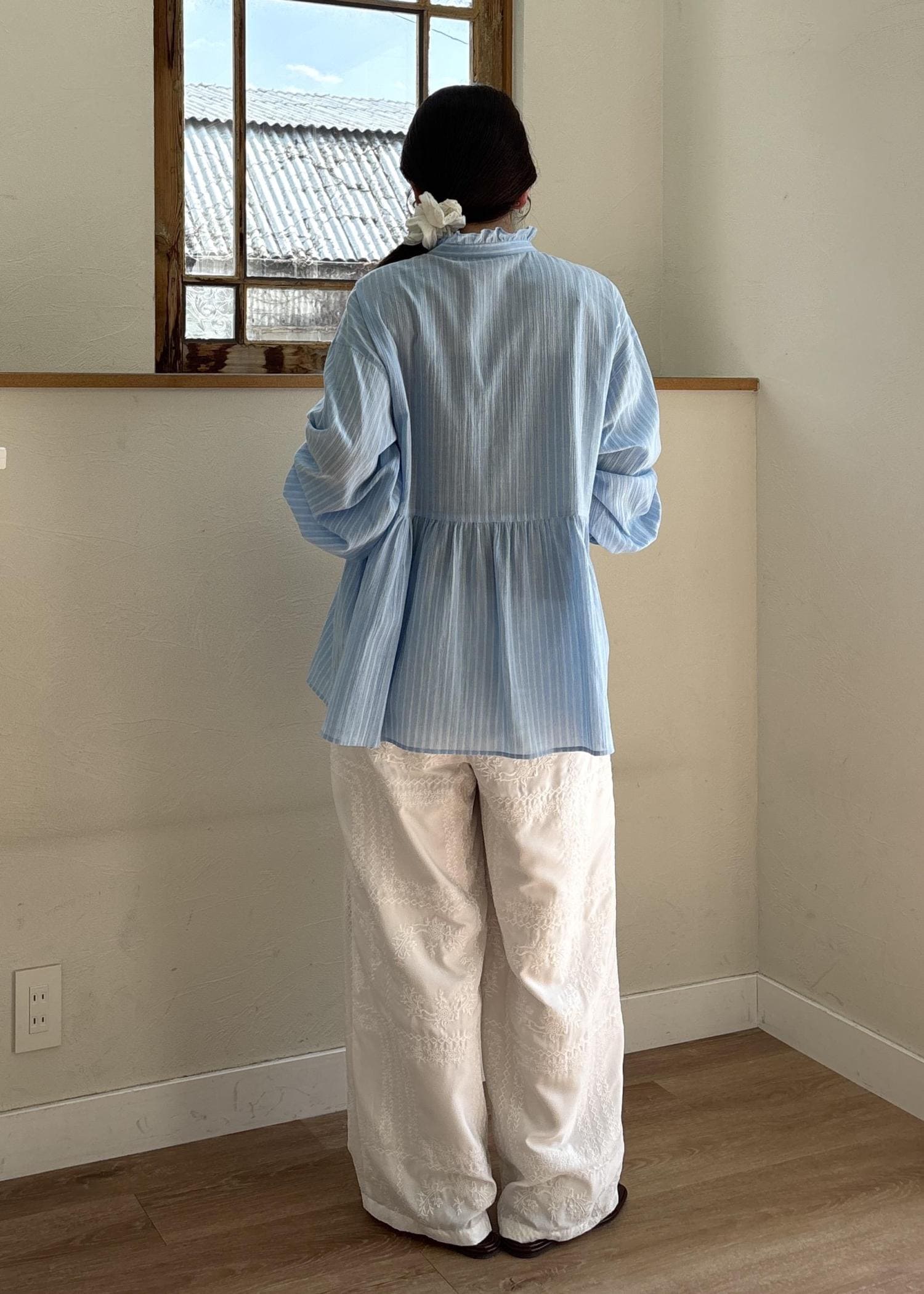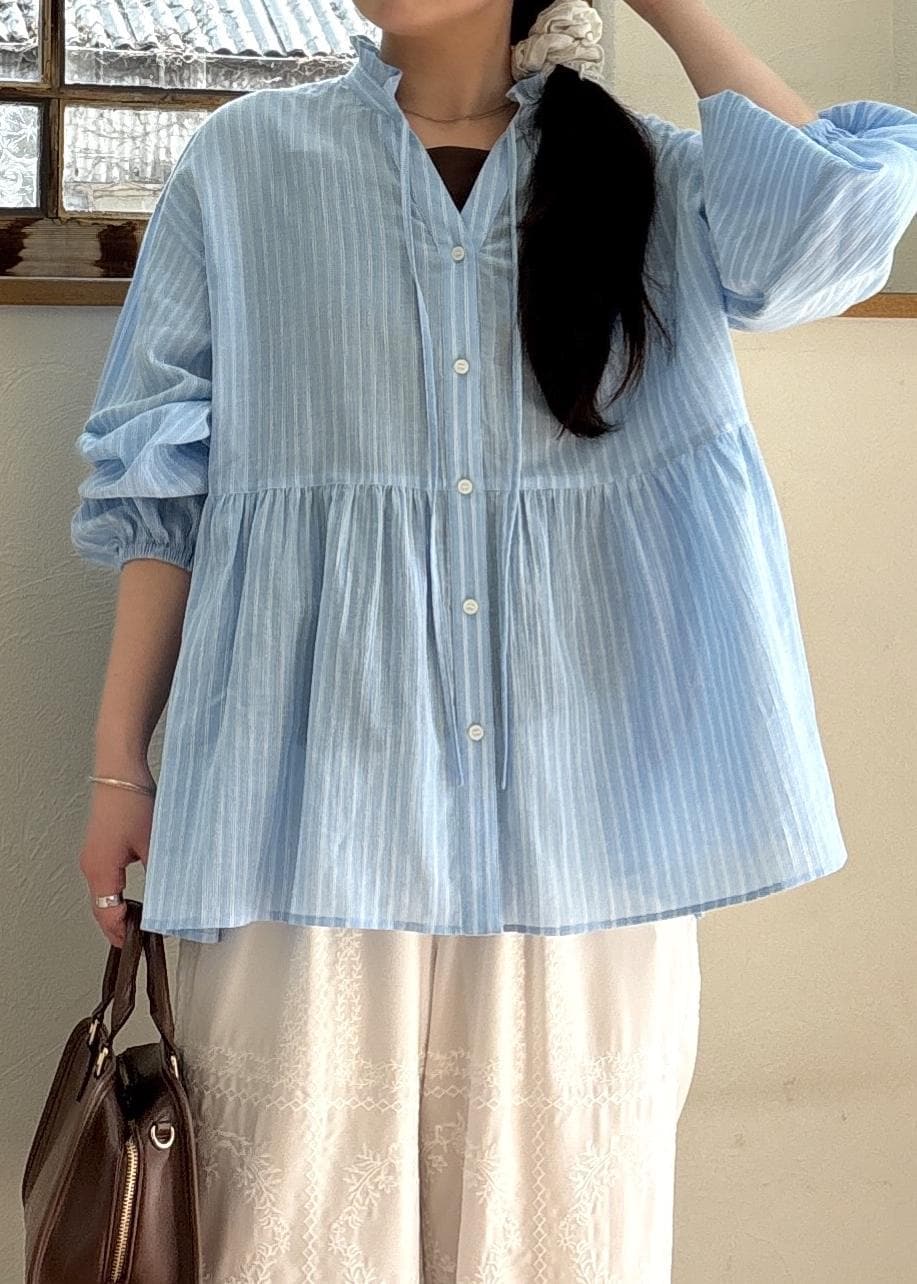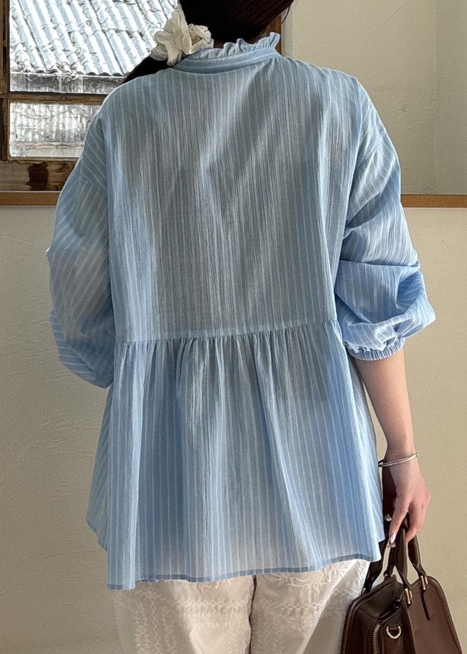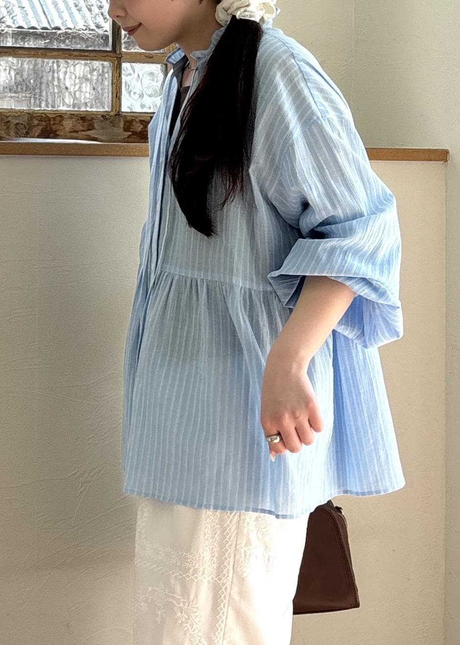 ROPÉ PICNICお着軽シャツシリーズ フリルカラーシアーペプラムブラウス/接触冷感・通気性ブルー系 / F¥4,994レビュー161cm/Fサイズ着用でヒップ半分くらいが隠れる着丈でした。サラッと肌離れの良い素材で、一枚着でも羽織りでも重宝するアイテム。ふんわり広がるペプラムシルエットは、高めに位置に切り替えがあるので膨張感なく体型カバーが叶います。