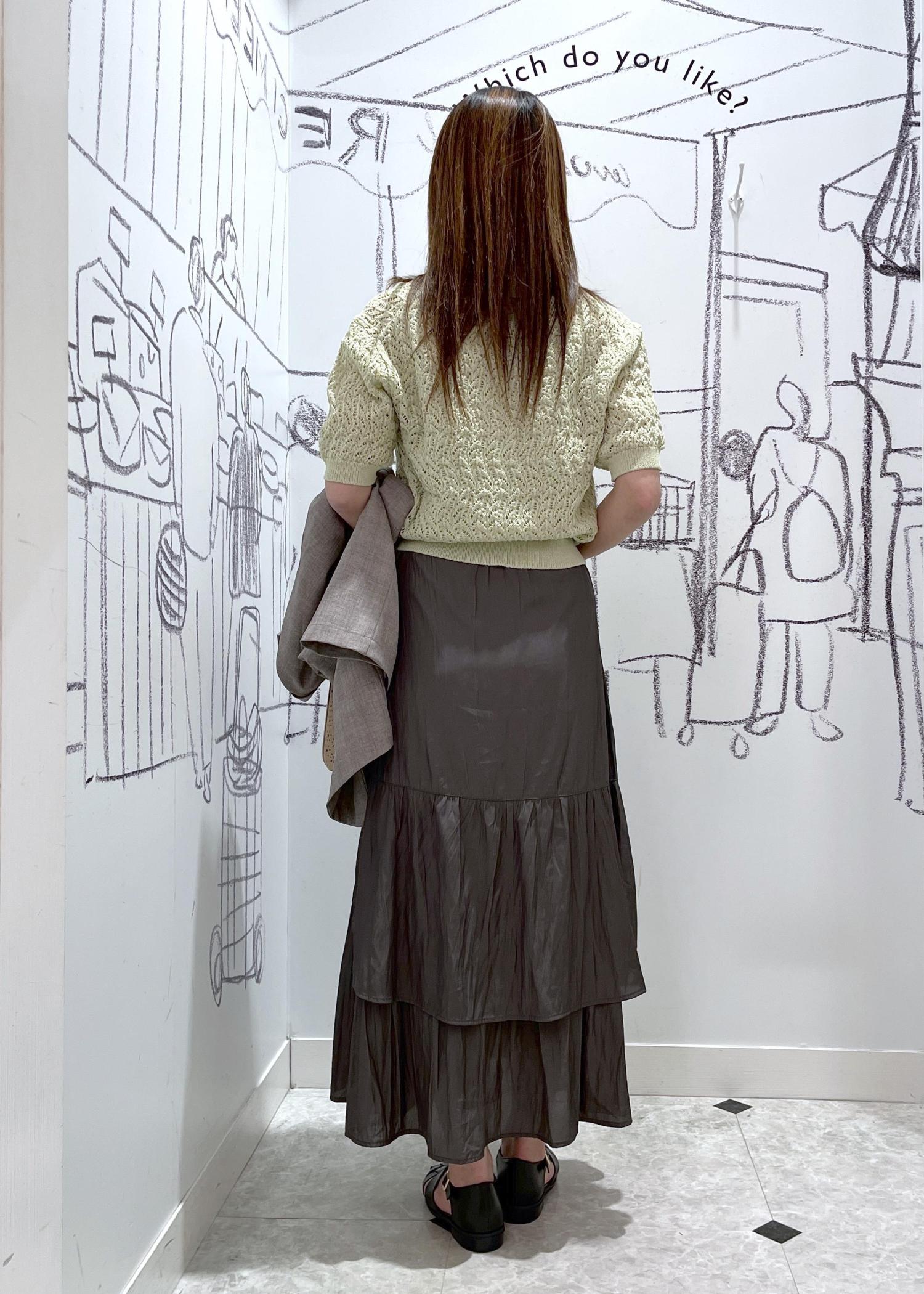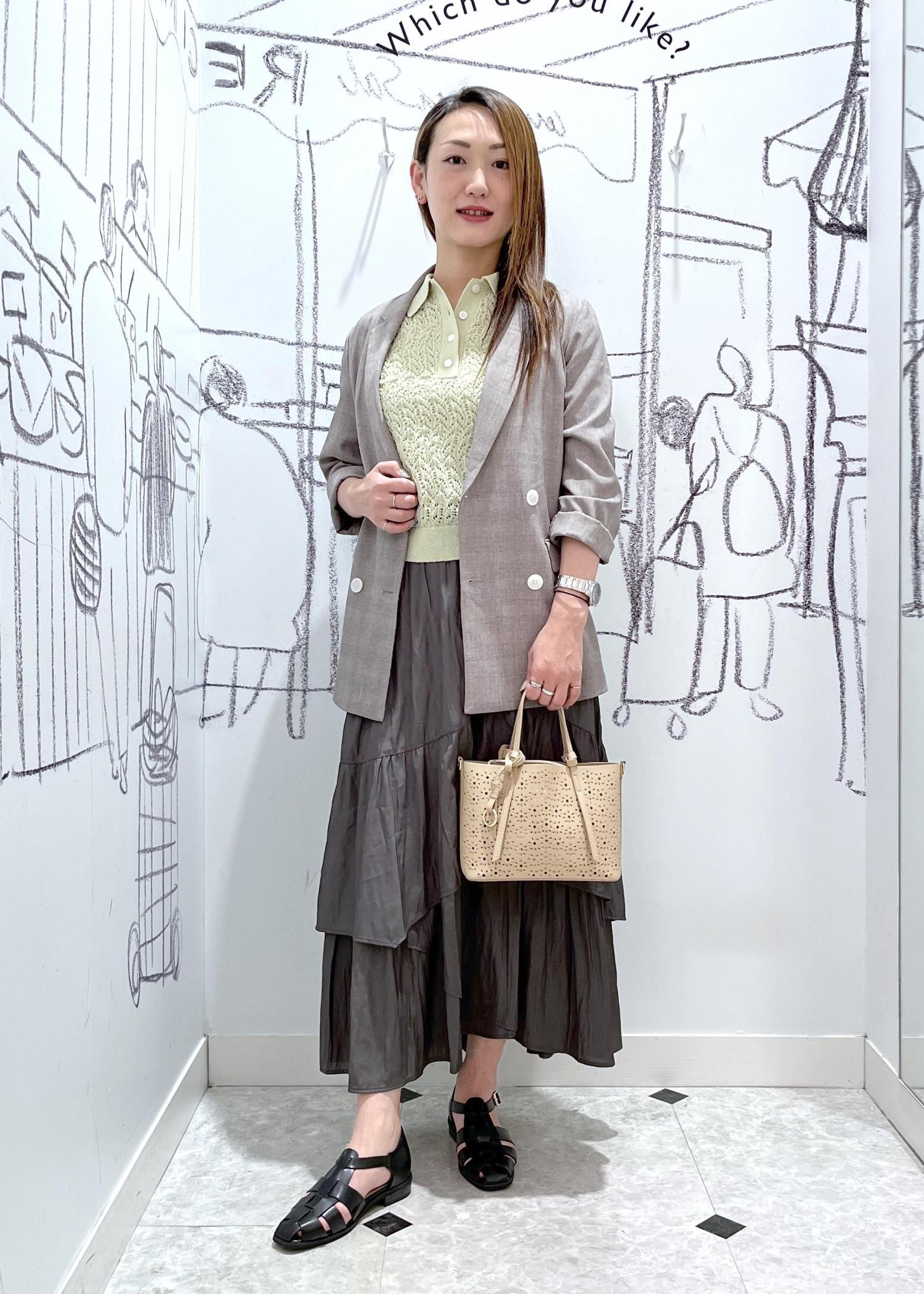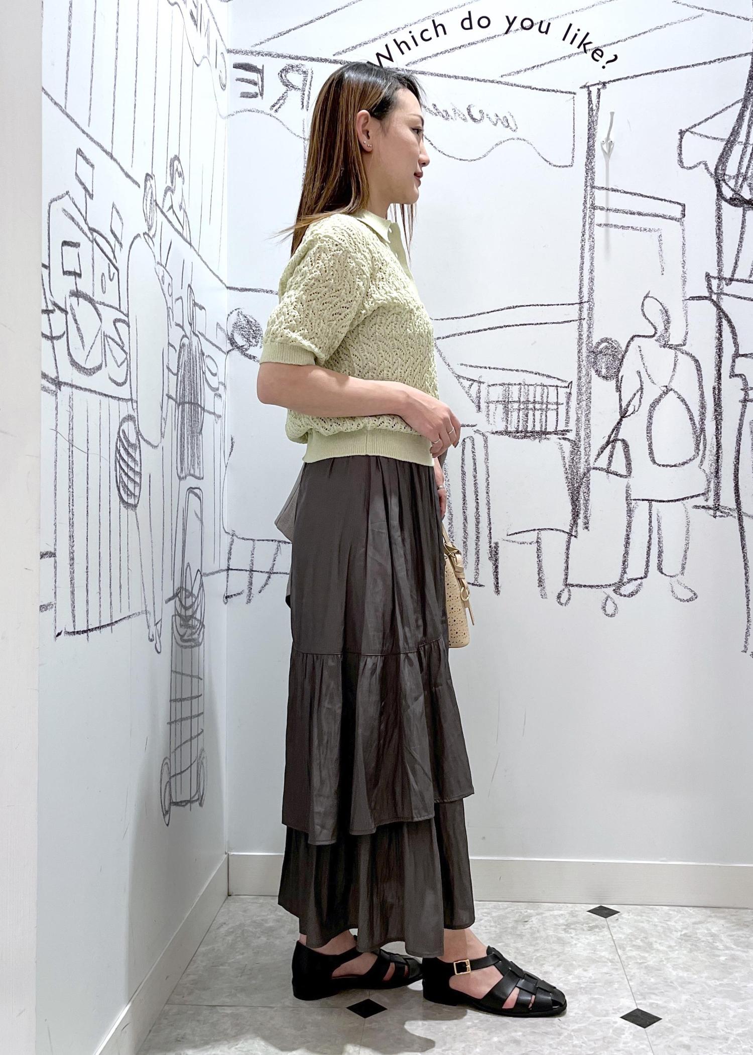 大人可愛いポロニットをティアードスカートと合わせた、大人カジュアルなスタイリング。