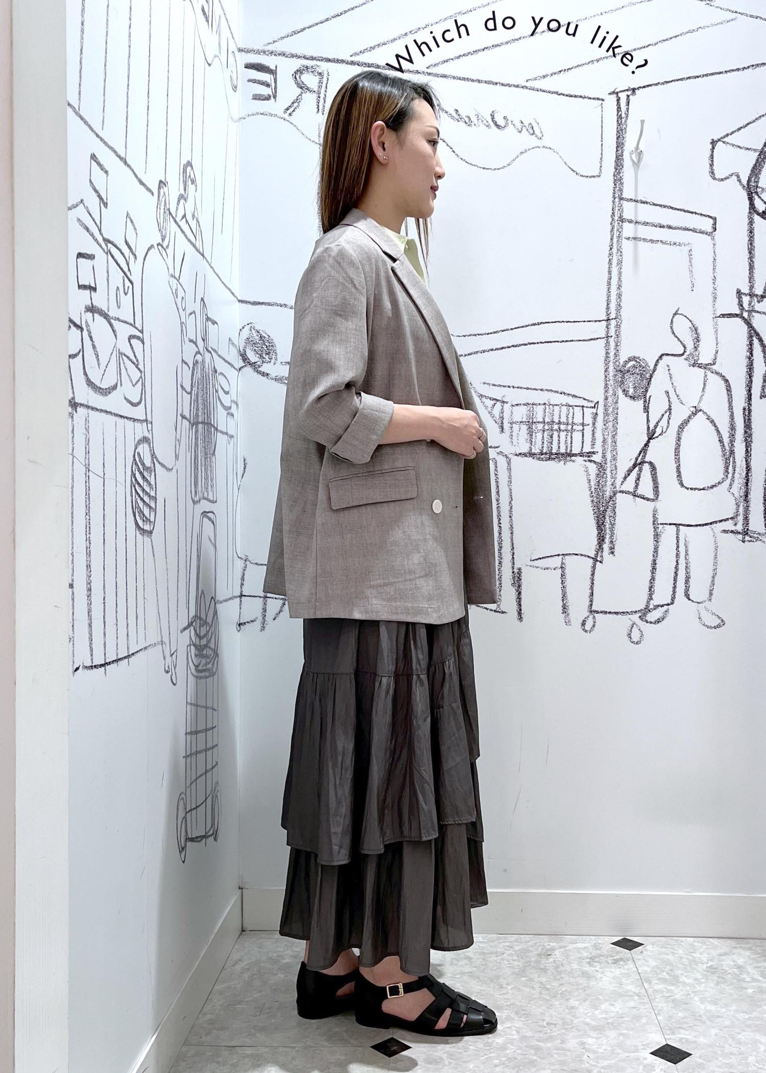 アウターは、オーバーシルエットのジャケットでキレイめカジュアルな印象にコーデしました。