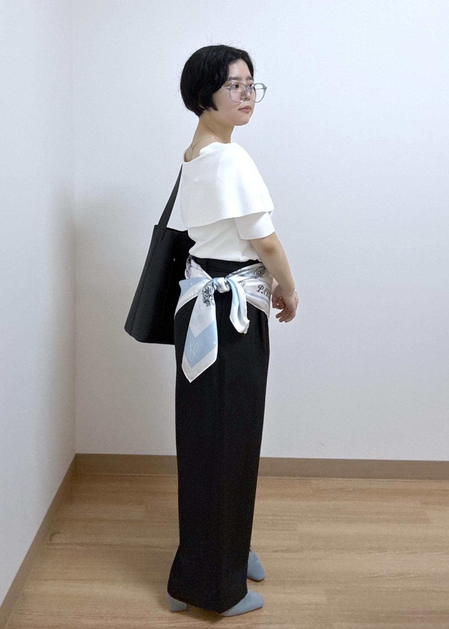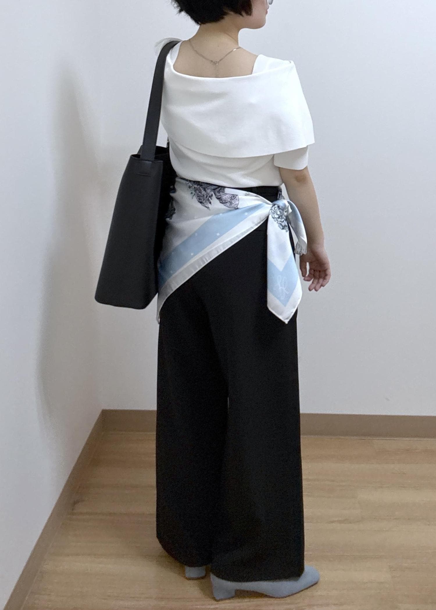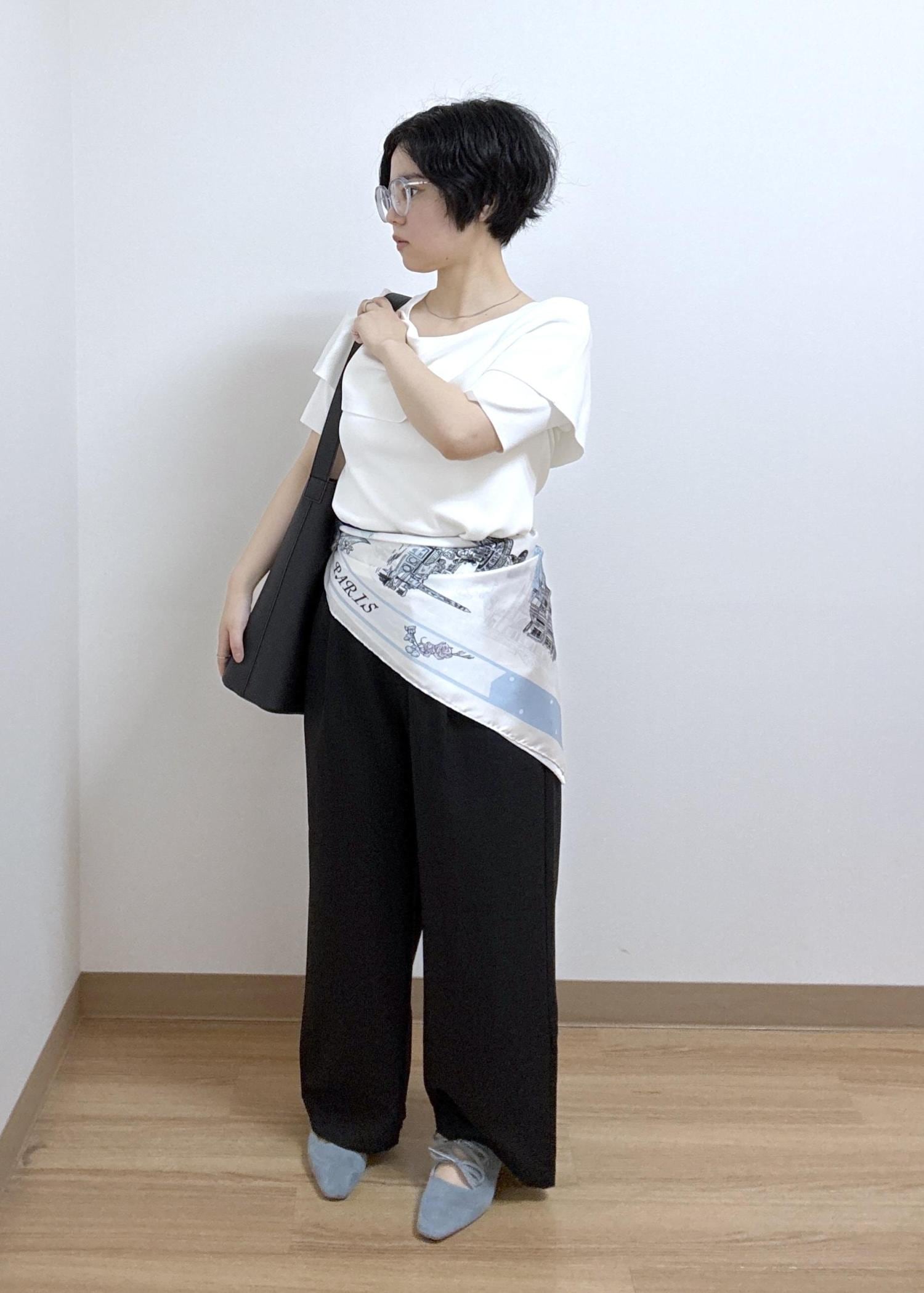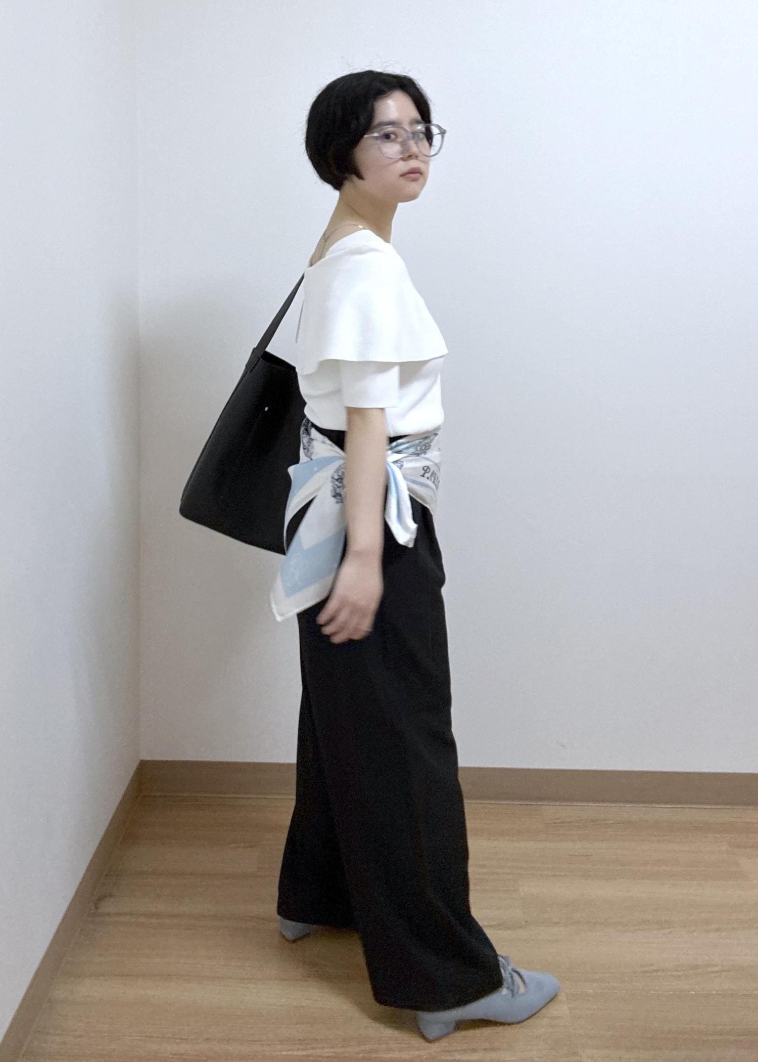 モノトーンコーデをベースにアクセントとして水色のスカーフを取り入れ、初夏にぴったりな爽やかさを意識しました!