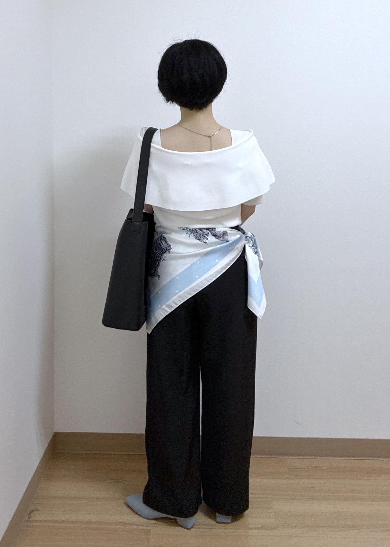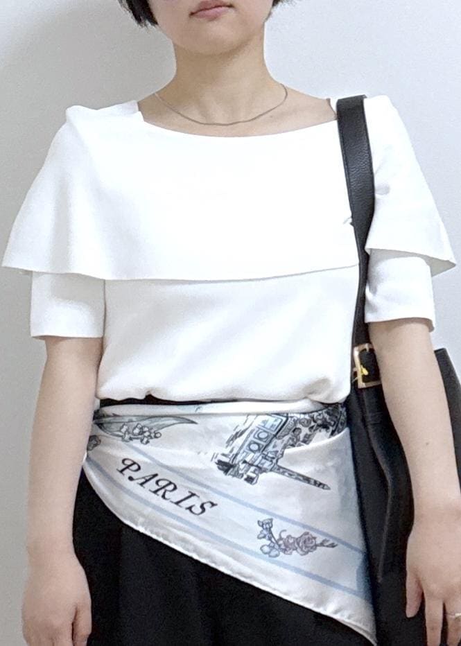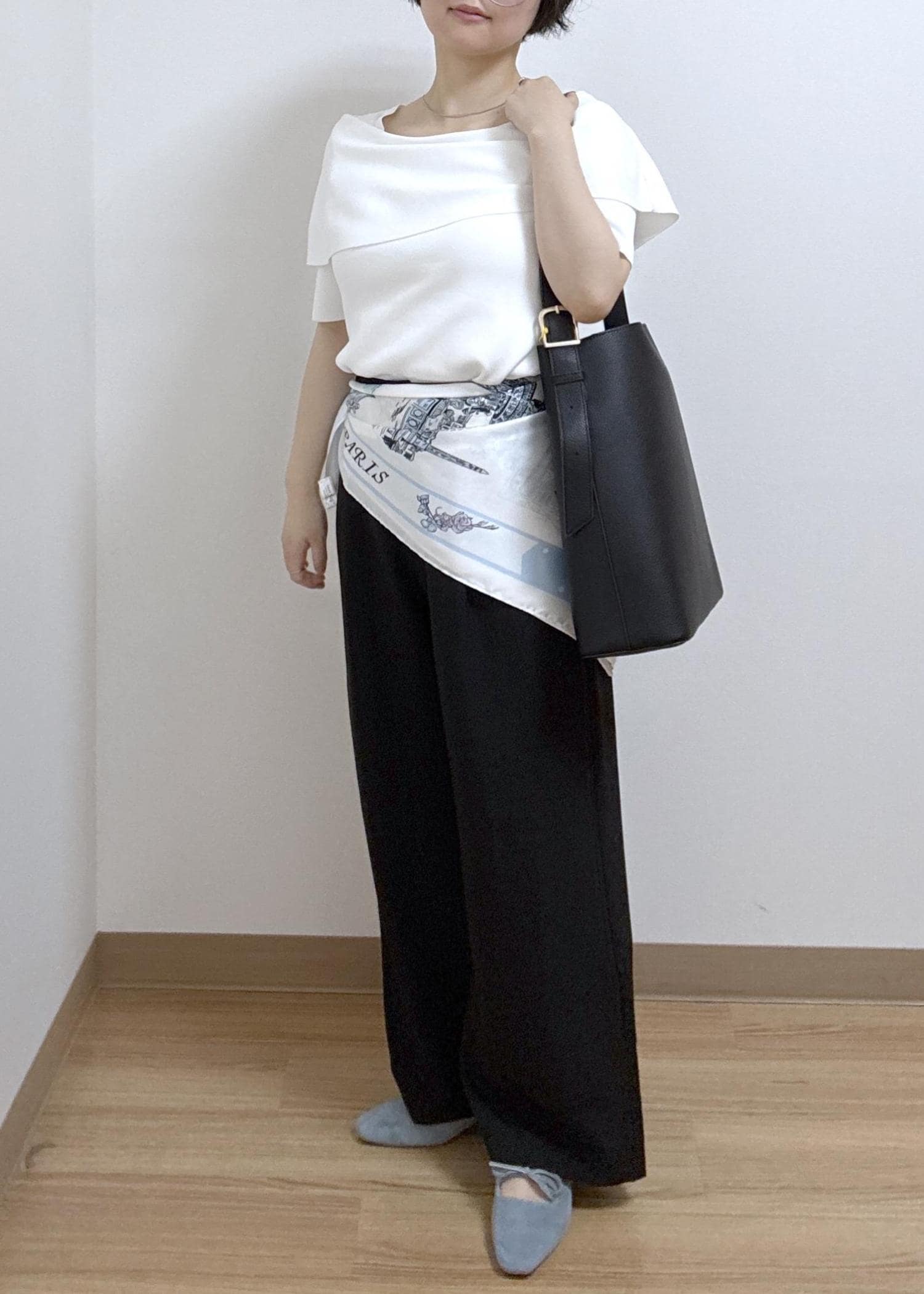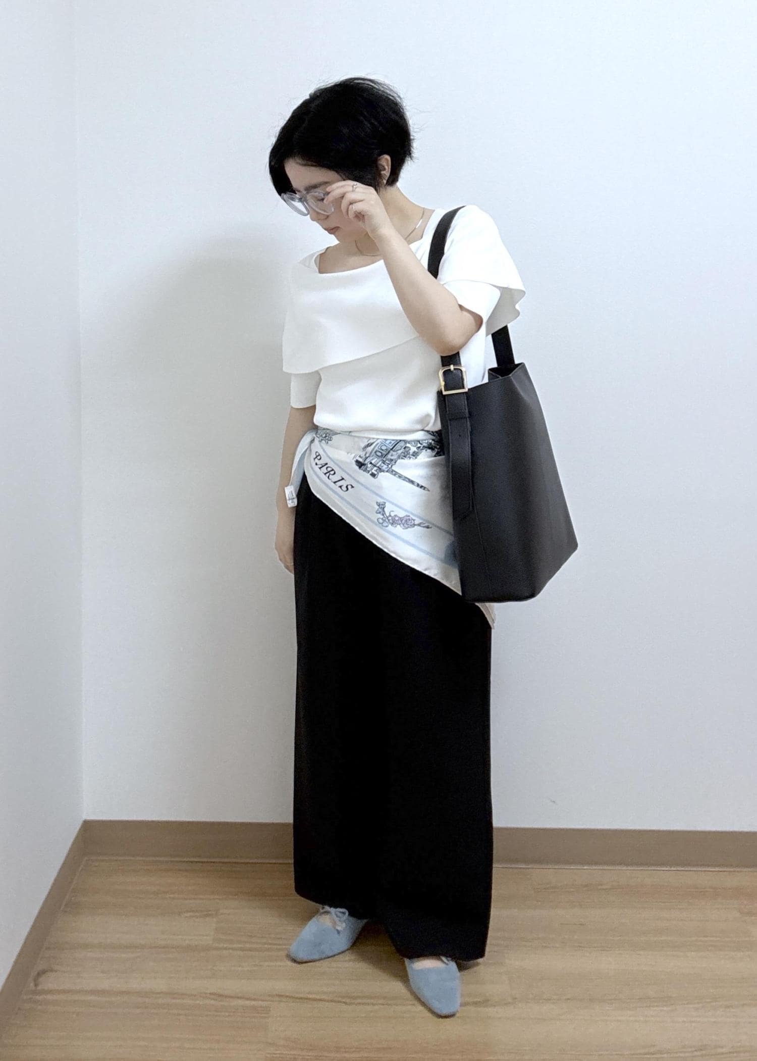 モノトーンコーデをベースにアクセントとして水色のスカーフを取り入れ、初夏にぴったりな爽やかさを意識しました!