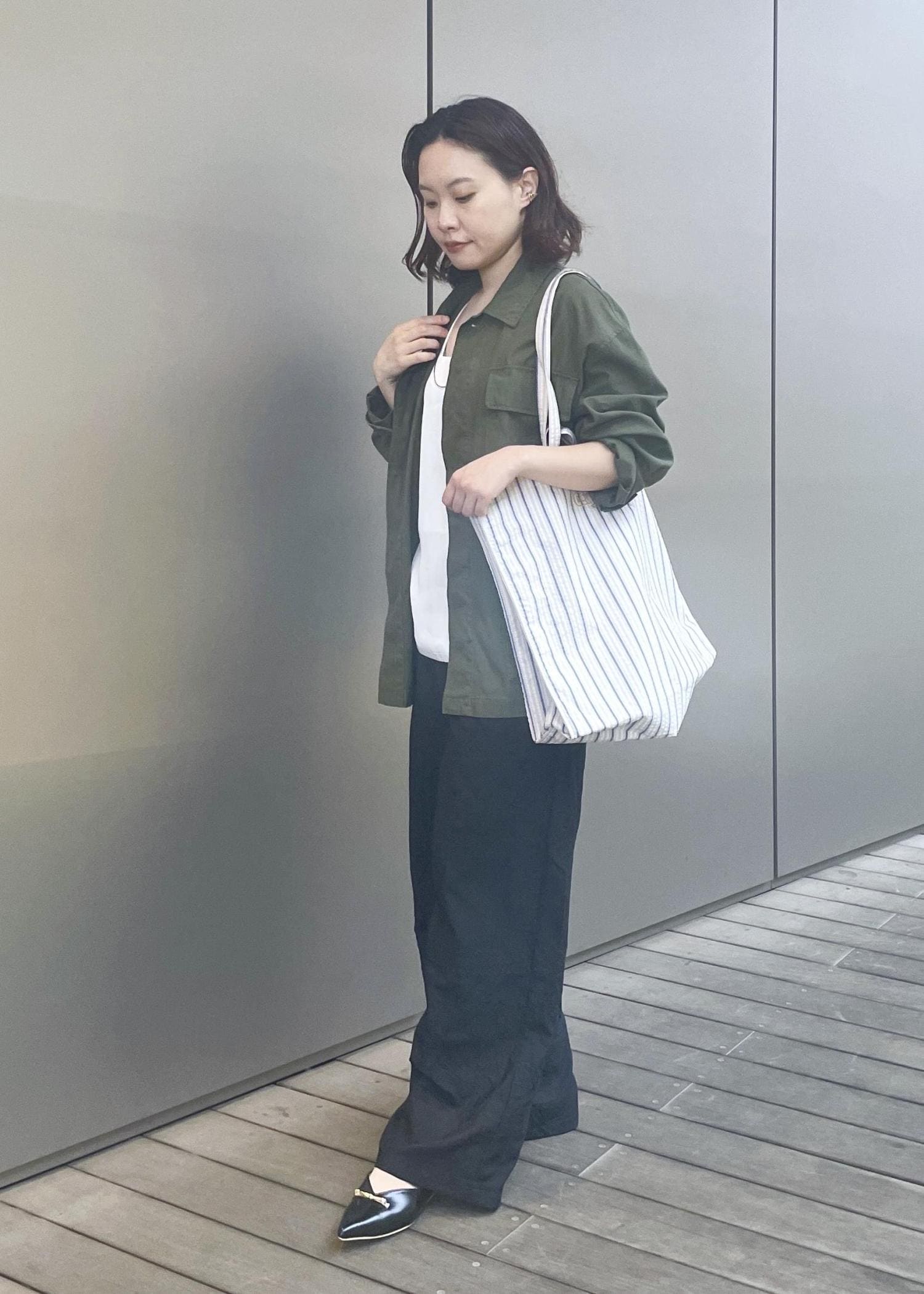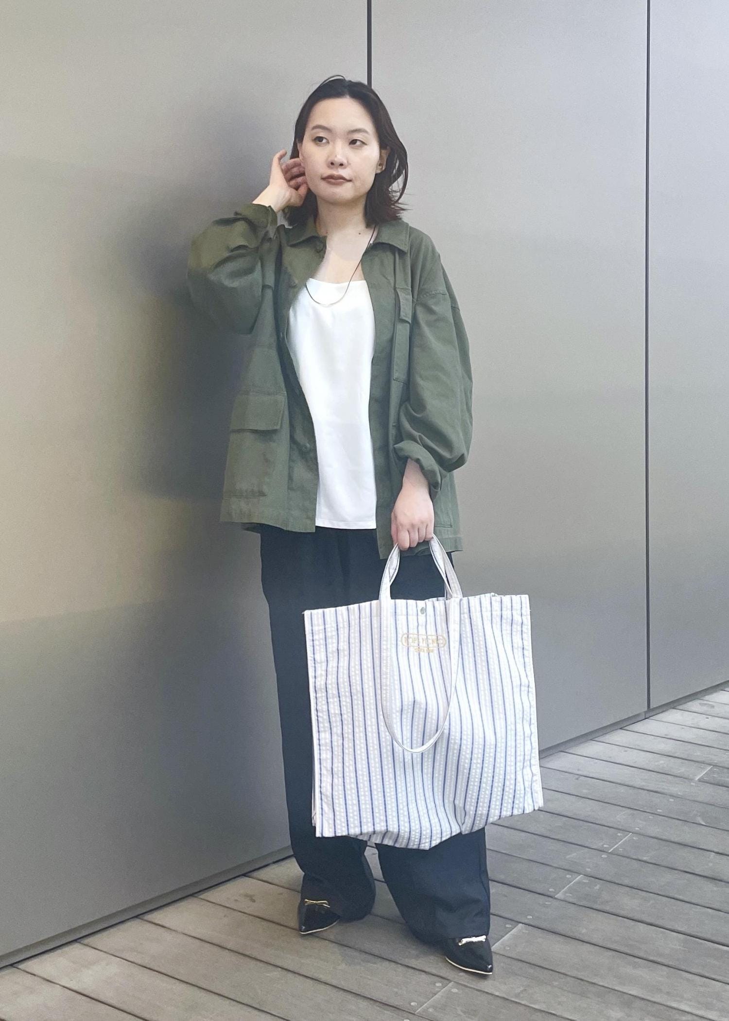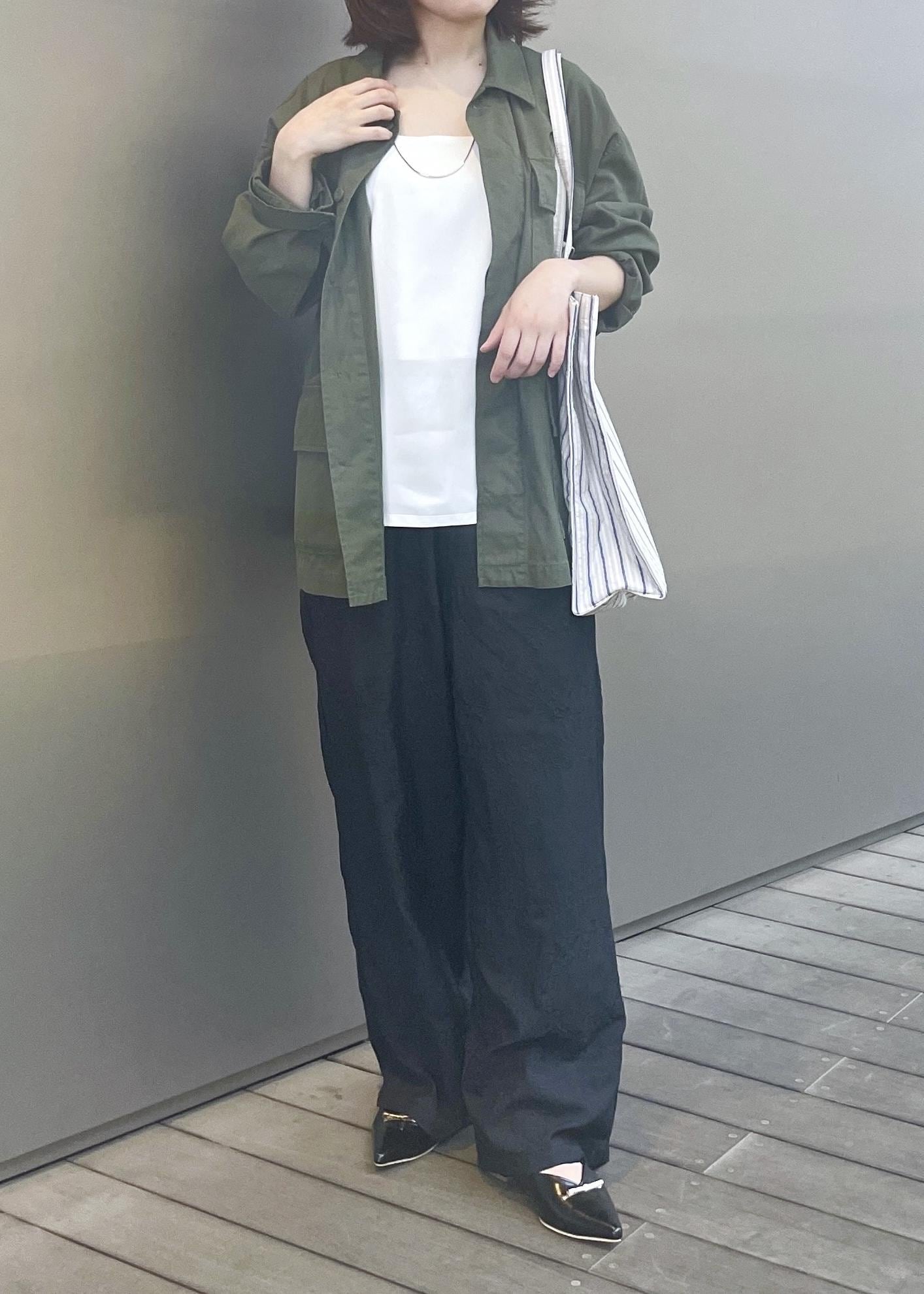 インナーはあえてタンクトップのみにしてカーキのアウターをトップスにしてスタイリングしました。