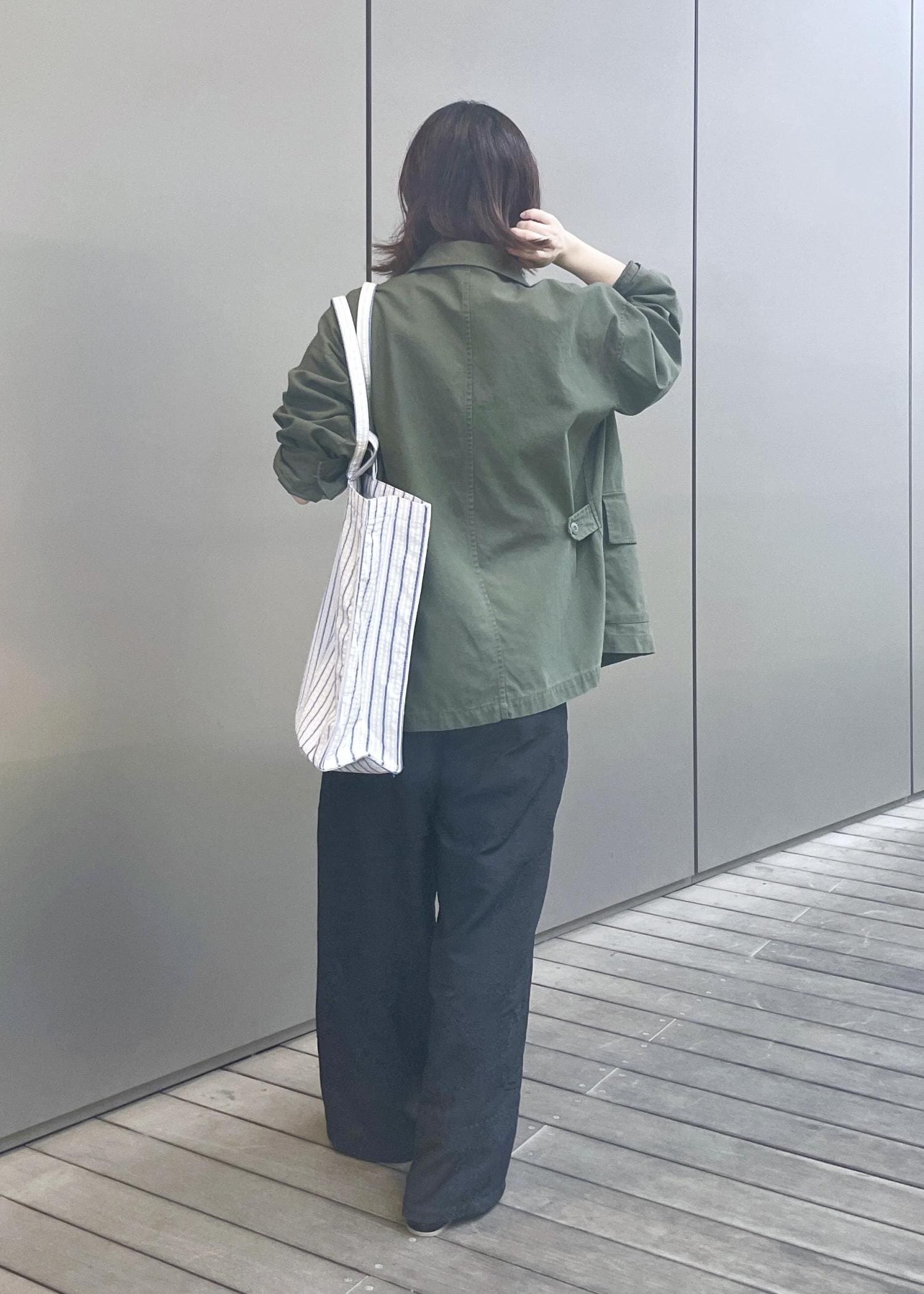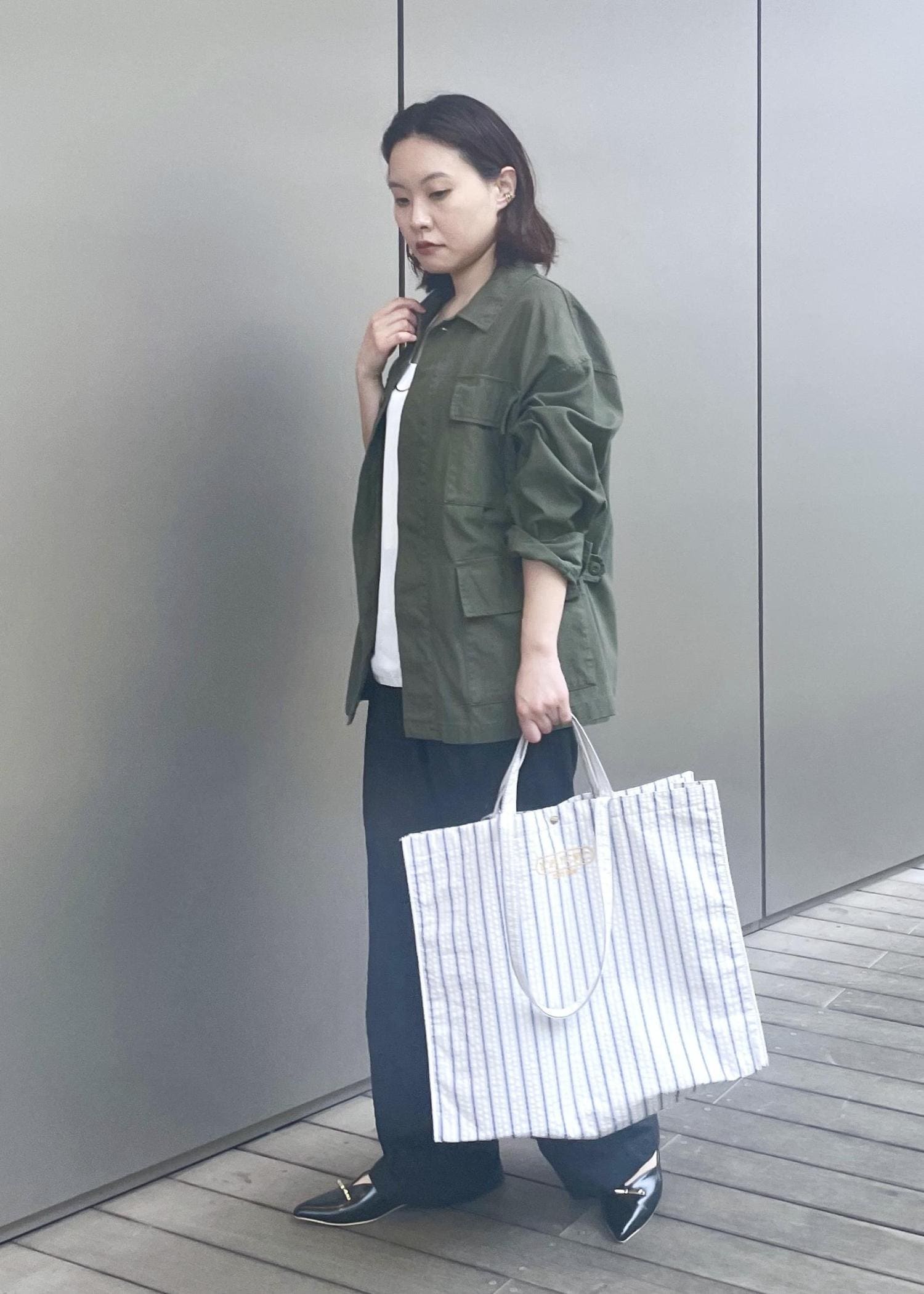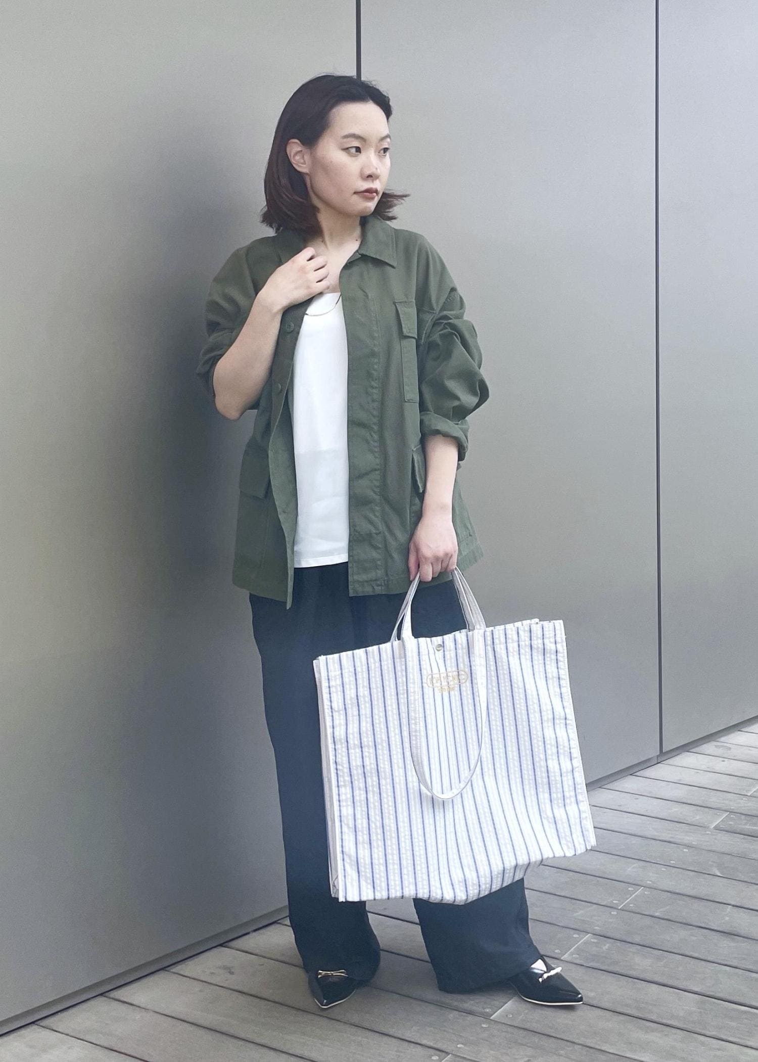 インナーはあえてタンクトップのみにしてカーキのアウターをトップスにしてスタイリングしました。