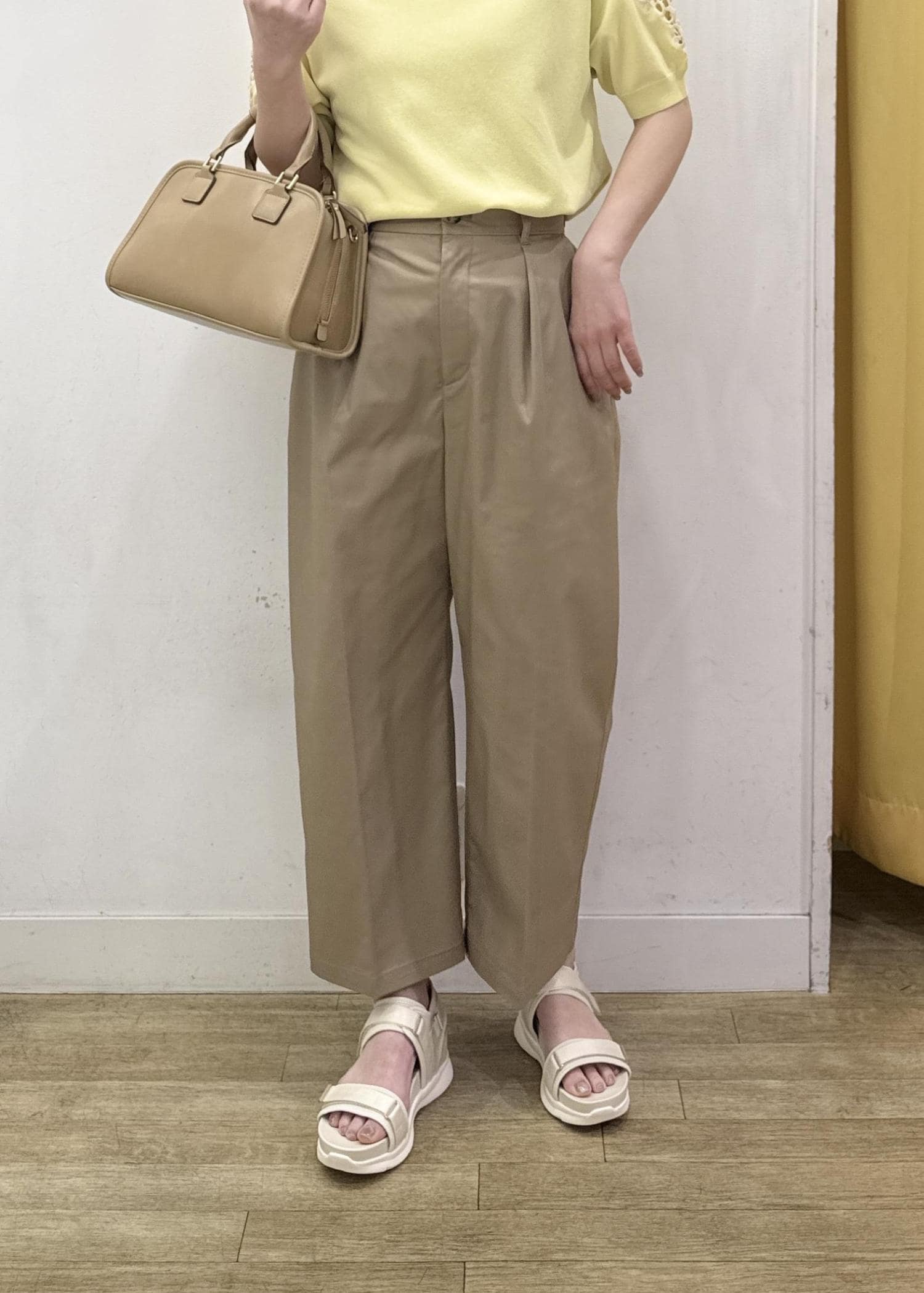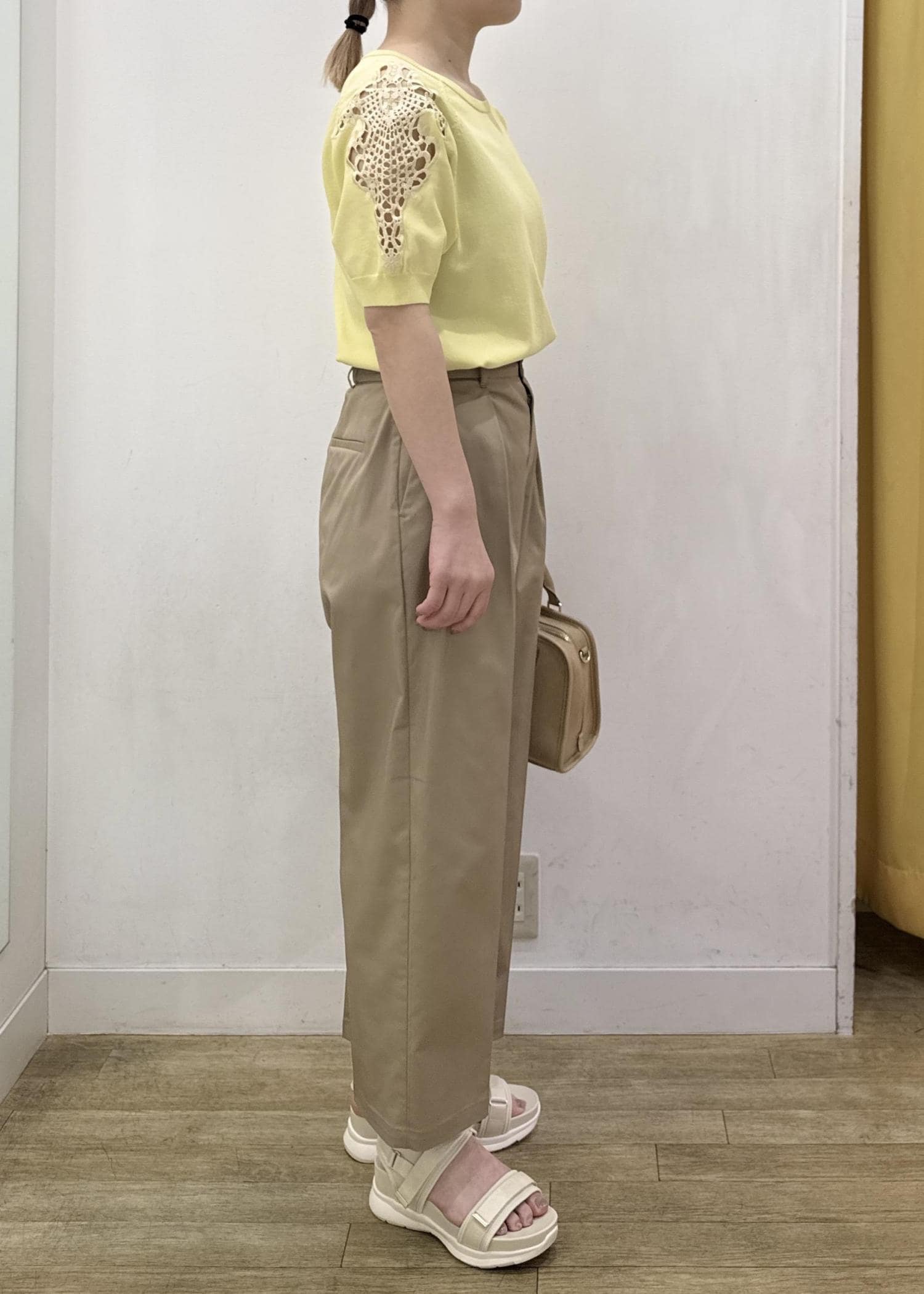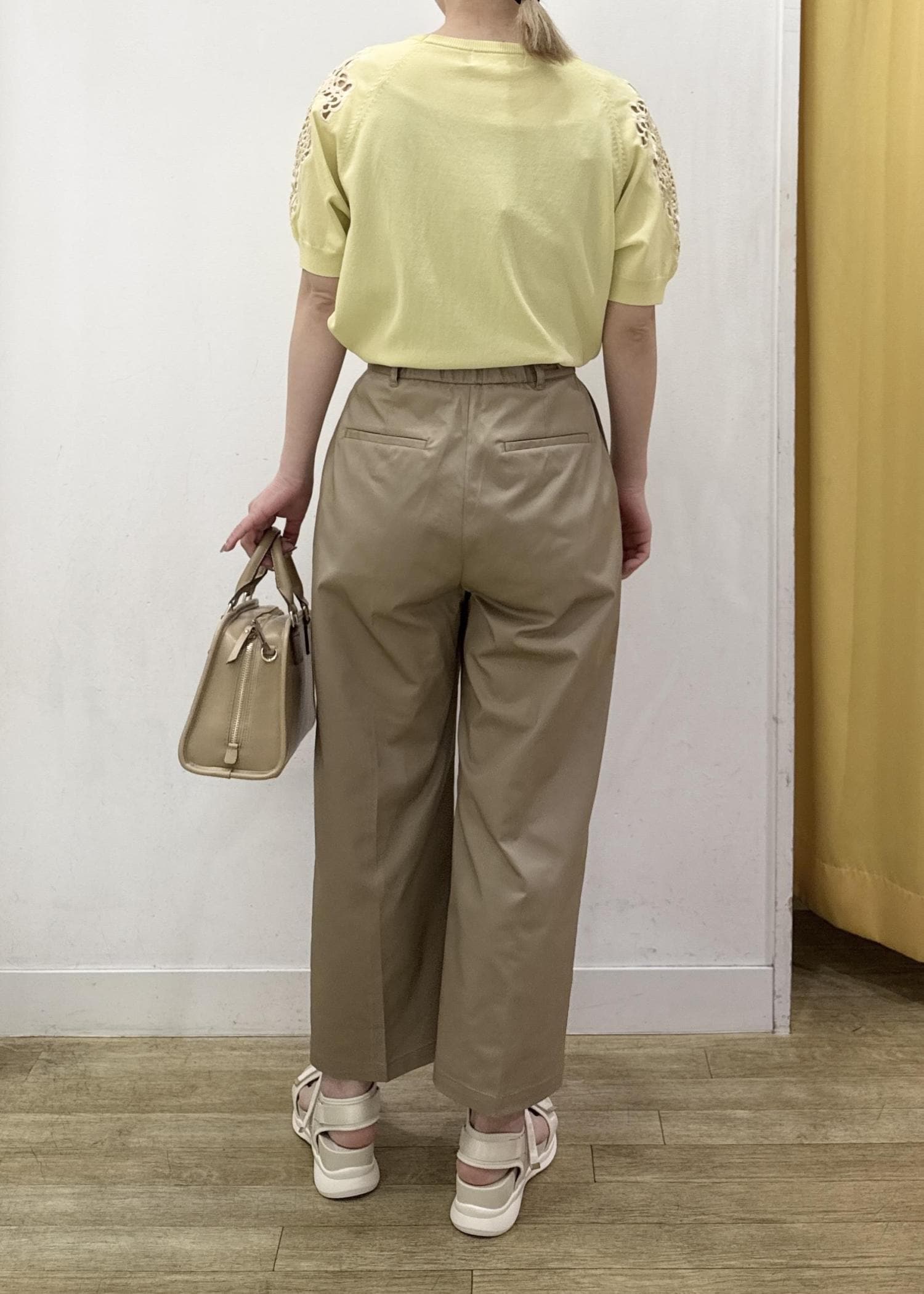 少しハリ感のある素材で、脚のラインを拾わず穿けるシルエットでした。 -