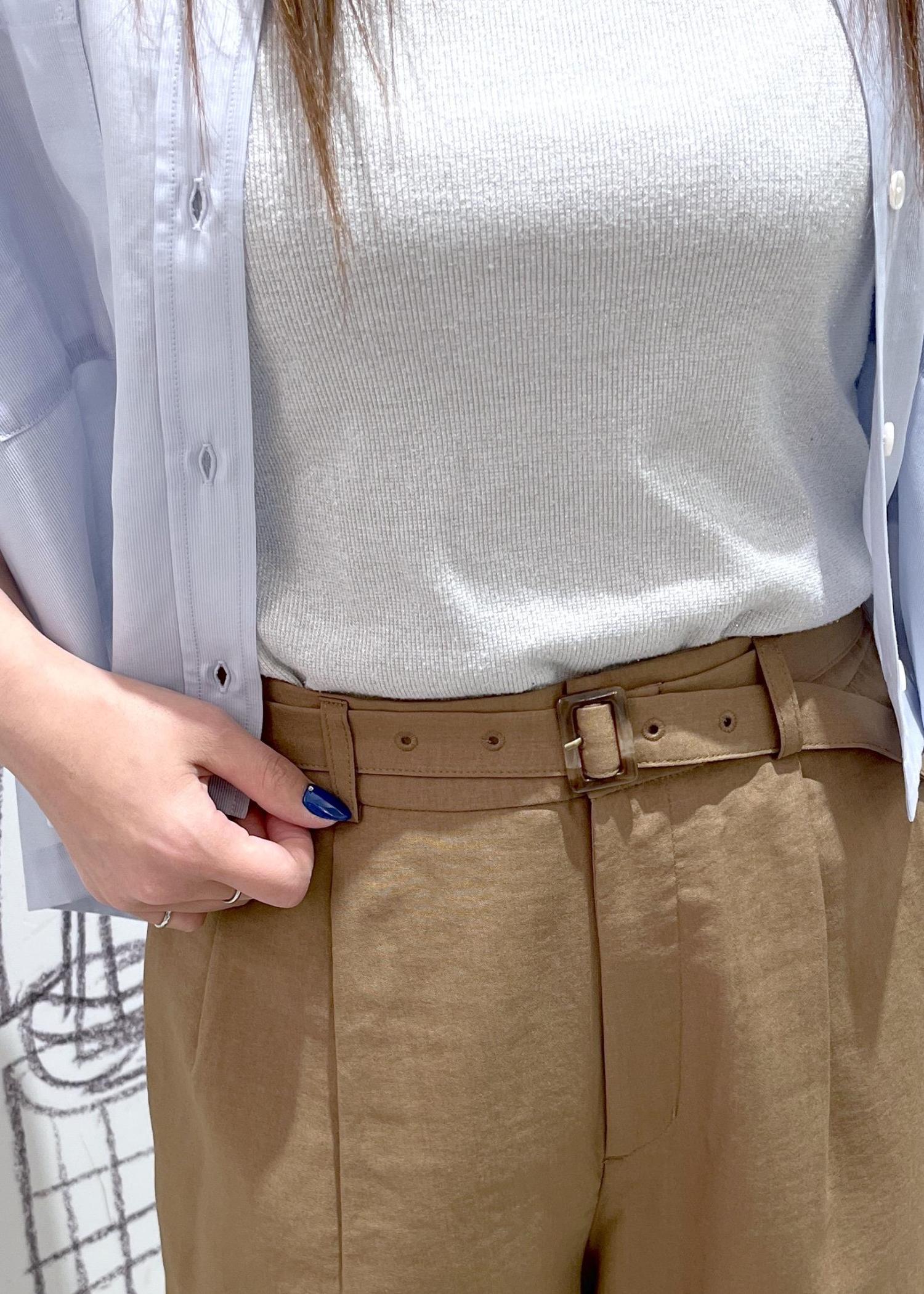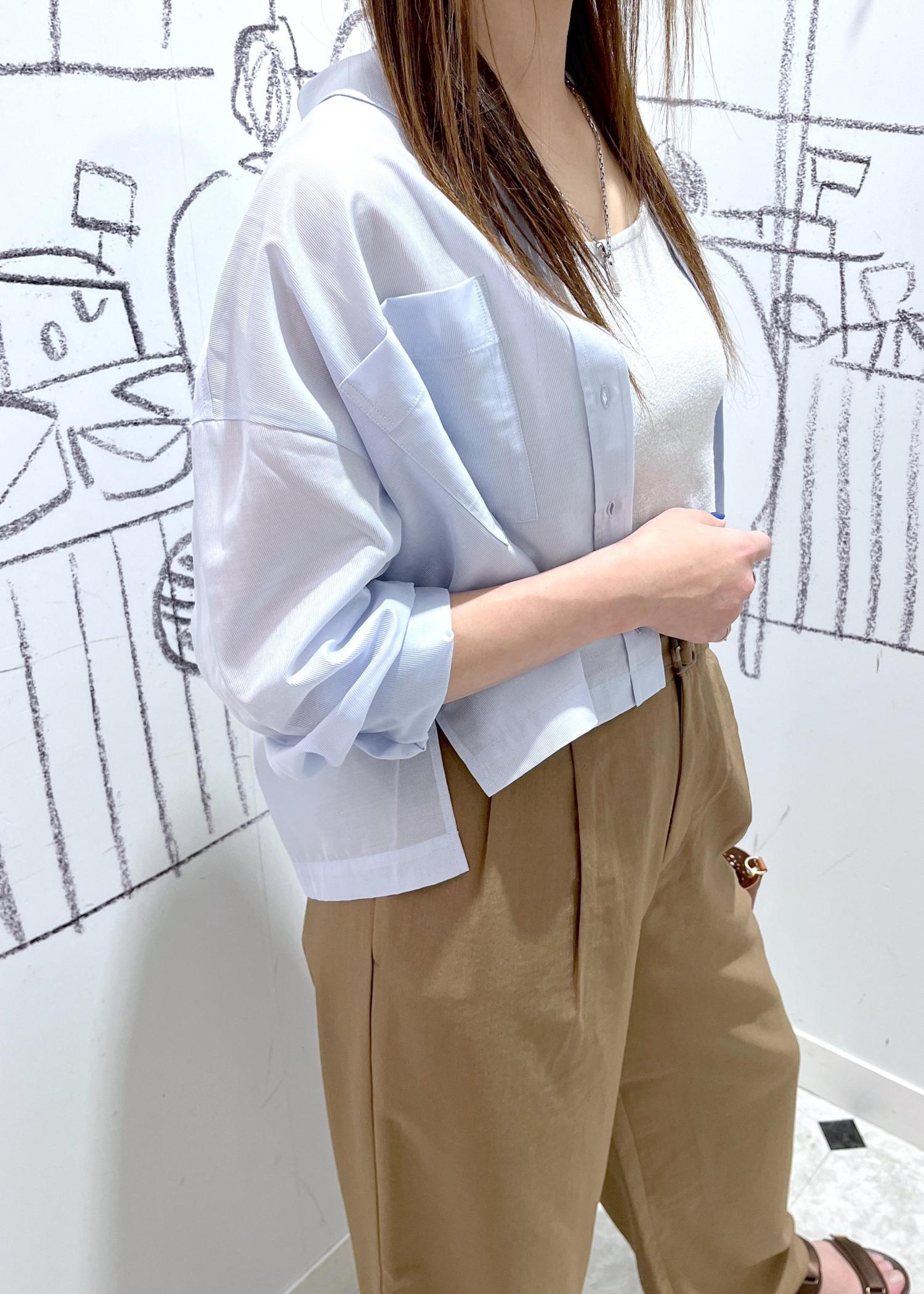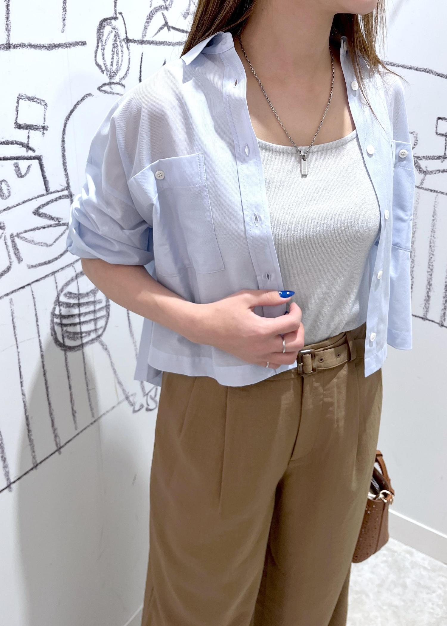 夏らしいリネンライク素材のパンツにすっきり丈のシャツを羽織ったシンプルなコーデ。