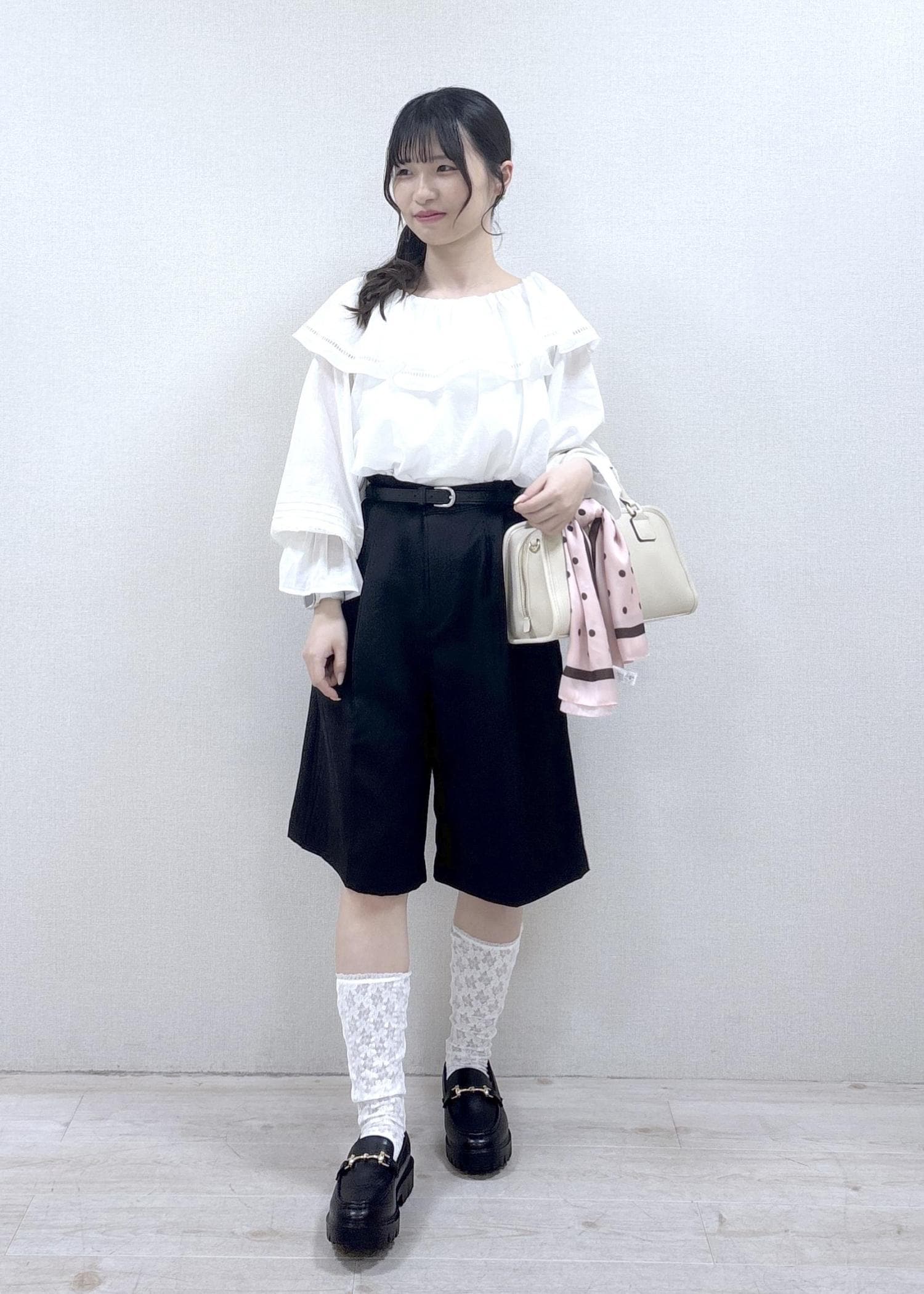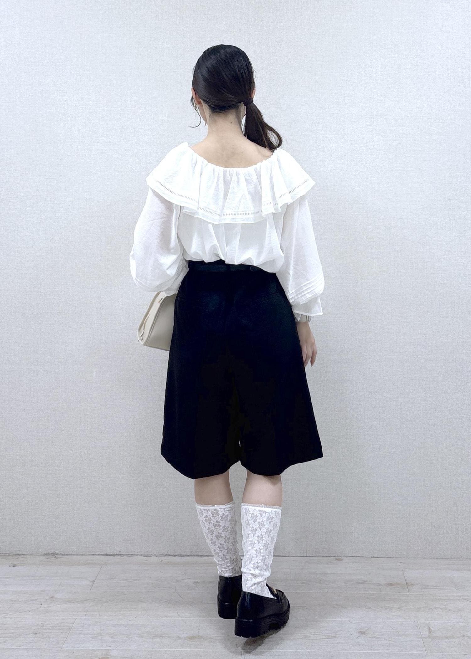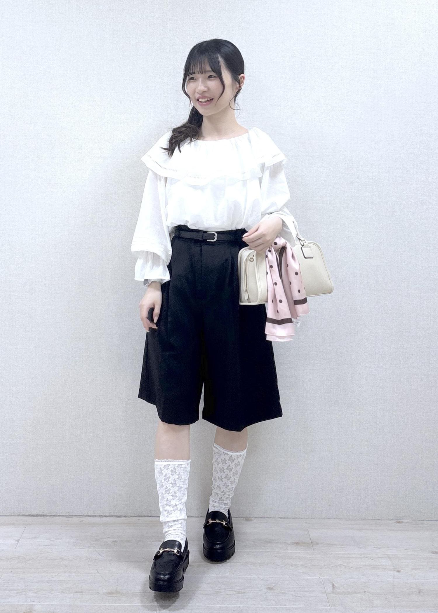 フリル付きのトップスとハーフパンツを使用した甘めコーディネートです。ハーフパンツは丈が長めなので、推し活などで甘めなコーディネートがしたいけれど、ミニ丈は抵抗がある…という方にもオススメです。