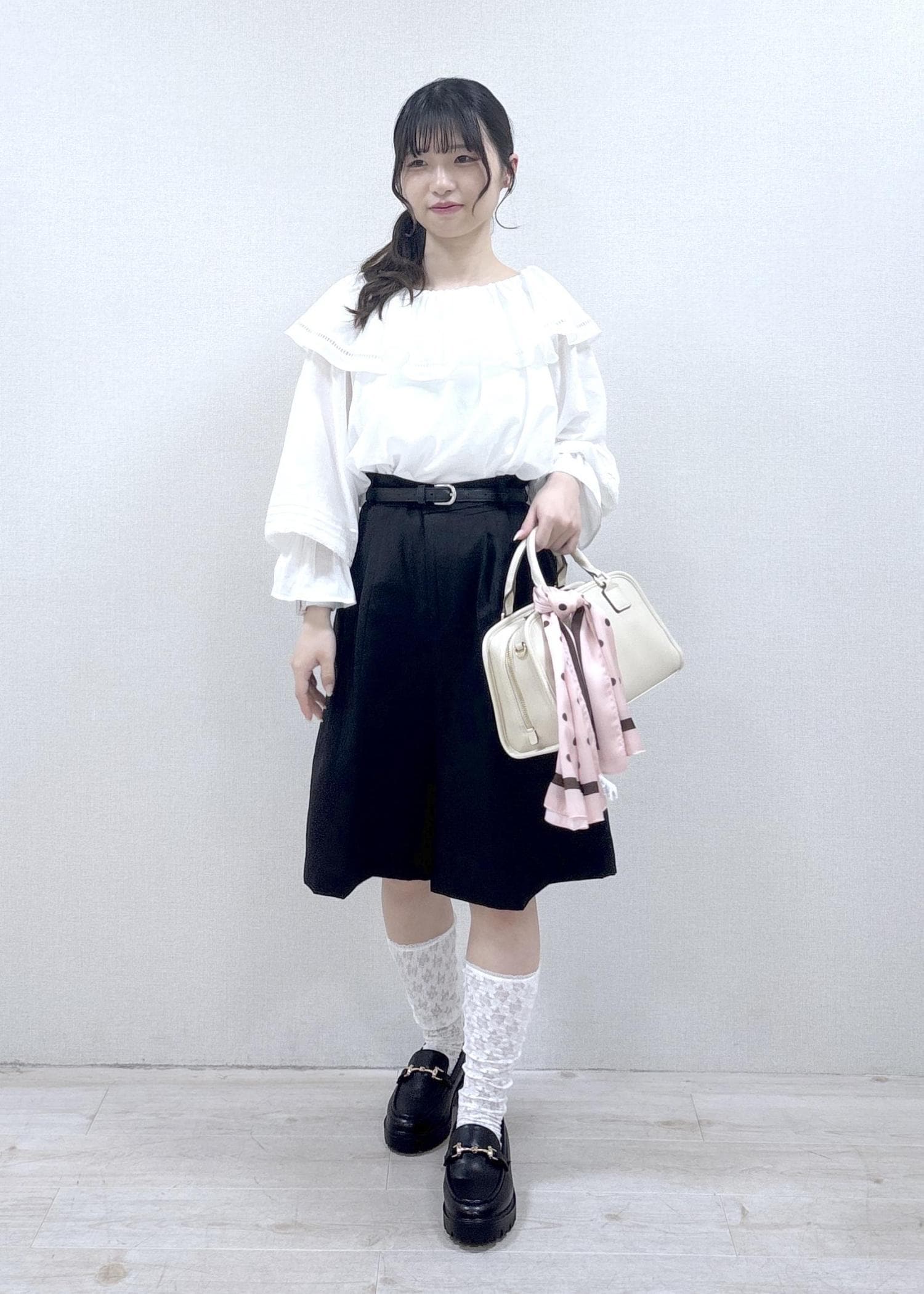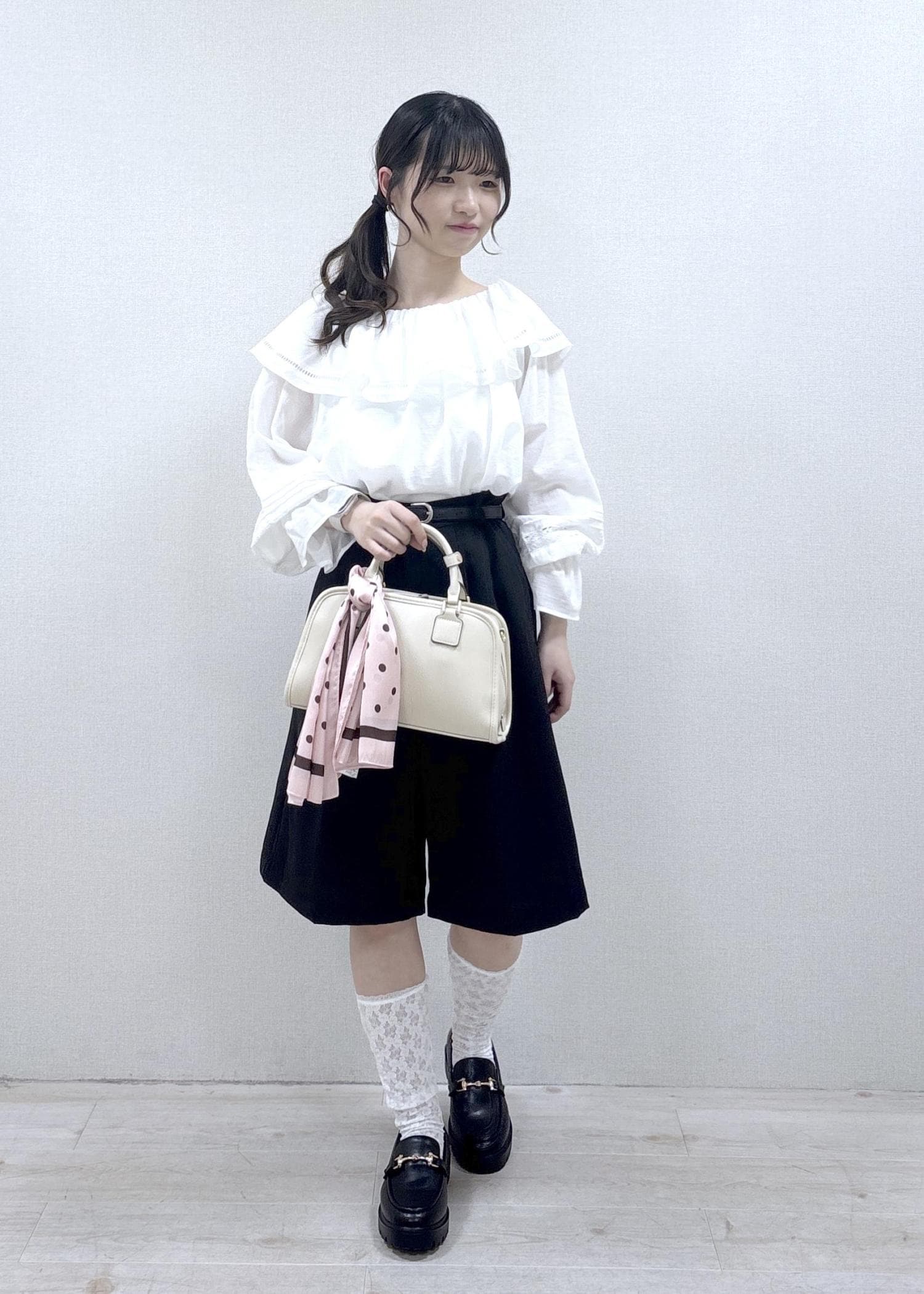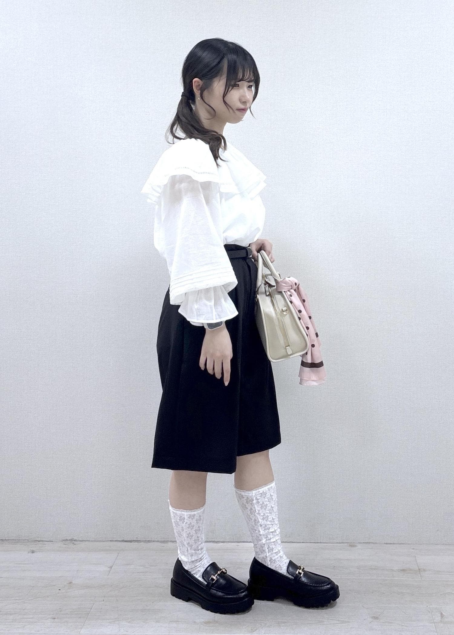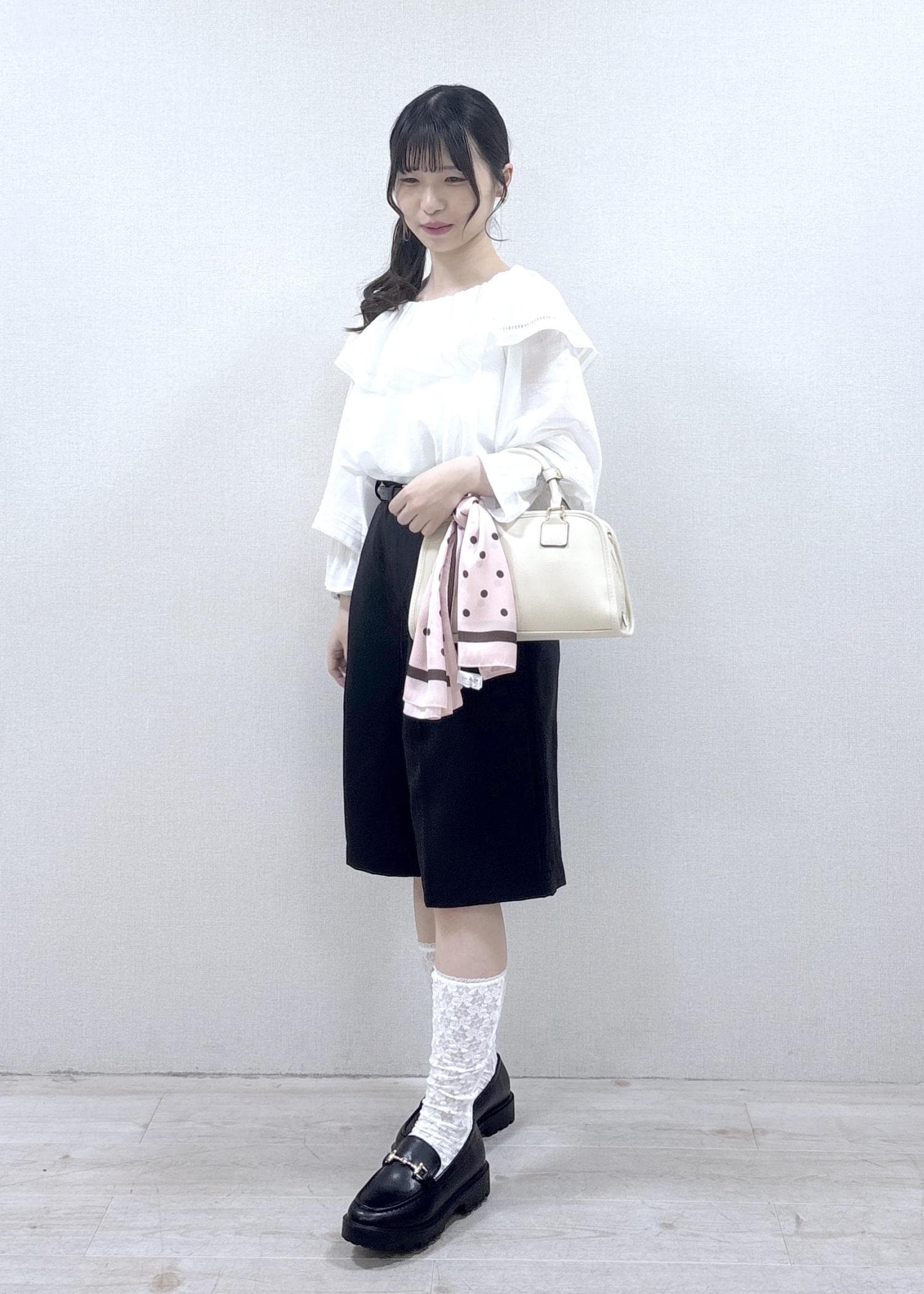 フリル付きのトップスとハーフパンツを使用した甘めコーディネートです。ハーフパンツは丈が長めなので、推し活などで甘めなコーディネートがしたいけれど、ミニ丈は抵抗がある…という方にもオススメです。